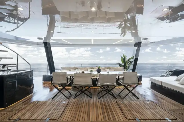 Her expansive deck areas are crafted for leisure and socialising, with a vast main deck aft that flows seamlessly into the main deck lounge, oversized sunpads on the foredeck, and a panoramic flybridge equipped with a wet bar, lounge seating, and sunloungers for all-day relaxation.