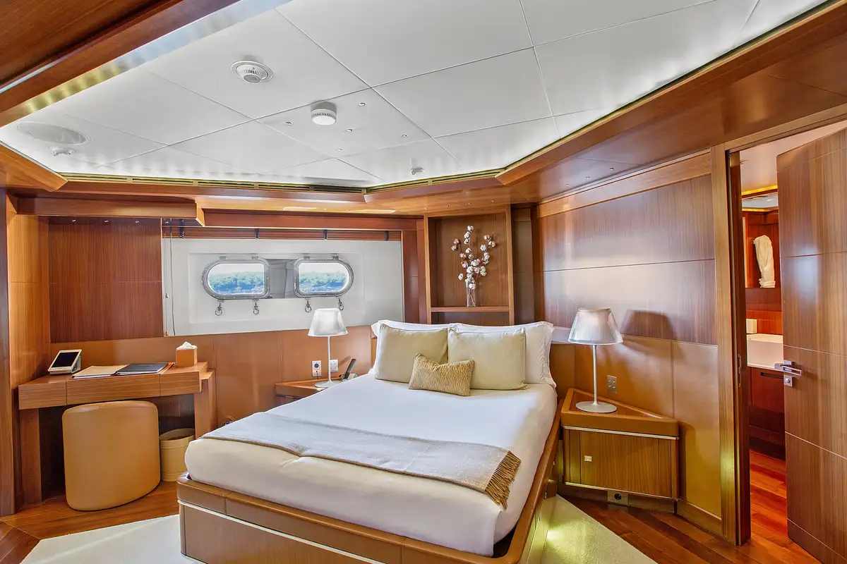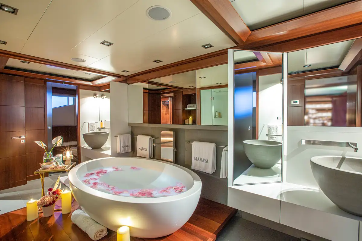Retire to your room to dress for dinner. MARAYA’s master suite is a haven of tranquillity, with its own study and zen-like bathroom as well as the private balcony, which offers the perfect spot for a romantic sundowner. On the lower deck, a VIP suite, two doubles and two twin cabins with pullman berths can be found. Having had a full refresh in 2018, MARAYA’s luxurious interior is wheelchair friendly and features an elevator serving the lower to upper decks; her zero speed stabilisers ensure guests enjoy a calm, roll-free experience at anchor.