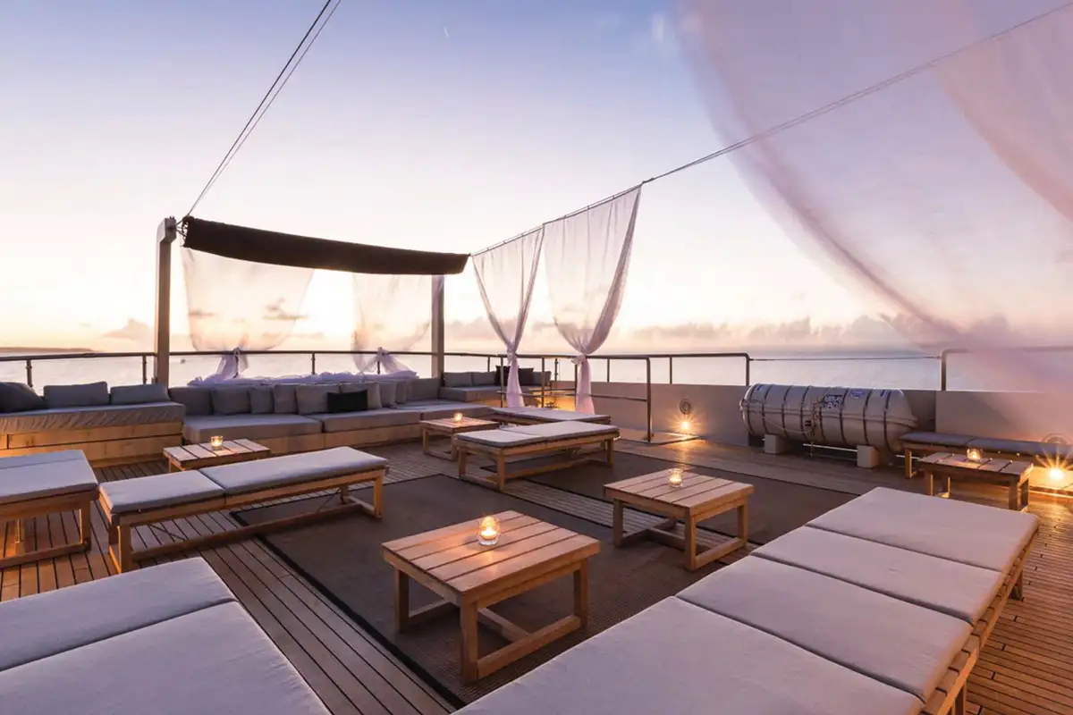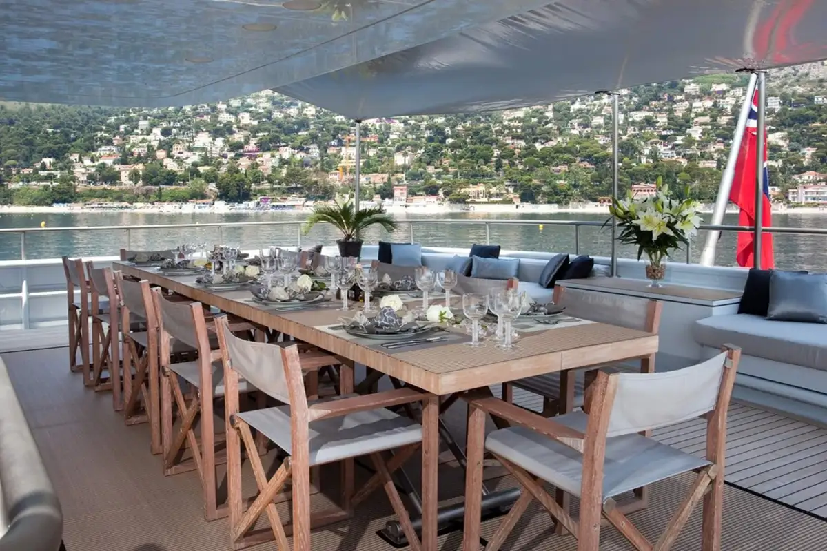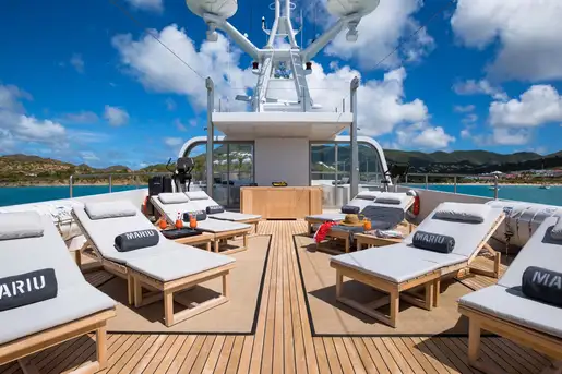 Boarding MARIU from her swim platform, walk up the sweeping steps onto her main deck aft where the crew will greet you with a warm welcome. You won’t want to delay heading up to the large sun deck, with its jacuzzi, loungers and sit-up bar. Spend some time here acclimatising to life on board, soaking up the sun before taking a tour of the yacht. Note the enormous dining tables that sit beneath canopies for cool shade – the perfect spot for al fresco lunch. Enjoy fresh cuisine with Mediterranean and Asian influences prepared by the talented Italian chef, before relaxing on the upper deck beneath the shade of an awning.
