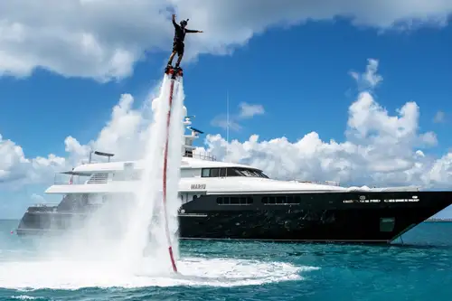 Come the afternoon and MARIU will display another of her strengths, offering a myriad selection of watersports for all capabilities. As an RYA approved training centre for personal watercraft, guests can gain a temporary license to ride the jetskis and waverunners for the duration of the yacht charter. The yacht’s toy box is also bursting at the seams with SeaBobs, a hoverboard, scuba diving equipment and all manner of towable toys to amuse yourself in the waters around the yacht.