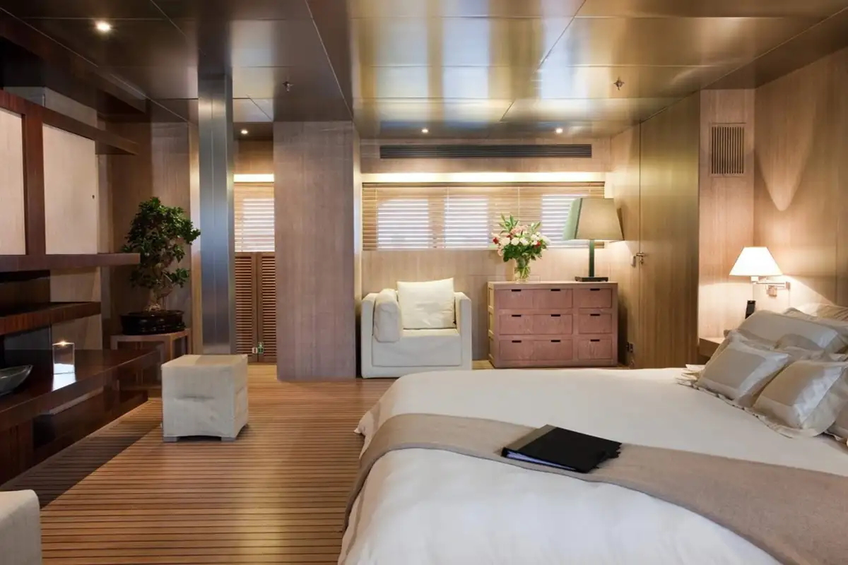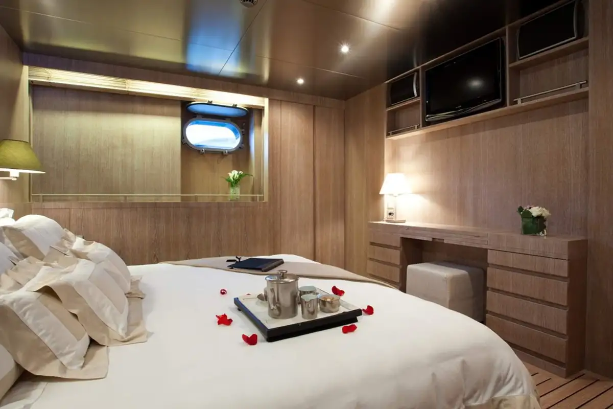 Dinner can be served al fresco on the bridge deck or main deck aft or, should the weather demand it, in the formal dining lounge. An elevator connects all four decks, so elderly guests and perhaps those who have exhausted themselves with the watersports can retire to one of MARIU’s sumptuous cabins without taking the stairs. With a full beam master and a double cabin on the main deck, and four further doubles on the lower deck, guests will be ensconced in luxury 24/7.
