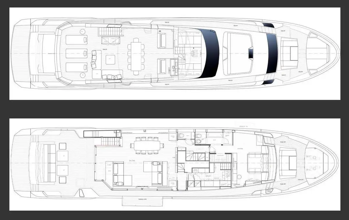 On deck, the sprawling sundeck has an al fresco lounge area with a wet bar conveniently close by. Ahead of this is the wonderful al fresco dining area, perfect for soirees, snacks and sumptuous dining experiences. Ahead of the flybridge helm position is a huge forward sunbathing space, steps to port lead down to a secluded forward seating and sunpad area.