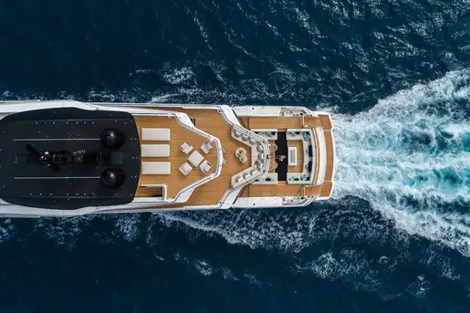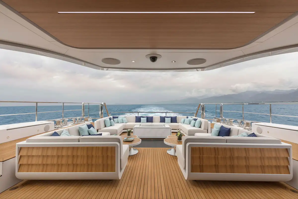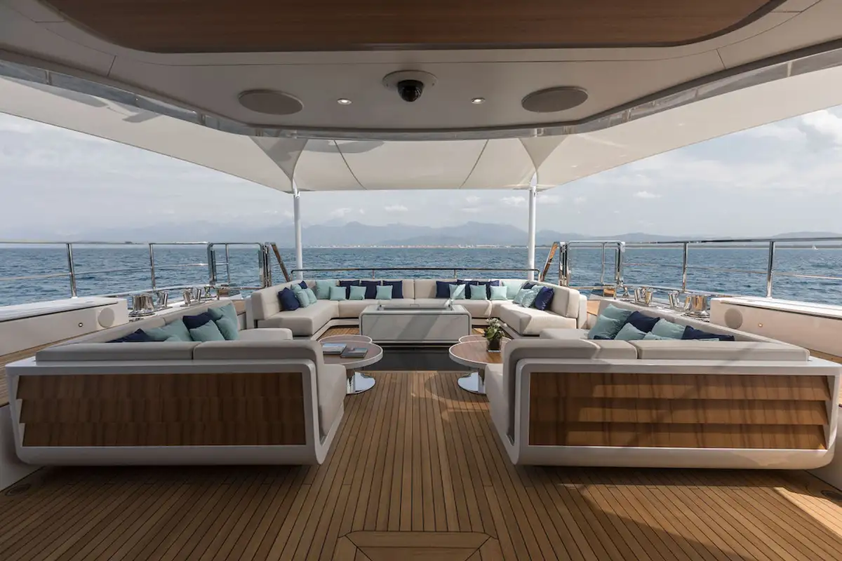 The lounge is modern and stylish; dark oak and high-gloss Makassar ebony create an amazing space; the room fills with light. A fold-down TV is found in the ceiling opposite the large L-shaped sofa to keep the views unobstructed. On the deck above is the sky lounge. Picture windows on both sides enhance your view from the bar and lounge area and, to the rear, floor-to-ceiling glazing opens to access the al fresco formal dining area on the upper aft deck.