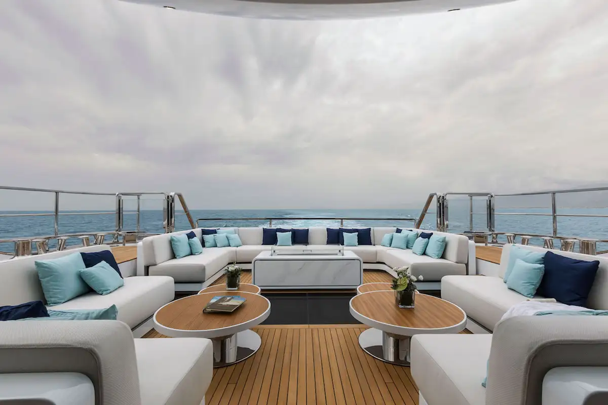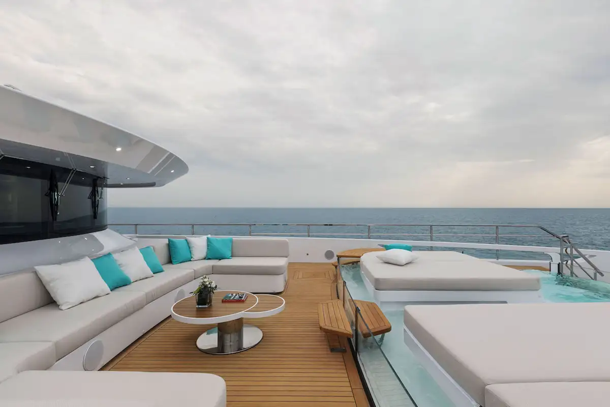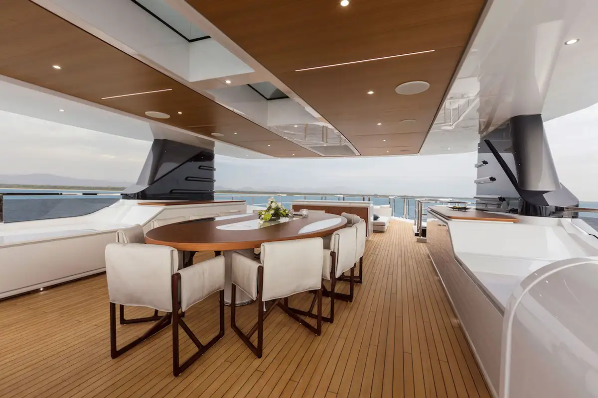 Dining is a highlight on any charter, and with three dedicated dining areas, it is on board MAVERICK, too. The formal dining area in the main lounge is perfect for birthdays and banquets. With views and air-conditioned comfort, nothing will interrupt your special occasion. The upper aft deck is a favourite for breakfast; gather in the sky lounge and proceed to a wonderful breakfast spread or buffet. For lunch, the sun deck beckons. The al fresco dining area is between the jacuzzi and the al fresco lounge area to the rear. Some guests might not leave the sundeck; after all, with exercise equipment and an outdoor cinema, this deck offers so much.