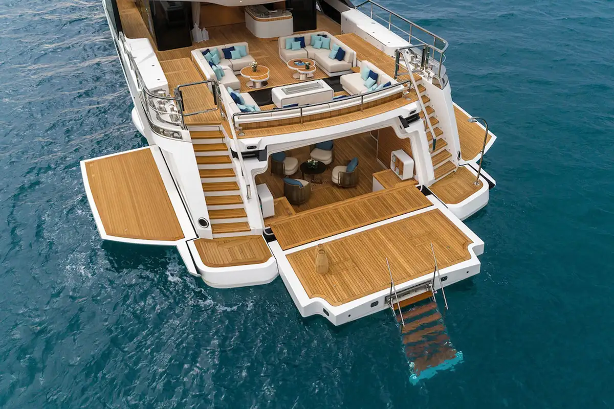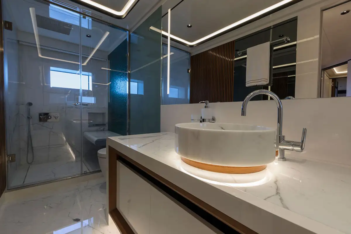 The wonderful main deck master suite is accessed via a private office, and once in your suite, you can unwind. The suite stretches across the hull, and with no decks outboard, privacy is guaranteed. You can relax in the suite’s lounge area or freshen up in the his and hers en suite bathroom.