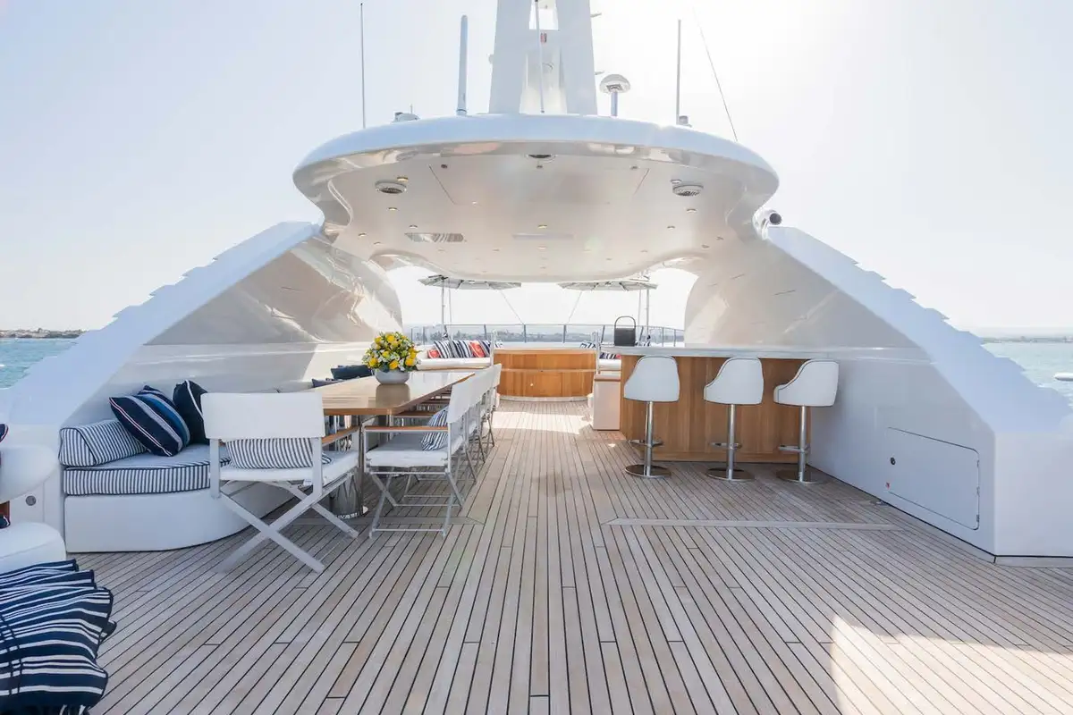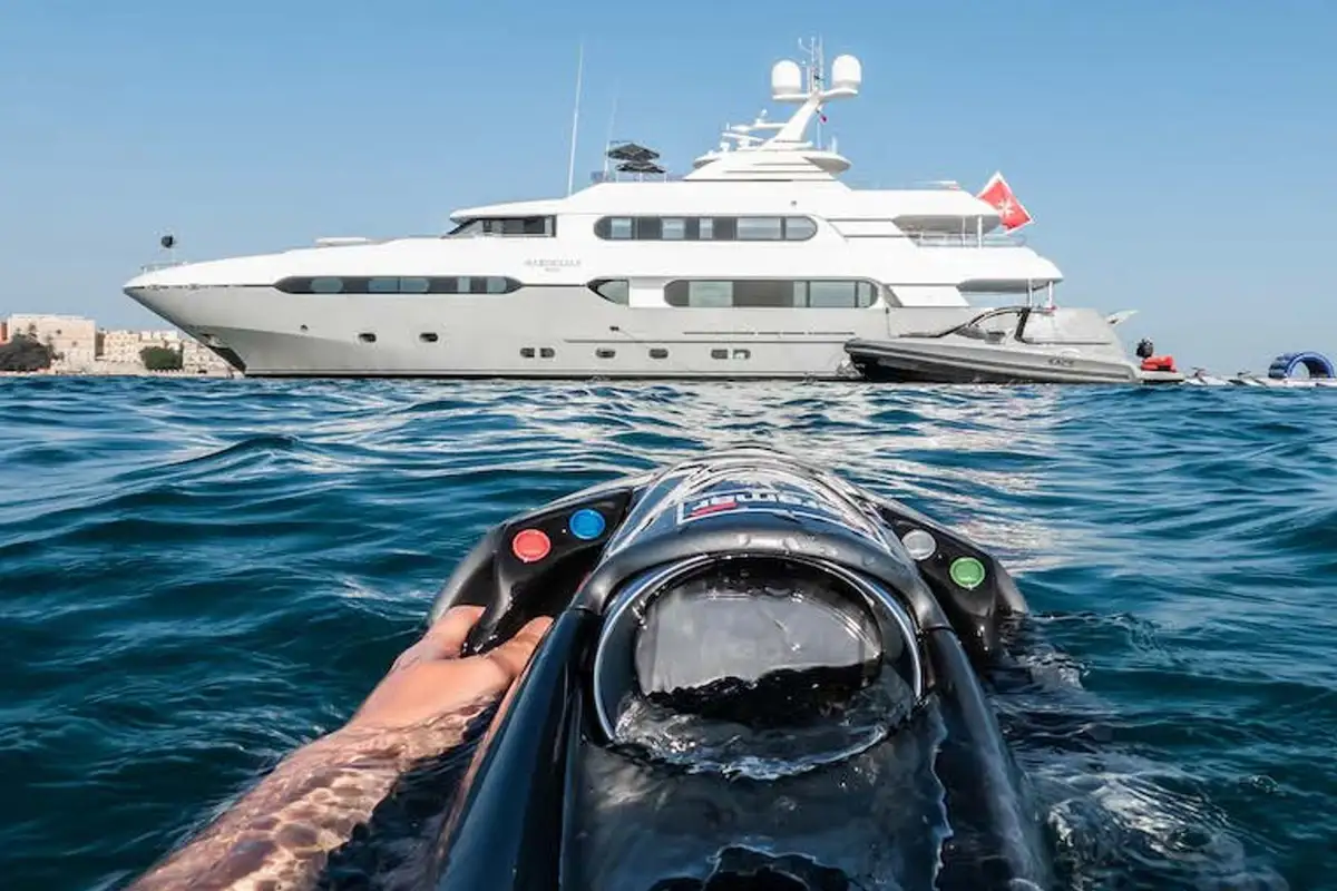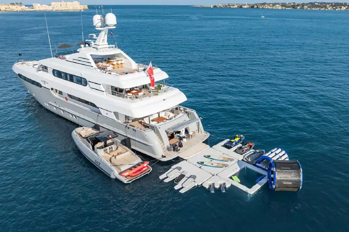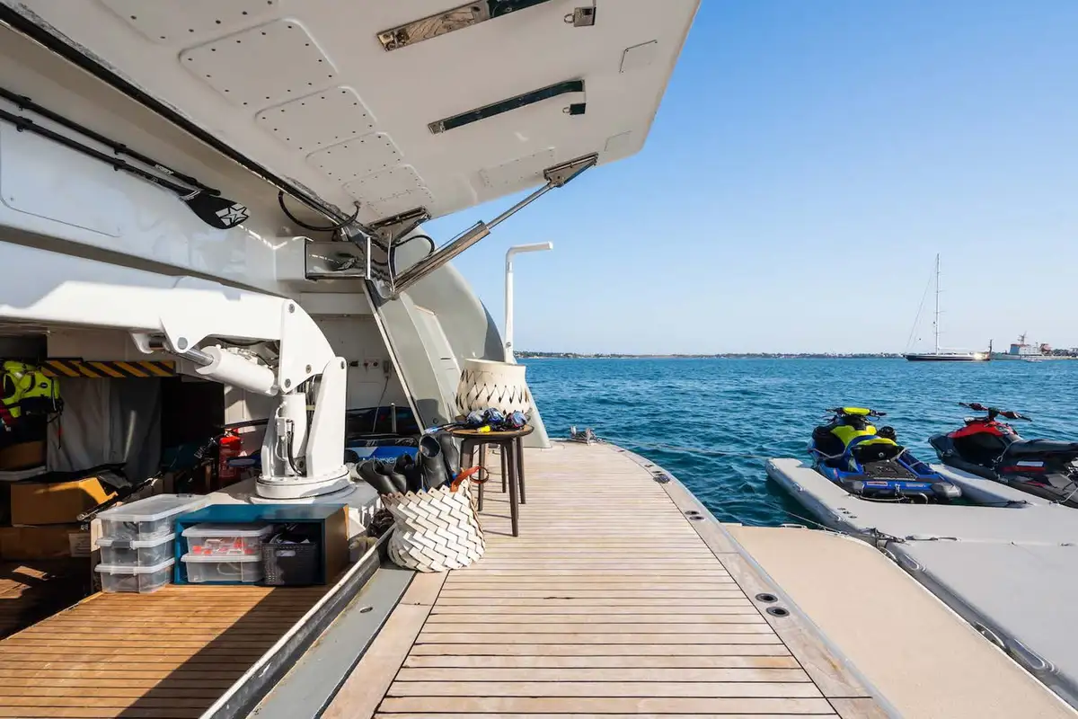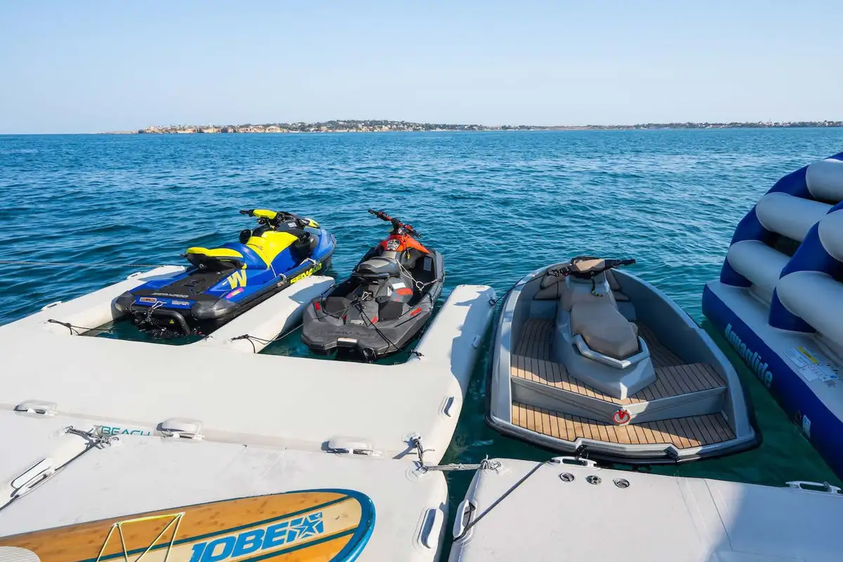 She comes with a 12m (40ft) chase boat and two smaller, waterjet-propelled tenders plus an excellent selection of watersports equipment and toys. The aqua park will keep younger members of your group entertained for hours and includes a safe seawater swimming pool. You’ll also have jetskis, SeaBobs, electric wakeboards, foil boards and a jet board, a full beach setup, kayaks, paddleboards, inflatable tows, plus fishing, snorkelling and waterski gear.