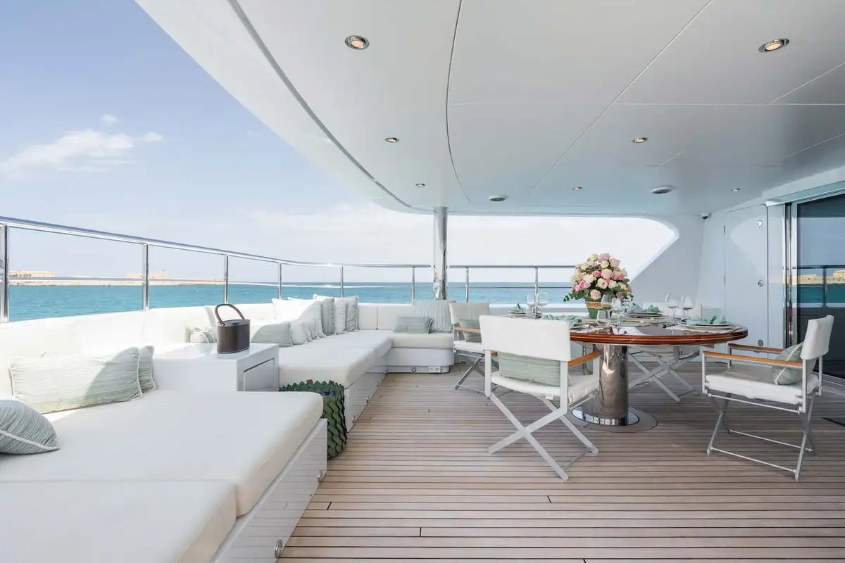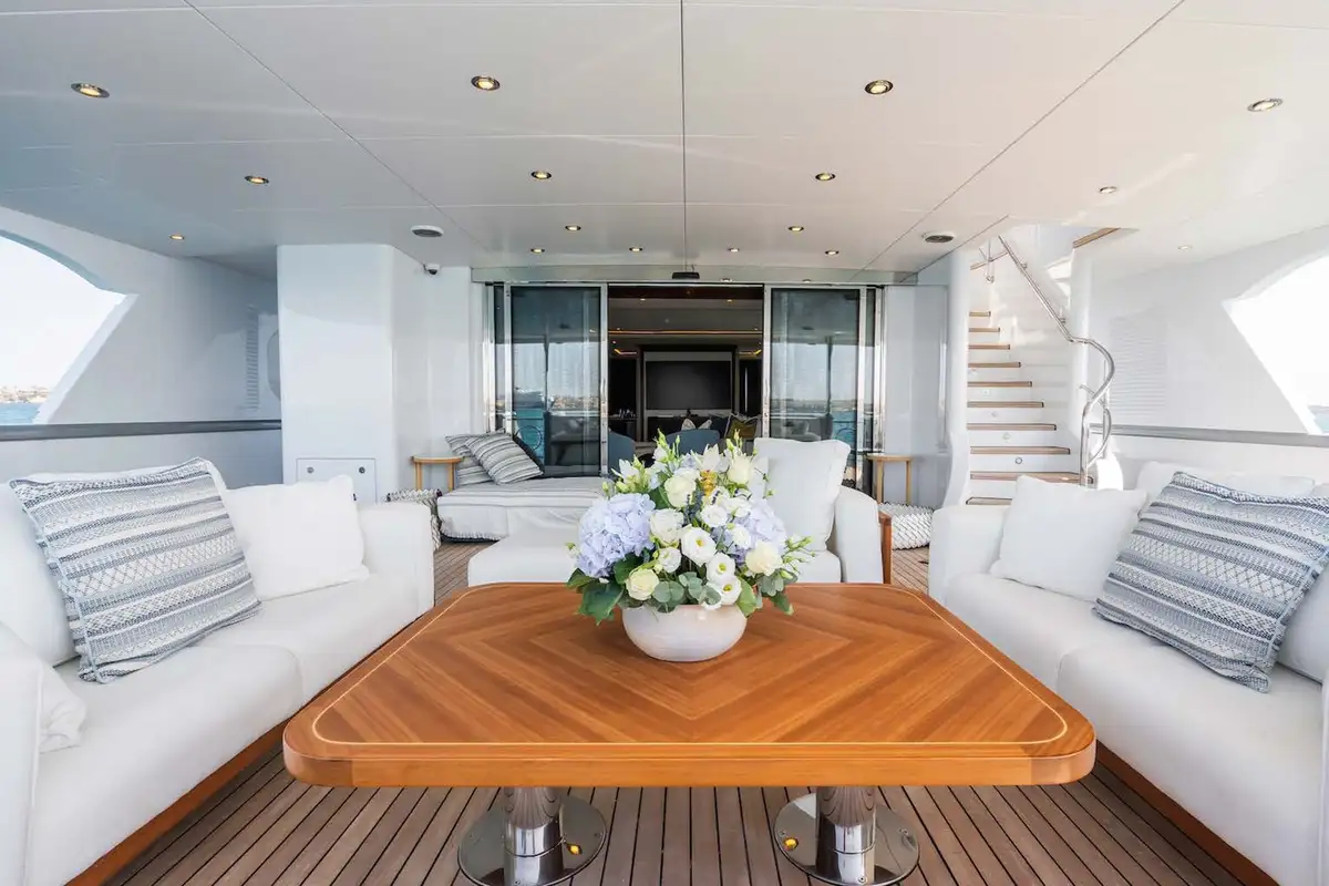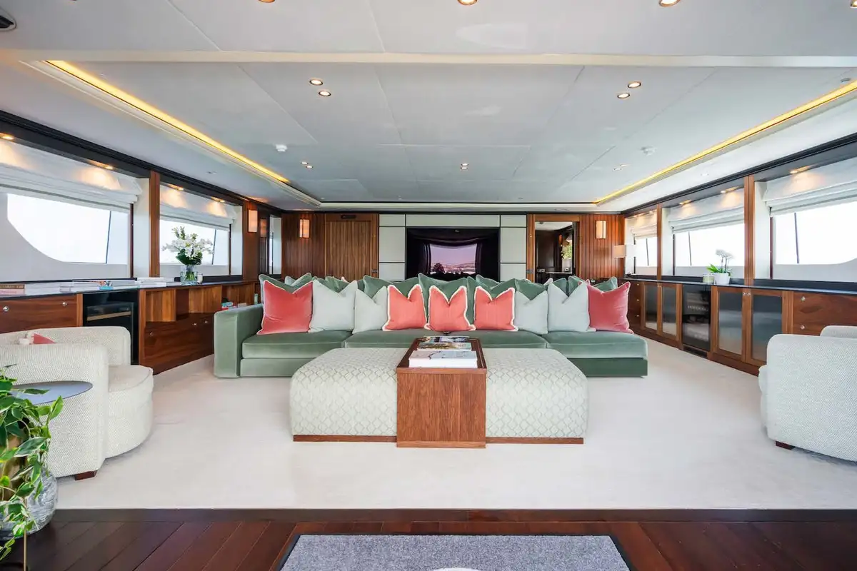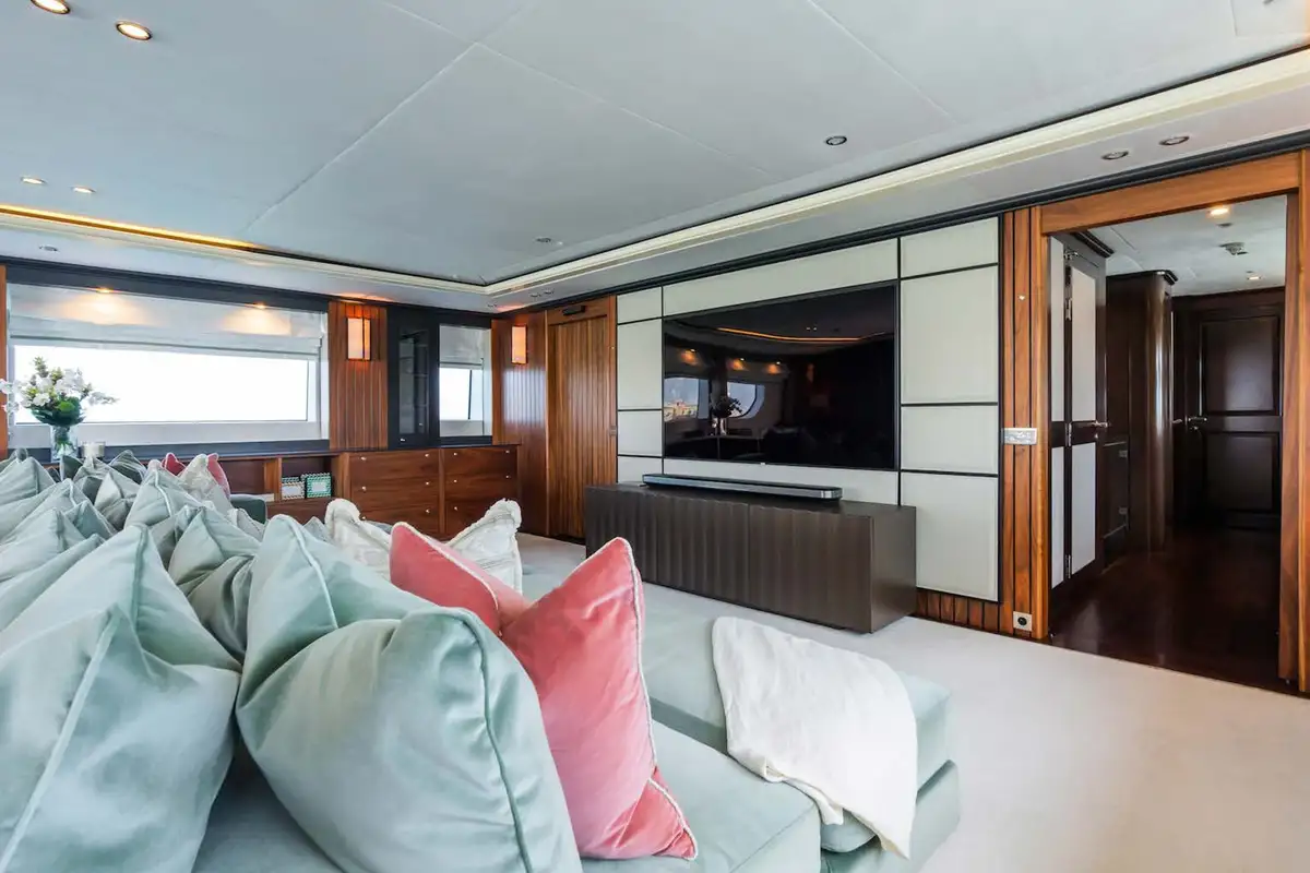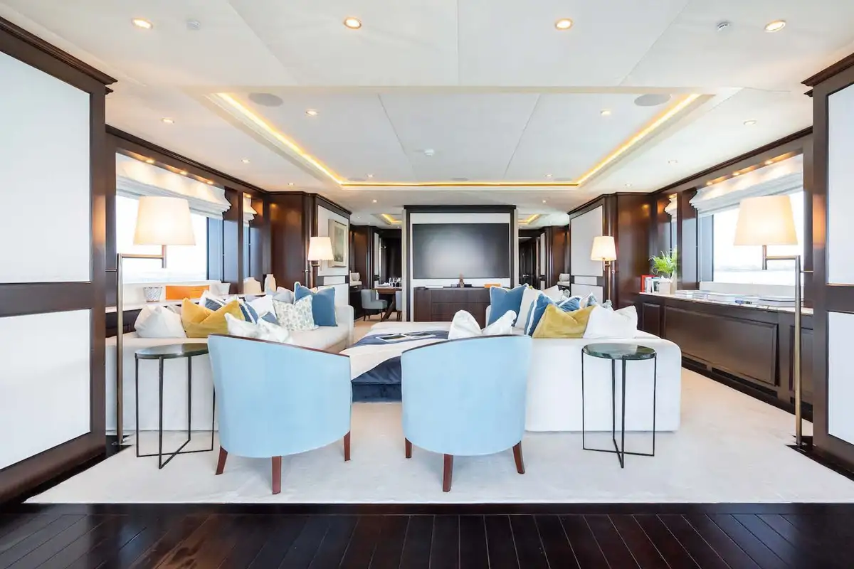 The roomy interiors designed with an interplay between rich, dark mahogany panelling and white fabrics and surfaces, creating a smart but welcoming, classic feel. The main deck lounge is an elegant space with a comfortable lounge and 10-seat dining area, while the sky lounge is a cosy living room with an easy, informal charm.