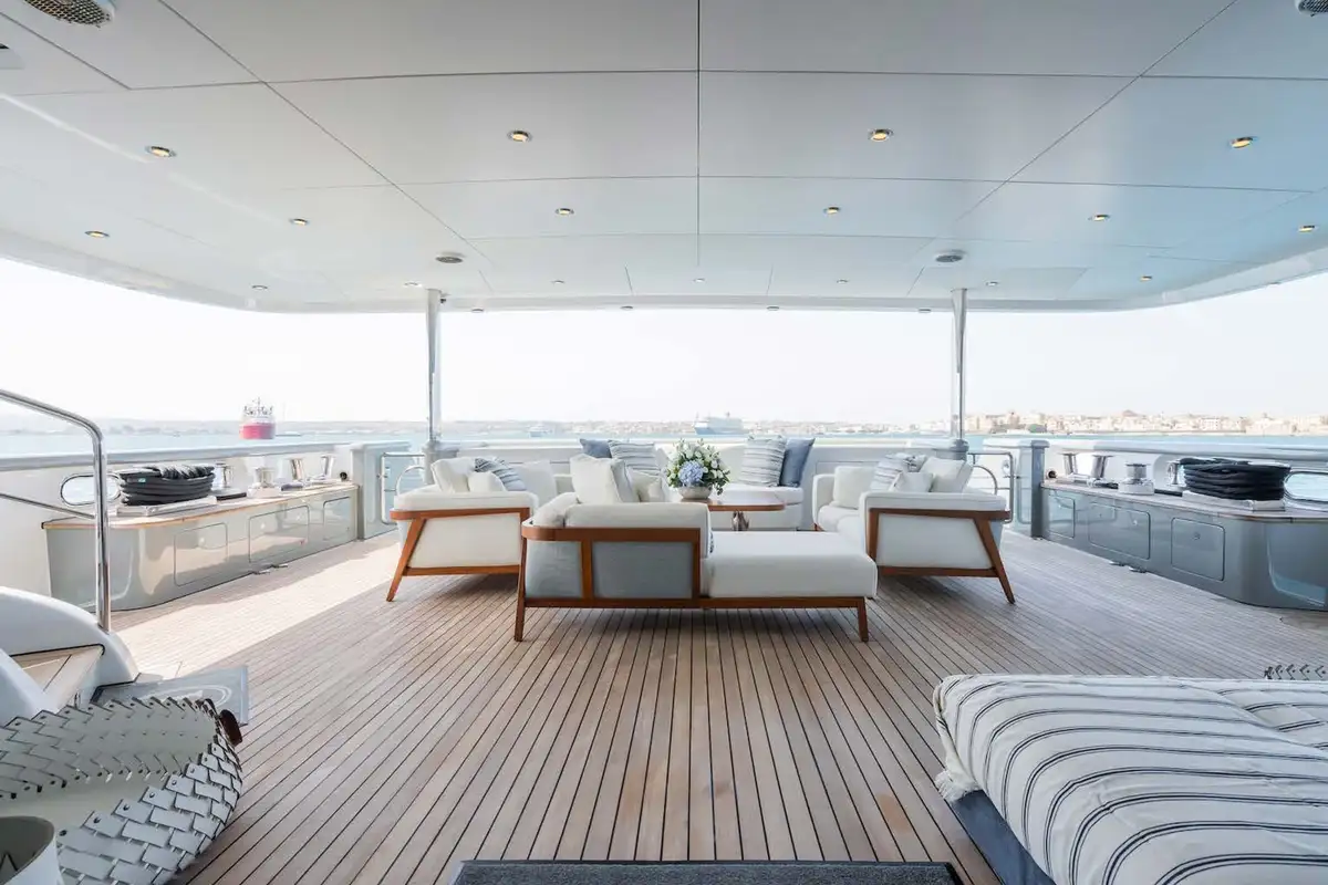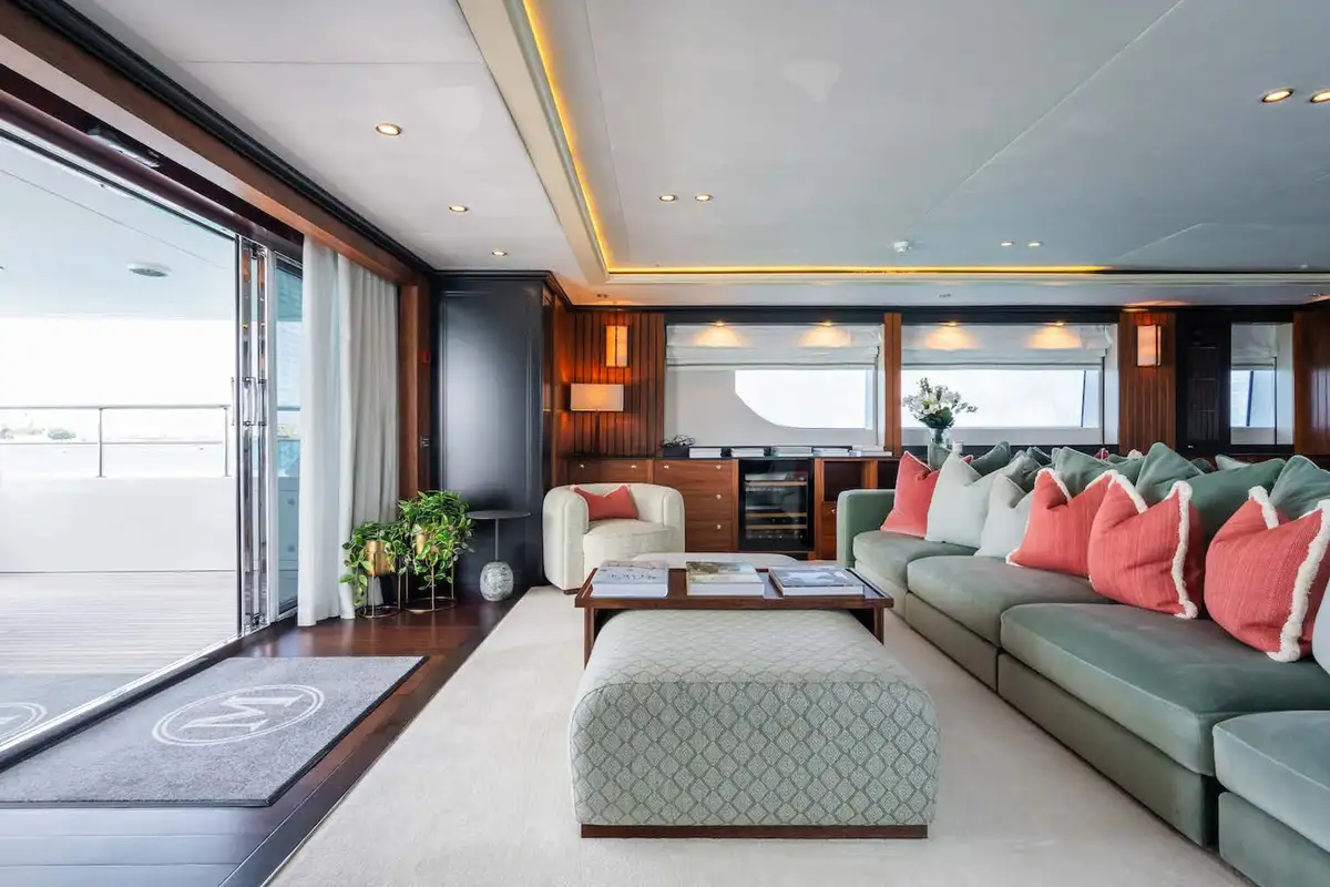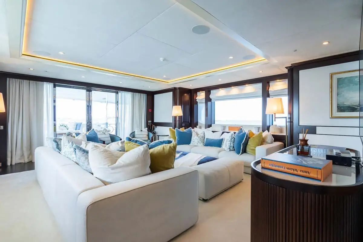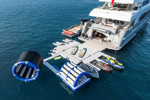 Her key features include a large sundeck, a sky lounge and upper aft deck that are ideal for entertaining, a sociable main deck configuration that includes an open galley, a foredeck lounge and a fully kitted out inflatable aqua park.