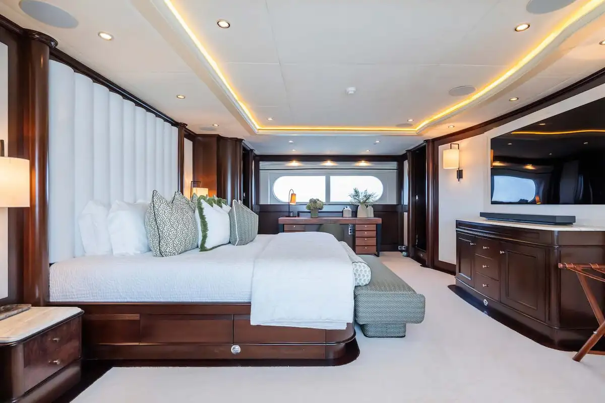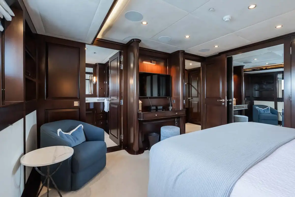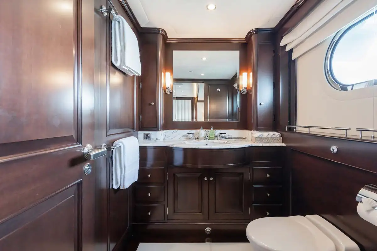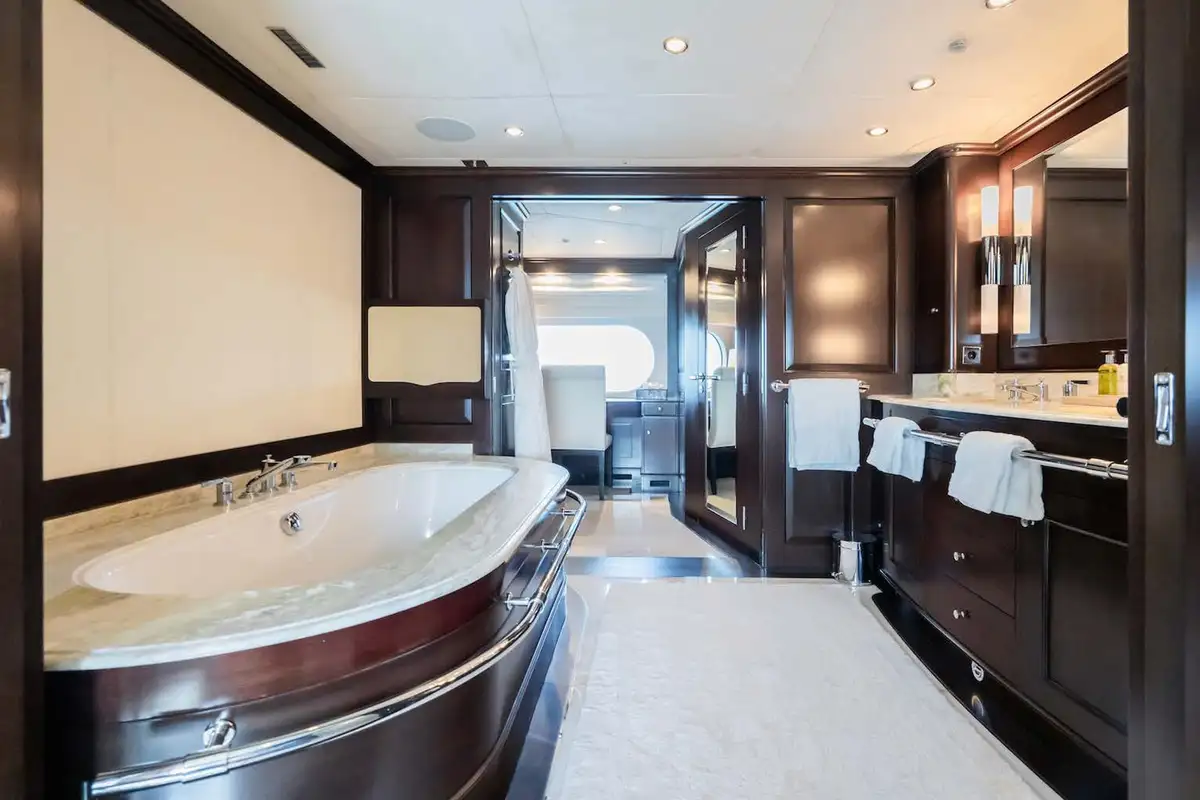 Up front on the main deck is the full-beam master suite with two large armchairs on one side of the king size bed and a desk on the other. It’s en suite bathroom has a full-size bathtub and there’s an office adjoining the main cabin. The annexe within the suite has two secure bunk beds for young children.