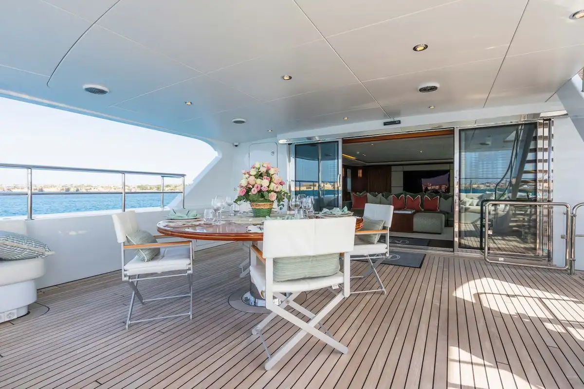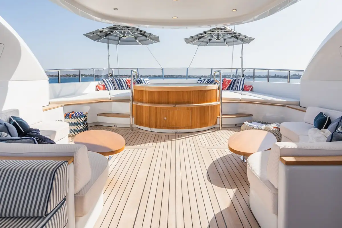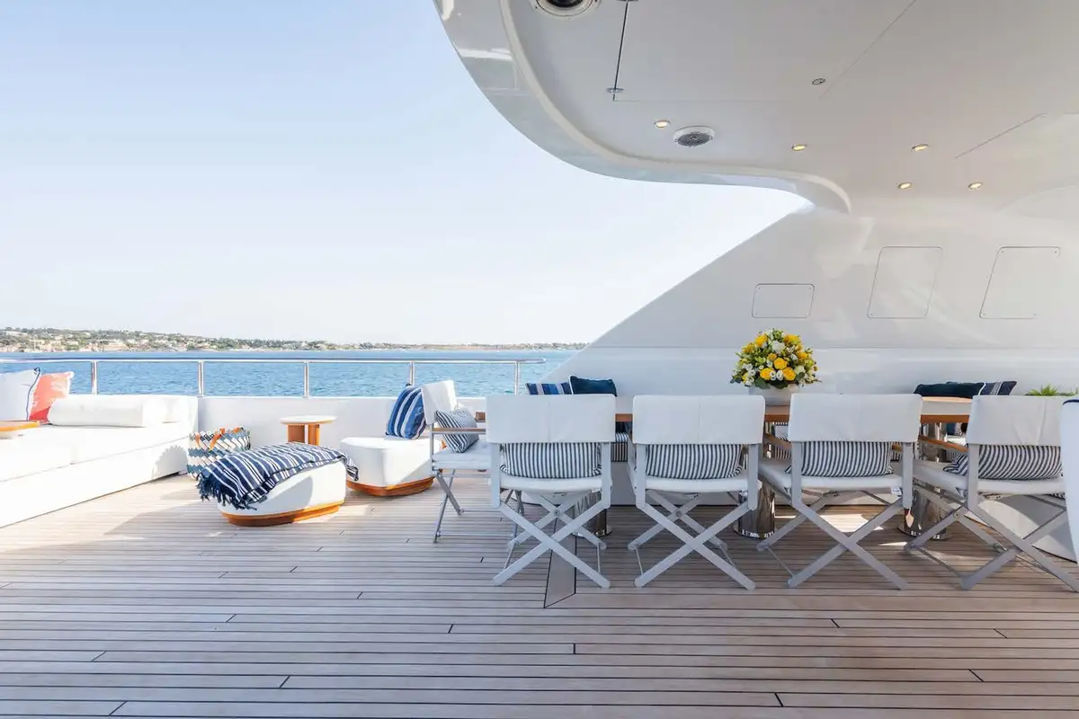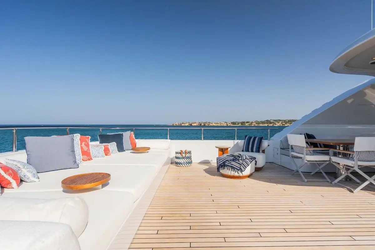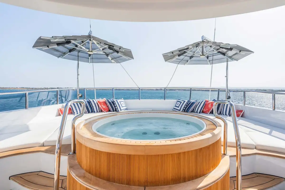 The main outside spaces on board are a comfortable lounge on the main deck aft, an upper aft deck that’s mainly dedicated to dining, and the sundeck which has a jacuzzi pool at its forward end with a large expanse of sunpad cushions, a shady central area under the hardtop, and an open deck with sun loungers astern.