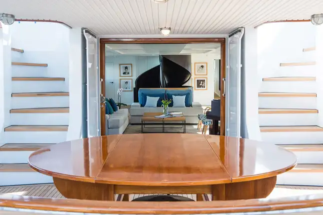 Up the centre of the yacht a striking curved staircase, lit by a glass atrium, accesses all decks. Forward of this is the master suite which will be your private sanctuary while aboard. Wake up each day to views of your anchorage through large picture windows, before you step out to let the sea air fill your lungs and make your way aft for breakfast.