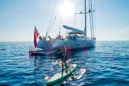 MES AMIS has plenty of water toys to enjoy. Whether you or those in your party, would like to be towed, skimming across the water, on MES AMIS’s inflatable biscuit, wakeboard or water skis or you prefer the idea of enjoying time under the water with the yacht’s SeaBobs or Sea Wings, the choice is yours. As the evening approaches, you could grab one of MES AMIS’s inflatable paddle boards and explore the anchorage in the golden light of the setting sun, before returning for the evening meal with your guests.