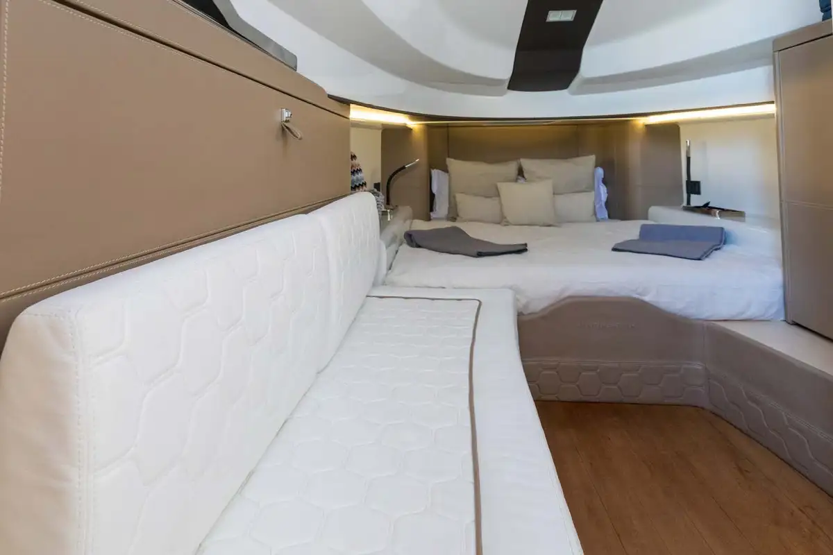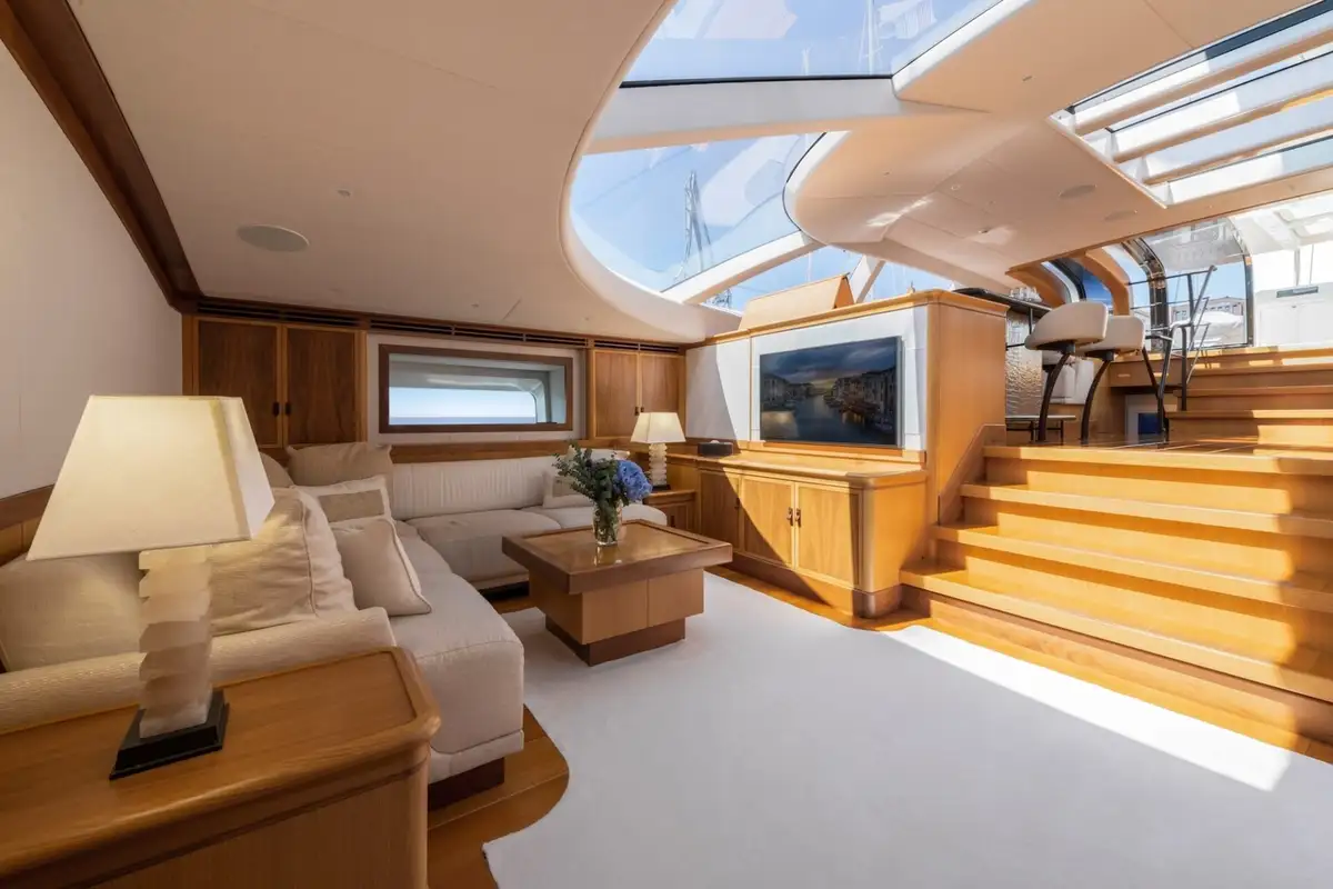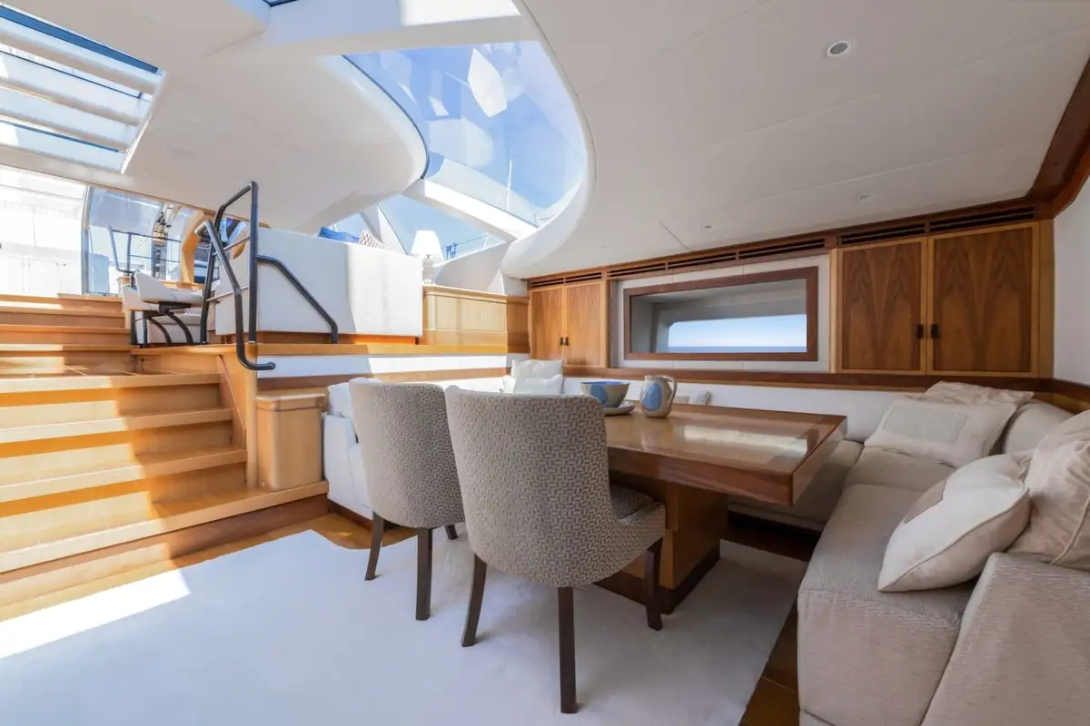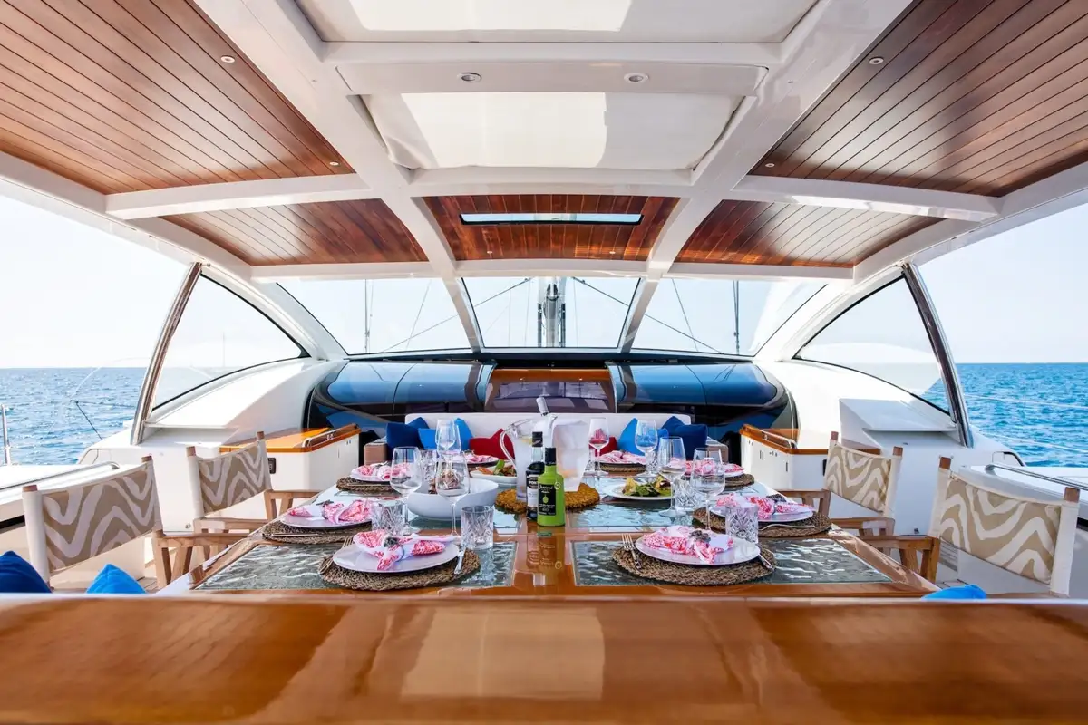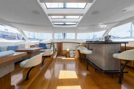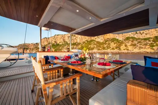 Her flush teak decks and large guest cockpit offer generous entertaining space close to the water. The large social guest cockpit can be shaded by a bimini, leaving the space open and warm. This becomes an al fresco dining area for a truly memorable dining experience. Aft of the crew cockpit is a large sunpad area with two double aft-facing sunpads for those who want to enjoy their time in the sun.