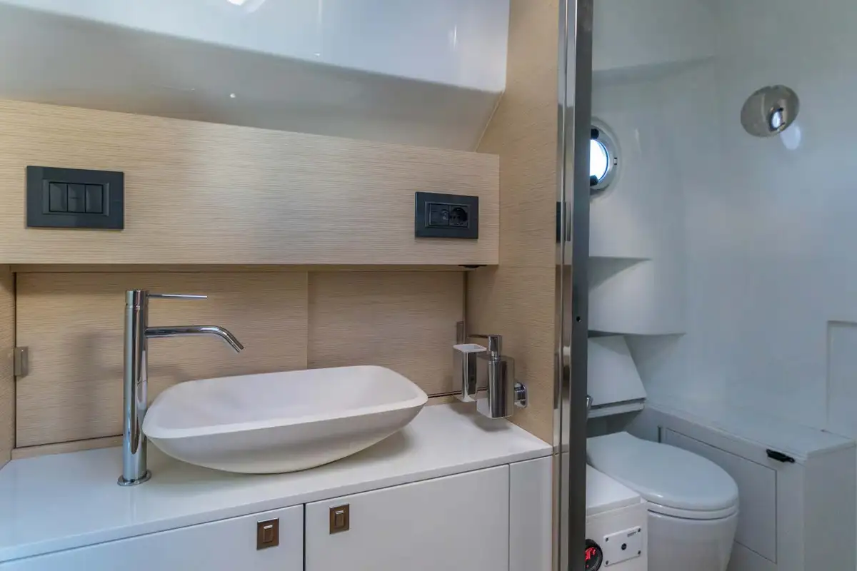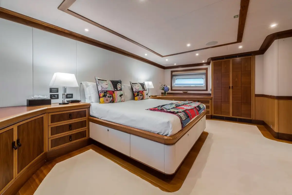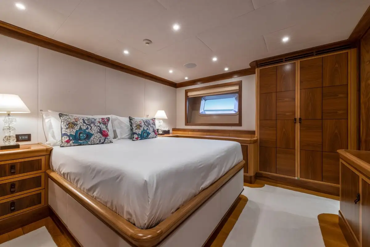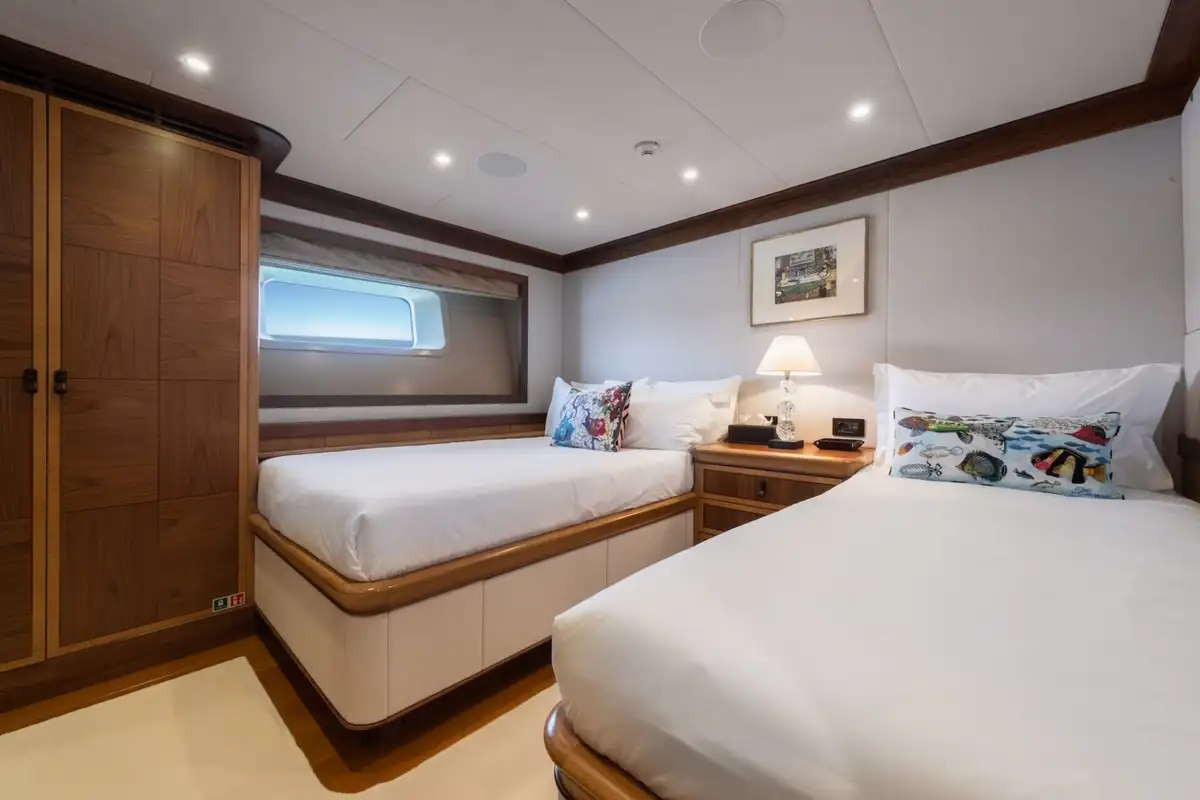 There are four beautifully furnished guest suites aboard MES AMIS and all exhibit outstanding quality. Aft, is the full-beam owner's suite that is light and contemporary-furnished. It has large hull windows on either side, a central king-sized berth and an en suite bathroom with a separate shower compartment and his and hers sinks. There is a second double berth suite, forward and to port of the master cabin. It has a marble-finished en suite bathroom and separate shower compartment. To starboard, there are two twin-berth cabins each with a pullman berth and en suite bathrooms.