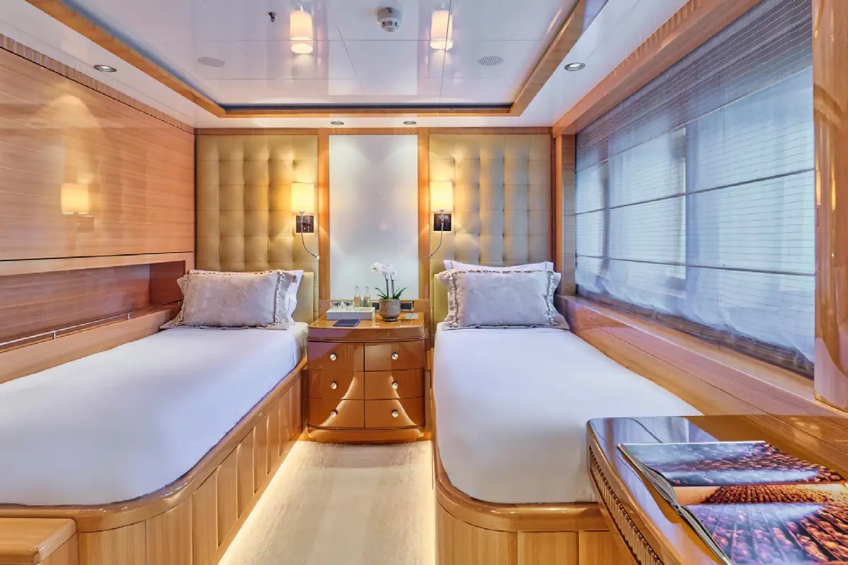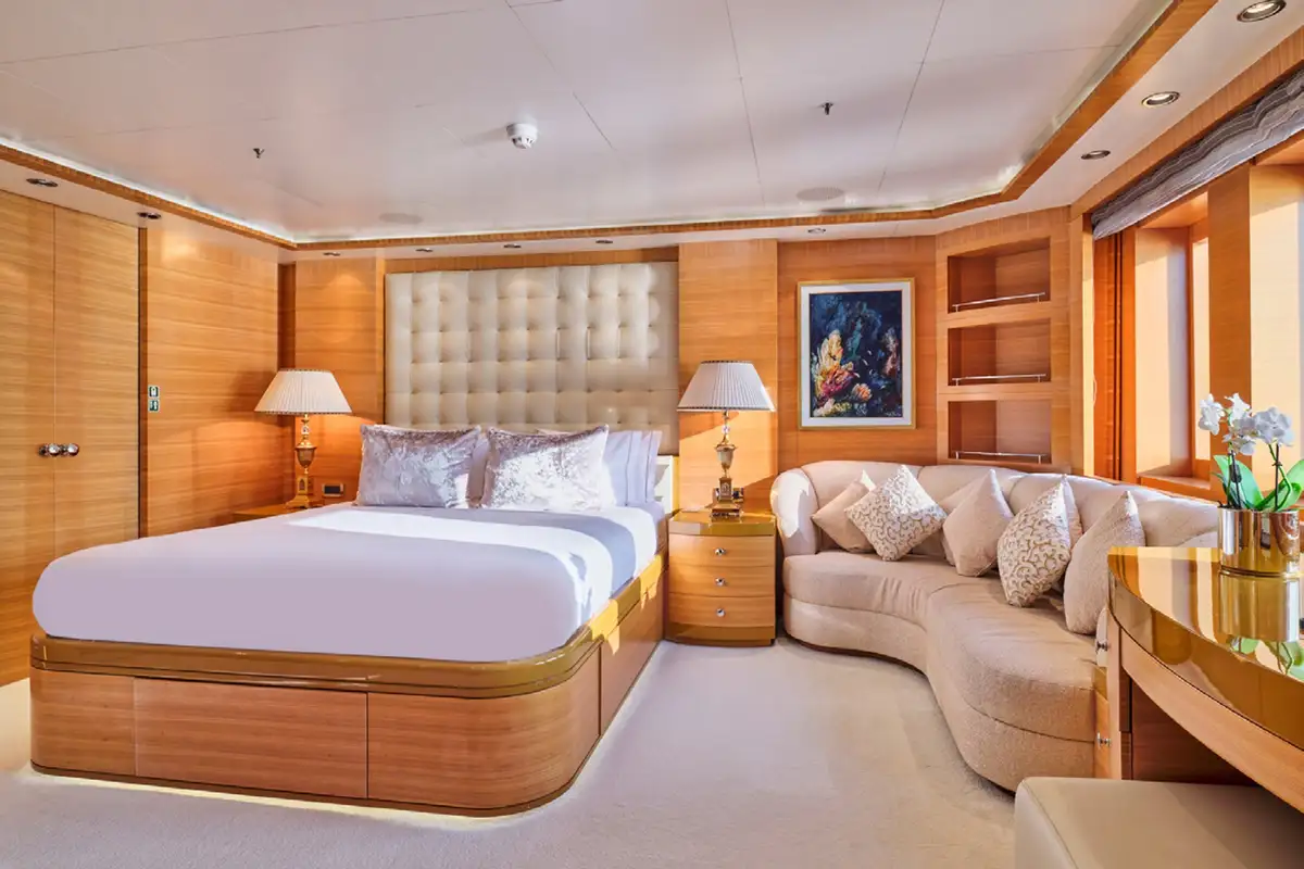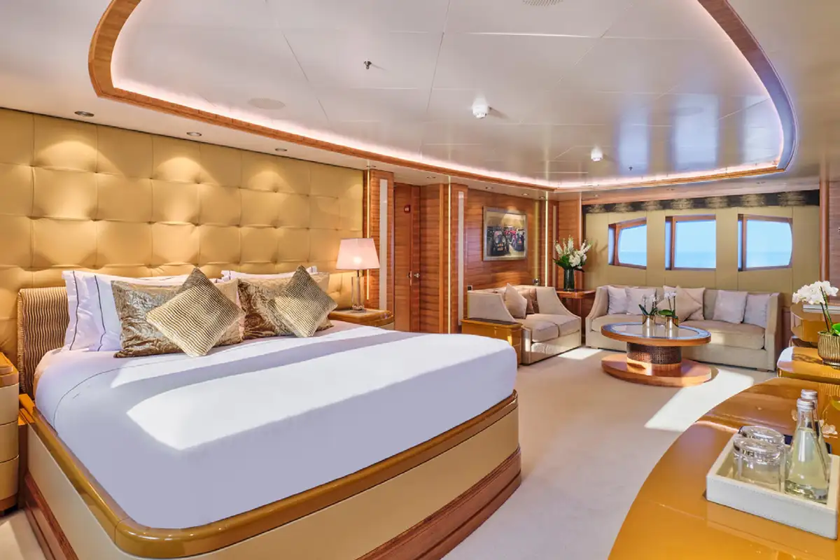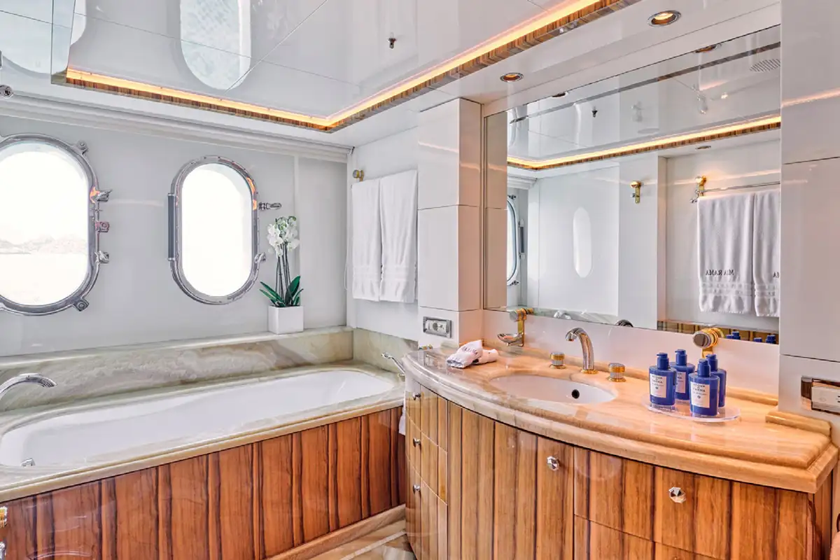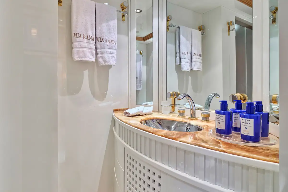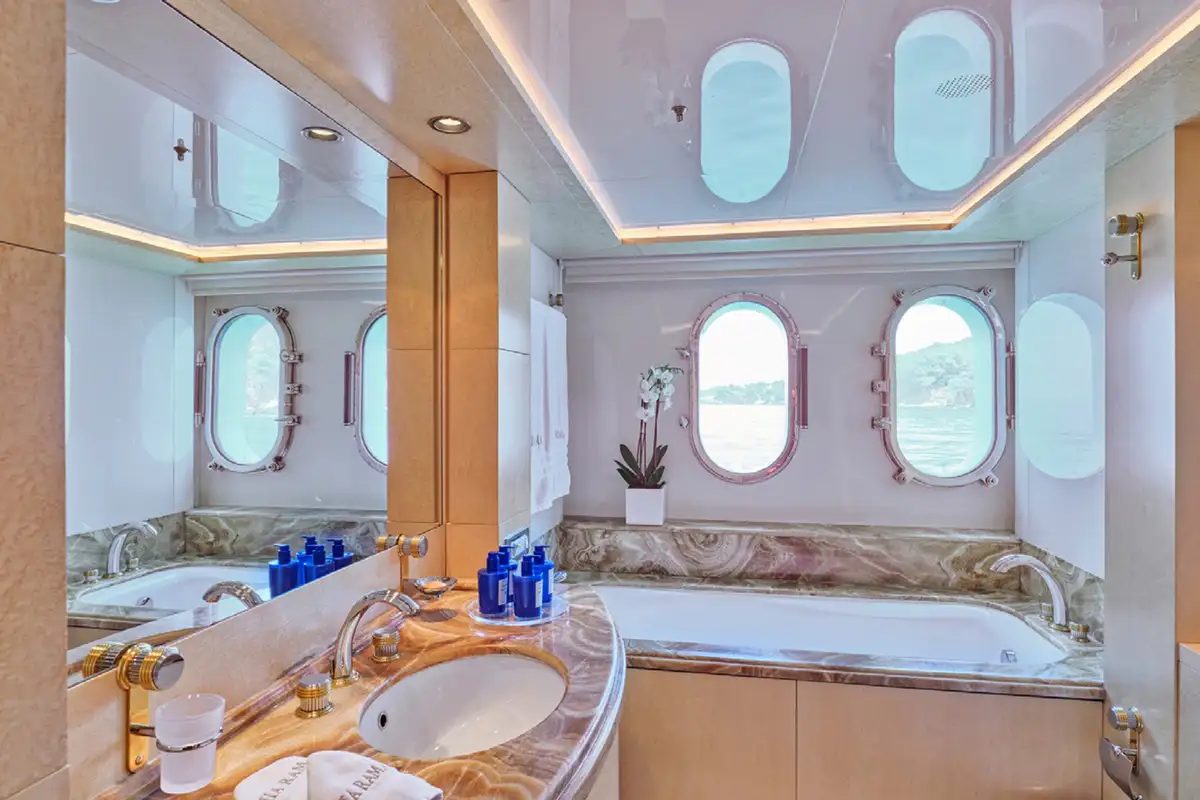 Following an afternoon of relaxation it’s time to burn more energy, perhaps with a quick visit to the on board gym or simply head straight into party mode with sundowner cocktails. A delicious dinner is served, perhaps this time in the formal dining saloon, before a nightcap or a private party on board. However you wish to finish off your first day on board, rest assured MIA RAMA’s stylish accommodation will not disappoint. Beautifully presented thanks to an interior update in 2014 right up to 2019, she welcomes 12 guests to a main deck master suite, three VIP cabins and three twin cabins across the main, lower and upper decks. Combined, they provide the ultimate haven for large families or groups of friends chartering this fabulous superyacht.