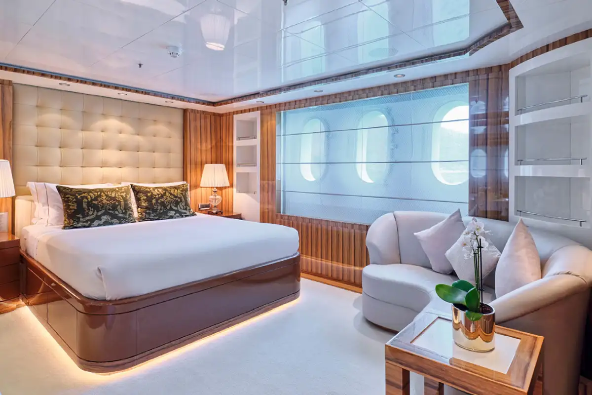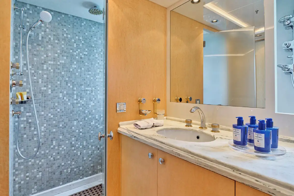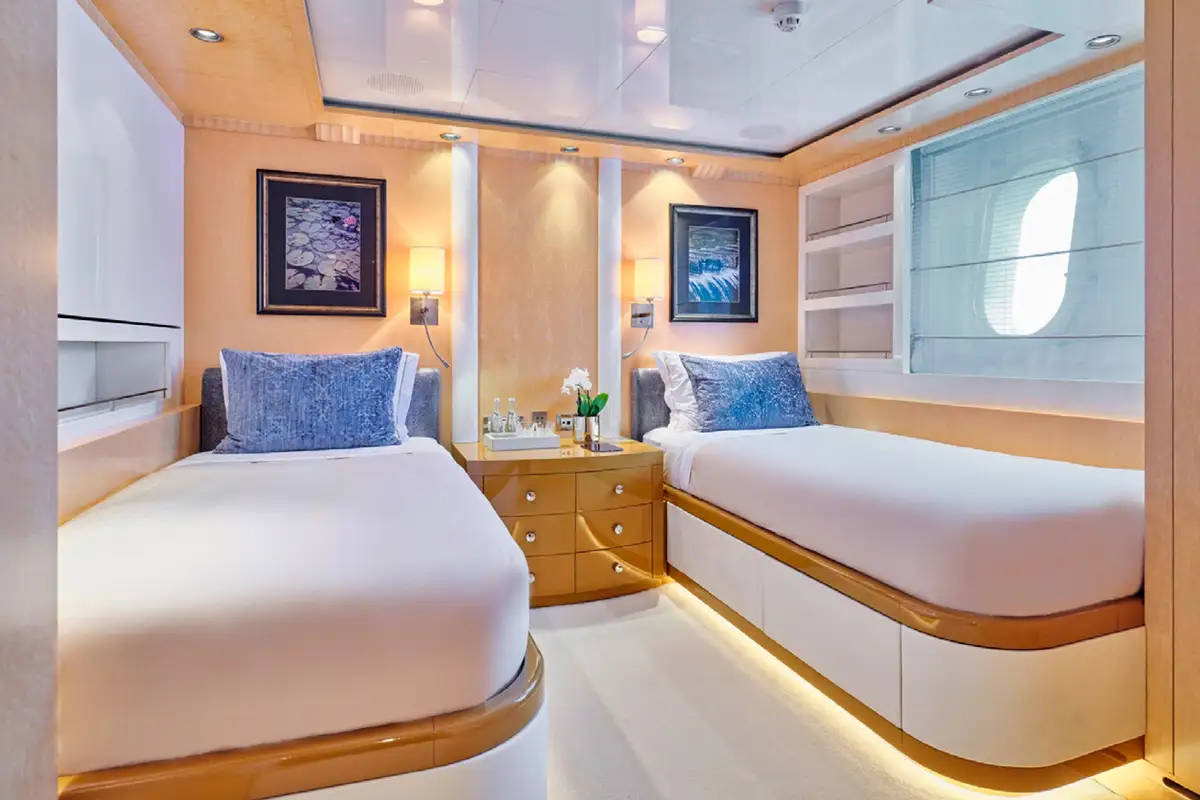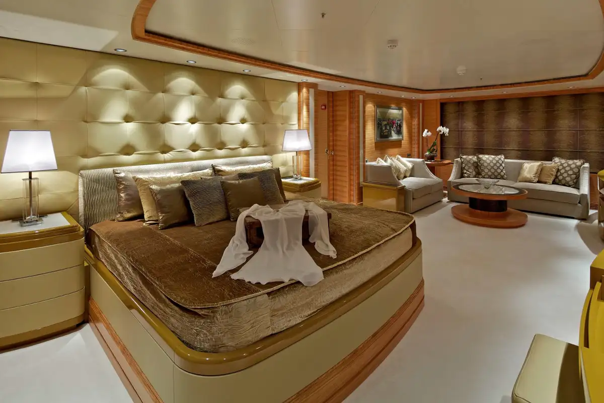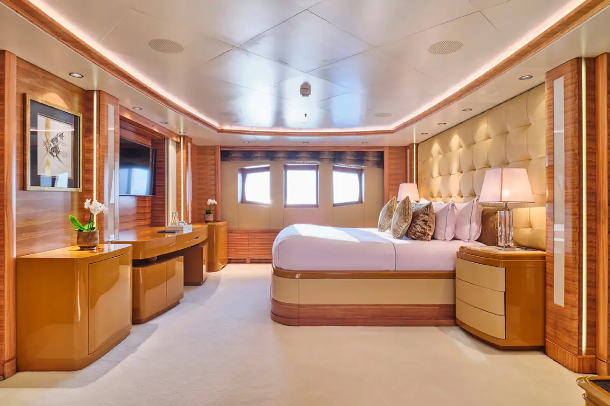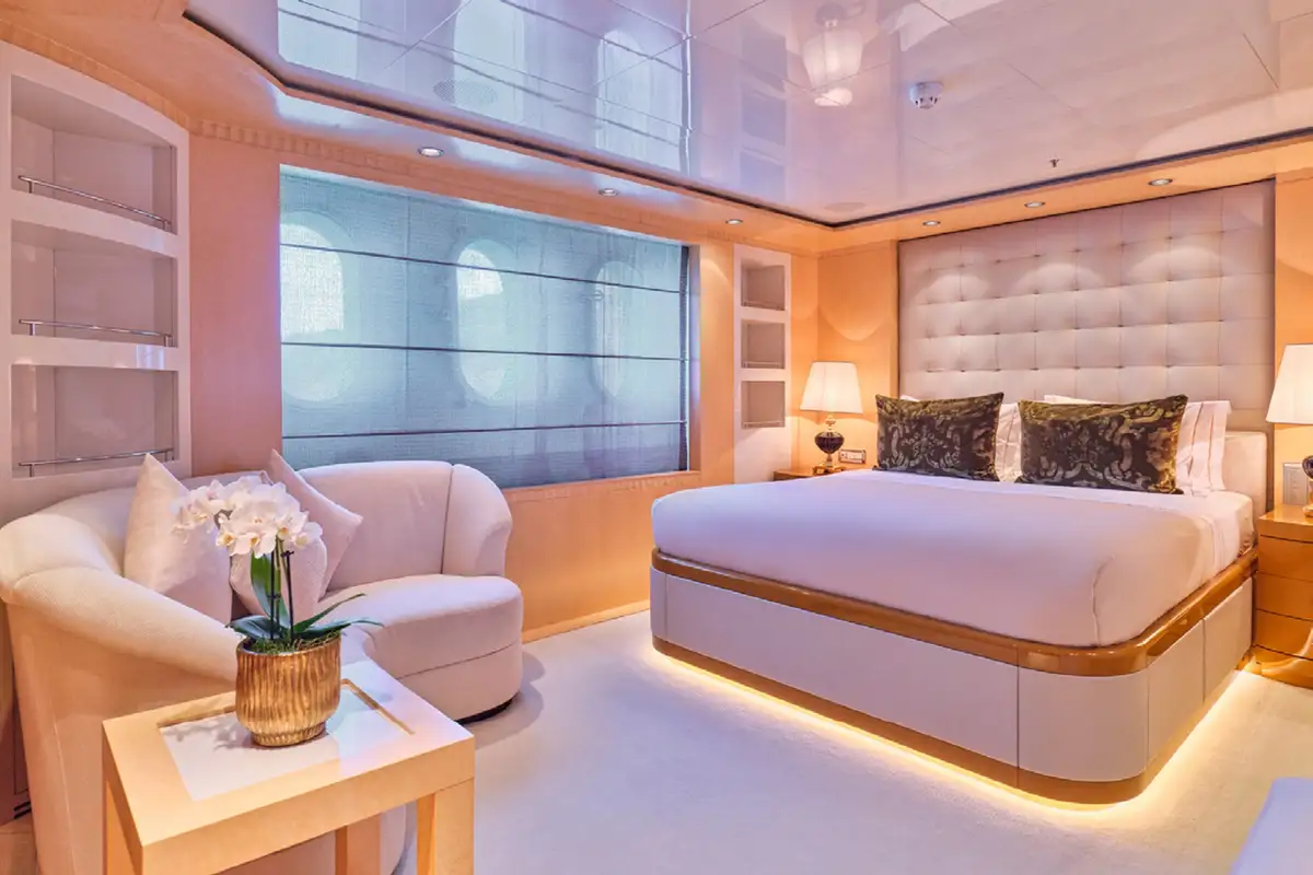 Following an afternoon of relaxation it’s time to burn more energy, perhaps with a quick visit to the on board gym or simply head straight into party mode with sundowner cocktails. A delicious dinner is served, perhaps this time in the formal dining saloon, before a nightcap or a private party on board. However you wish to finish off your first day on board, rest assured MIA RAMA’s stylish accommodation will not disappoint. Beautifully presented thanks to an interior update in 2014 right up to 2019, she welcomes 12 guests to a main deck master suite, three VIP cabins and three twin cabins across the main, lower and upper decks. Combined, they provide the ultimate haven for large families or groups of friends chartering this fabulous superyacht.