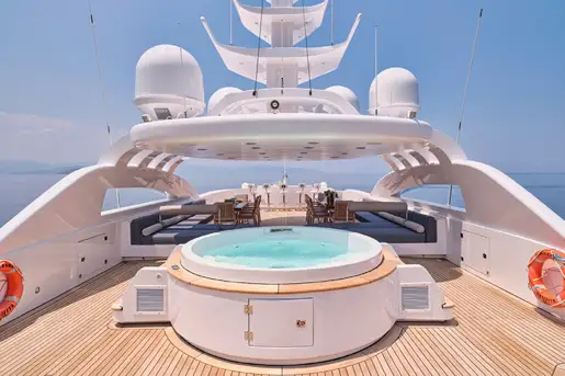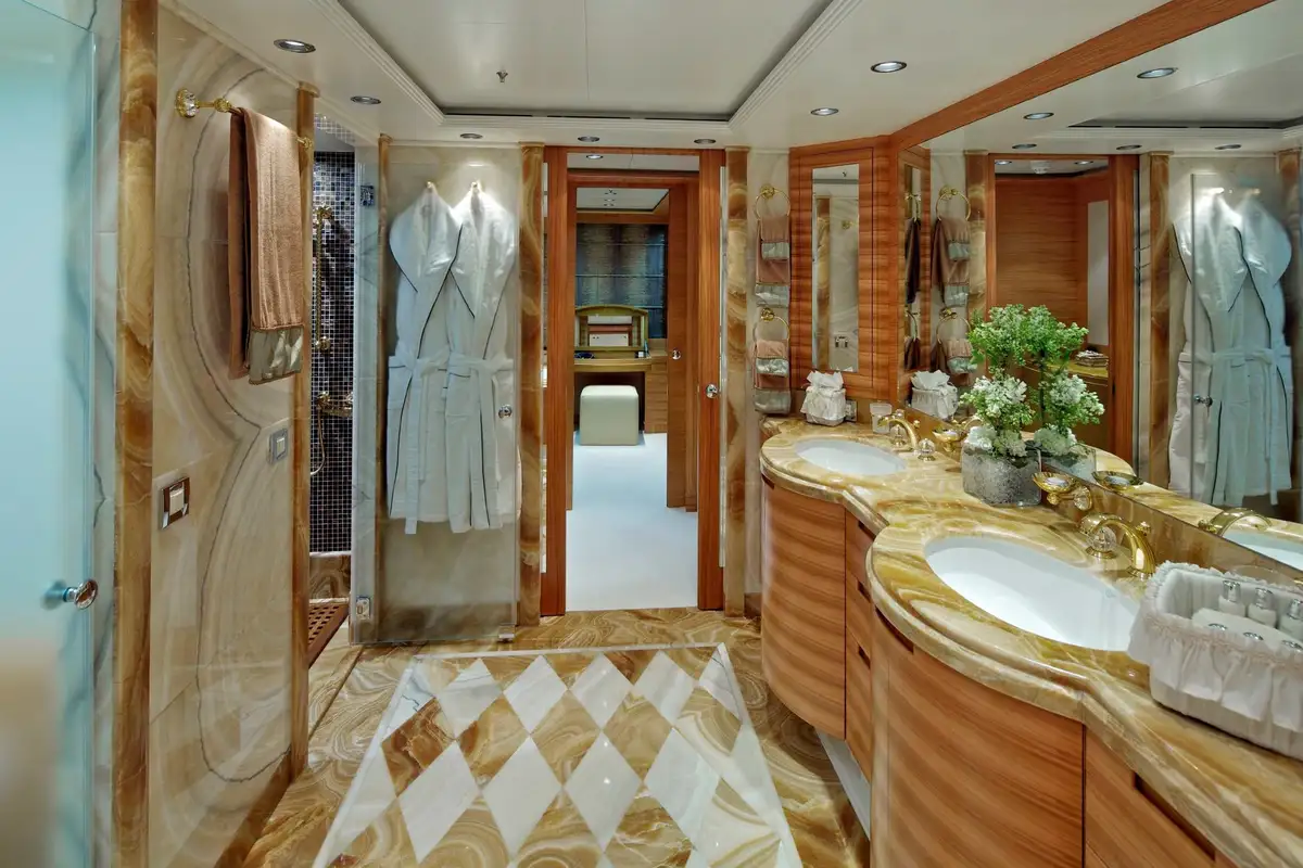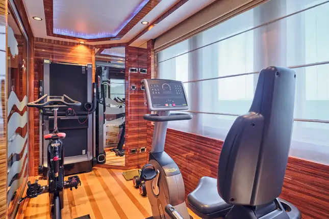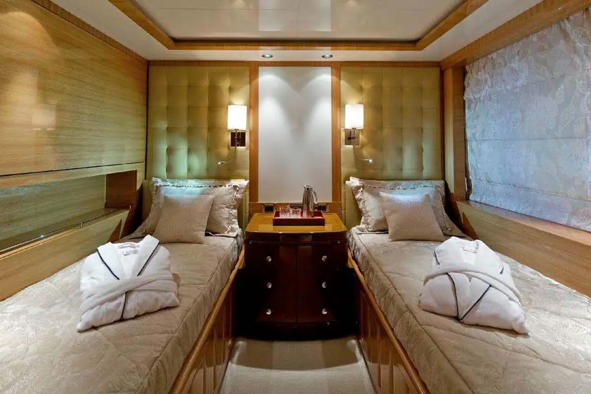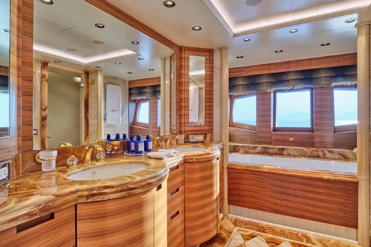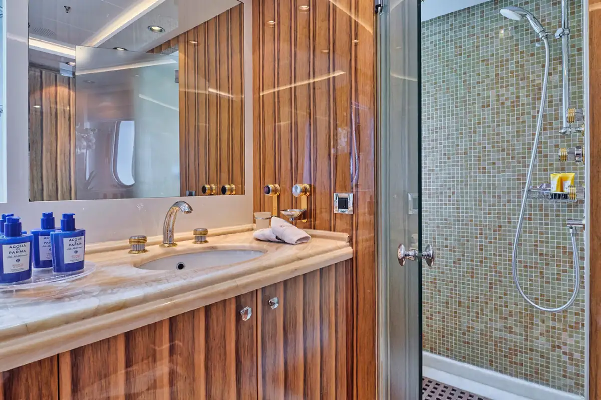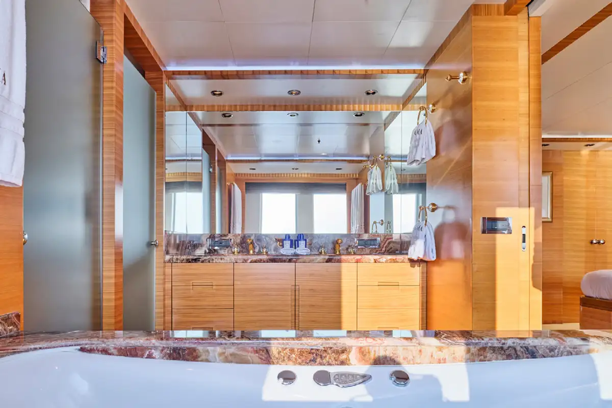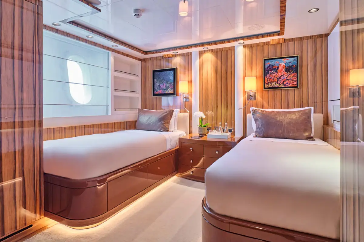 Following an afternoon of relaxation it’s time to burn more energy, perhaps with a quick visit to the on board gym or simply head straight into party mode with sundowner cocktails. A delicious dinner is served, perhaps this time in the formal dining saloon, before a nightcap or a private party on board. However you wish to finish off your first day on board, rest assured MIA RAMA’s stylish accommodation will not disappoint. Beautifully presented thanks to an interior update in 2014 right up to 2019, she welcomes 12 guests to a main deck master suite, three VIP cabins and three twin cabins across the main, lower and upper decks. Combined, they provide the ultimate haven for large families or groups of friends chartering this fabulous superyacht.