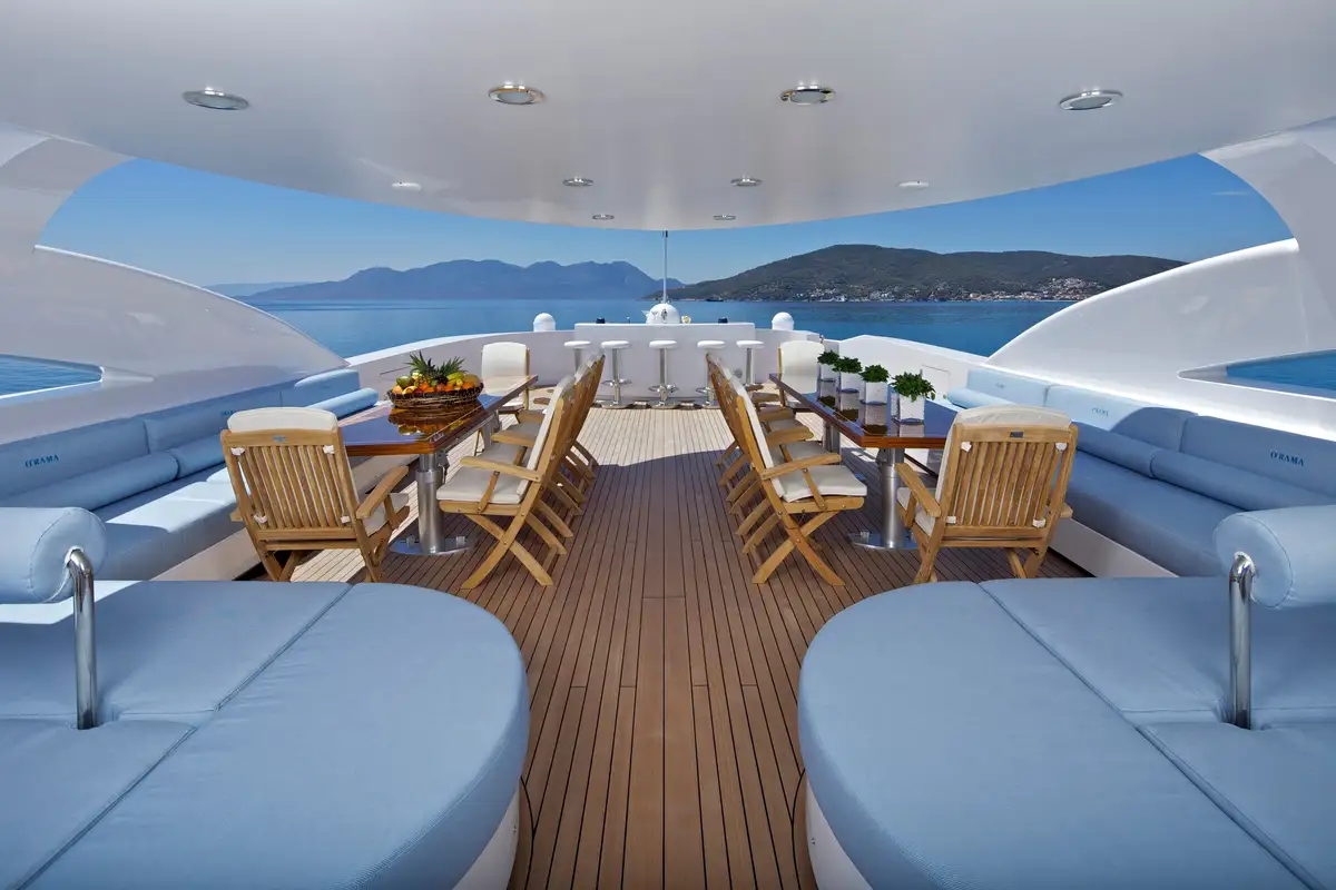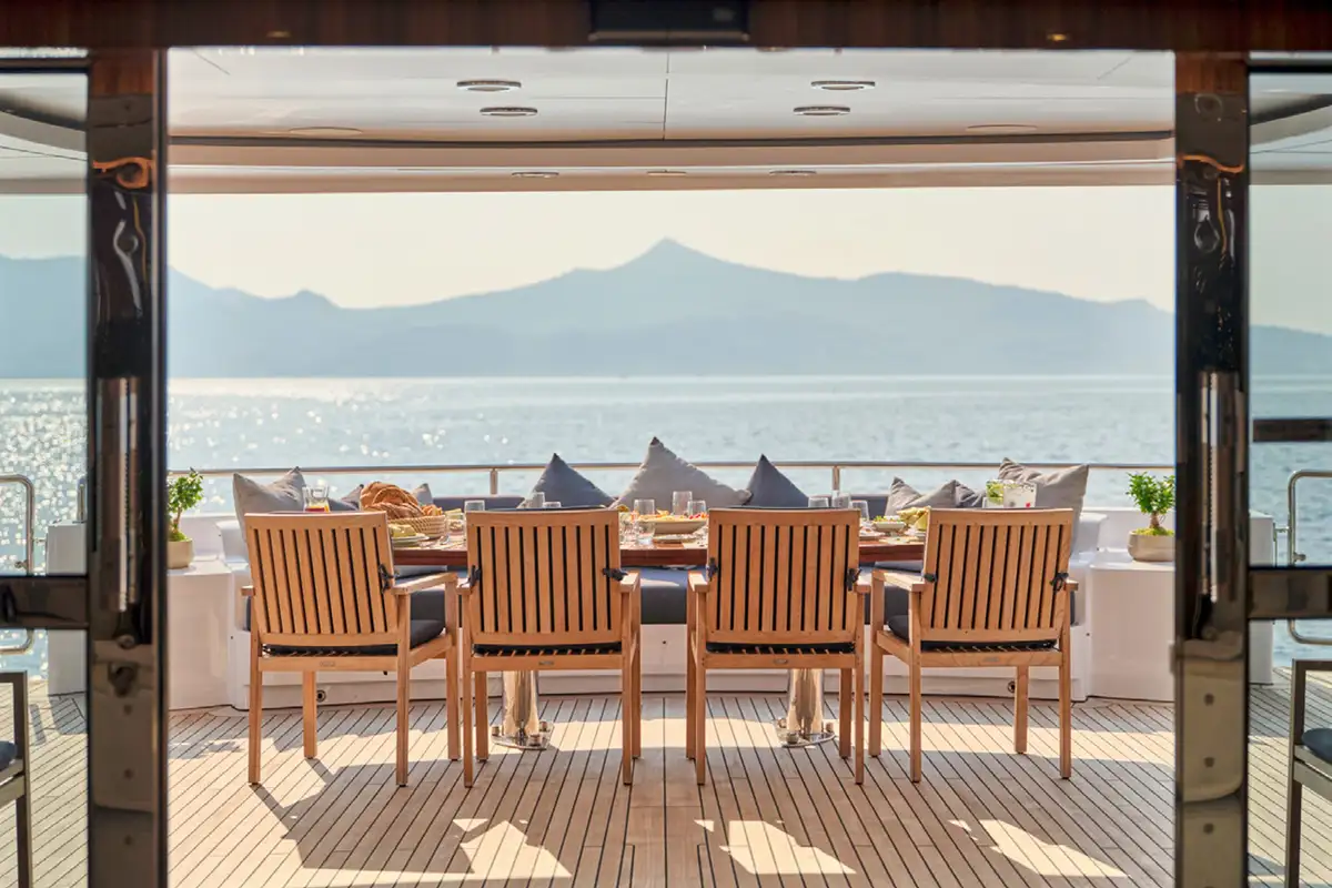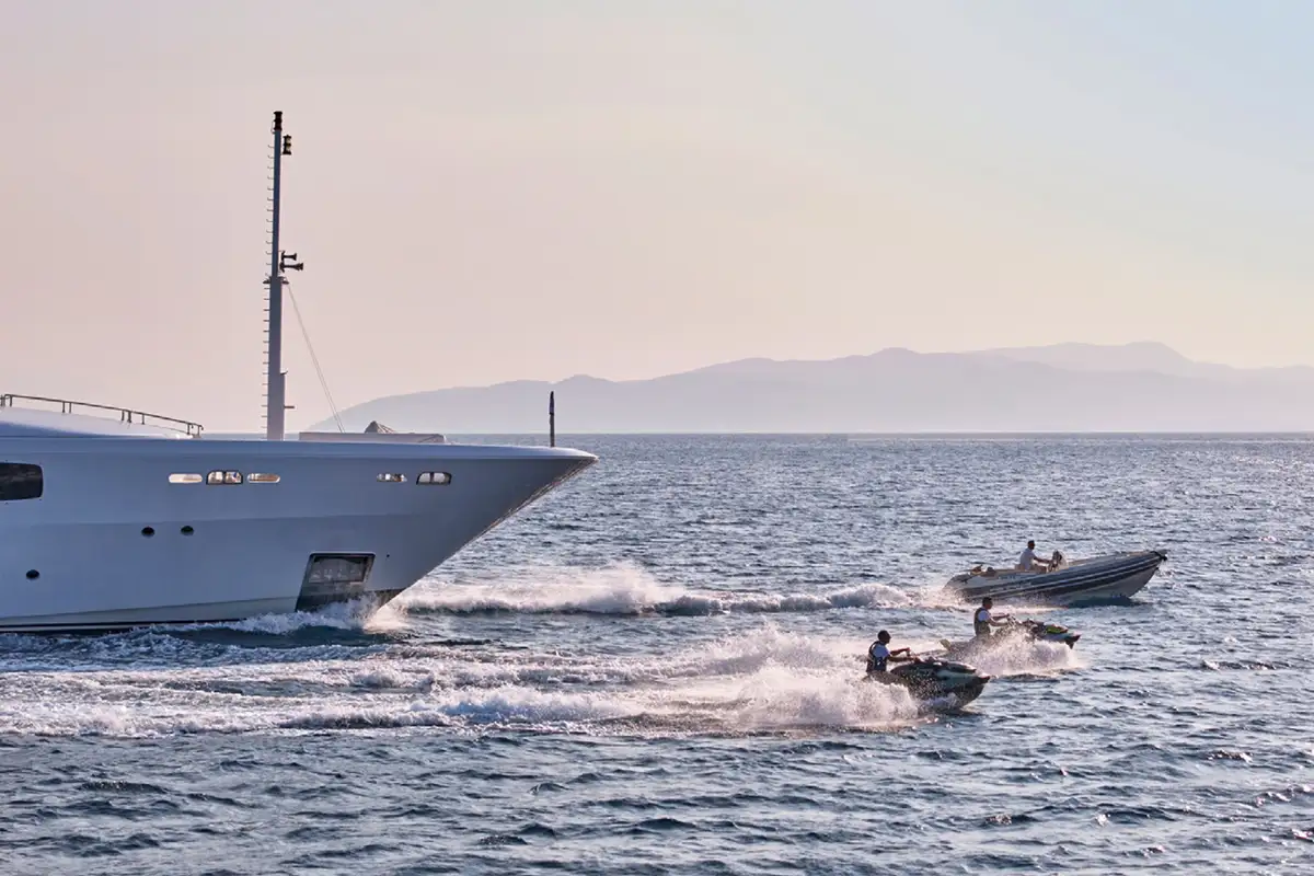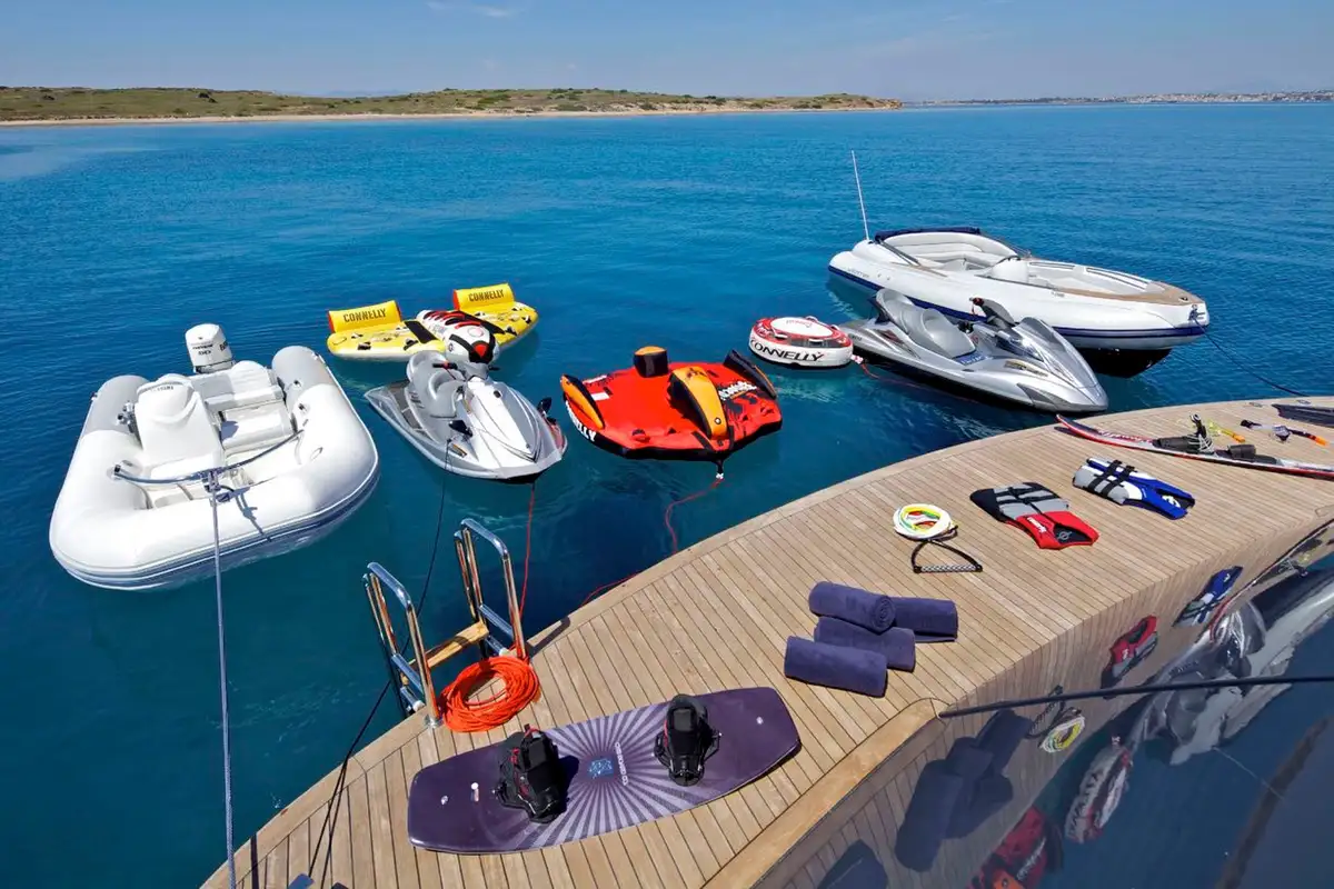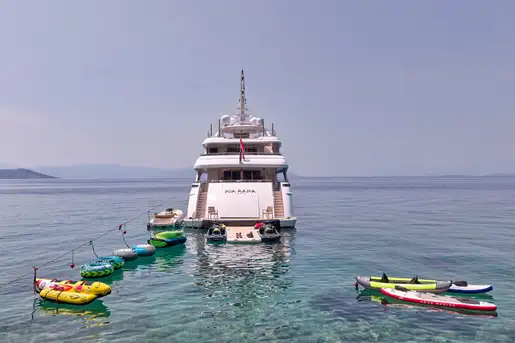 Start the day with breakfast on the main deck where a casual al fresco dining area will have been set up by MIA RAMA’s attentive crew. Fuelled and ready for the day ahead, some guests may choose to enjoy the convivial sun deck, where the sit-up bar has great views of the anchorage, others might prefer to head down to the swim platform for a morning of watersports. As well as jetskis, inflatables and stand up paddleboards, her flyboards, wakeboards and towables provide hours of fun on and in the water.
