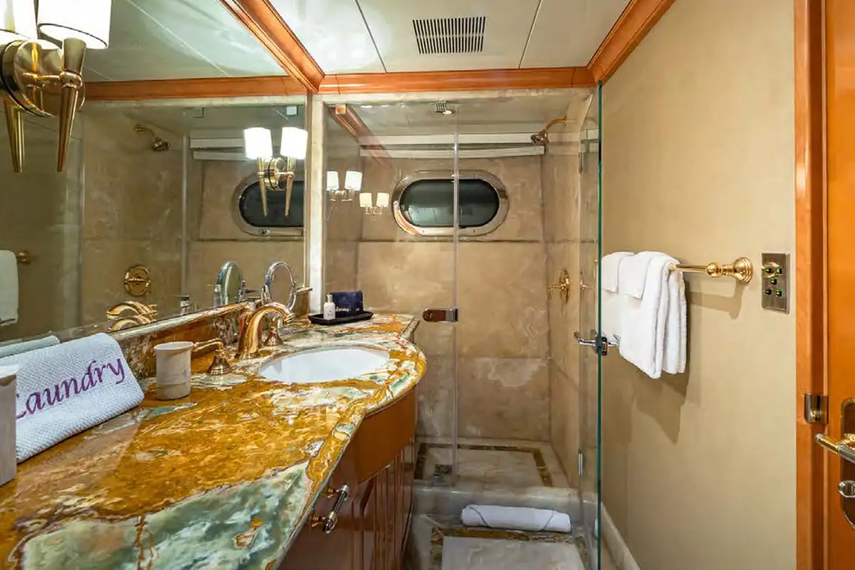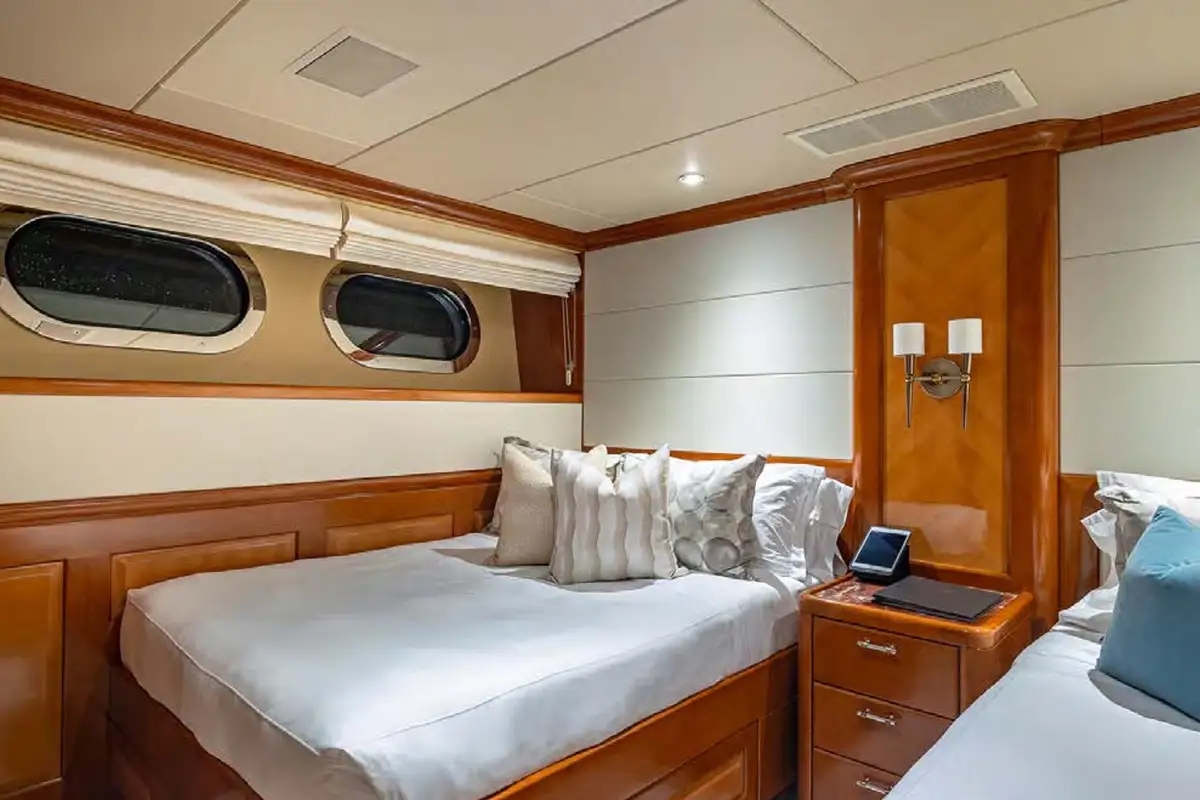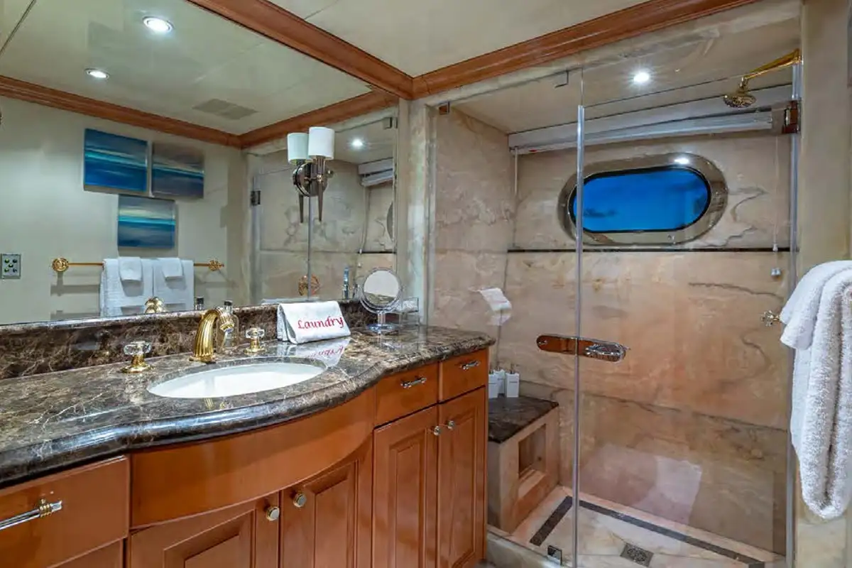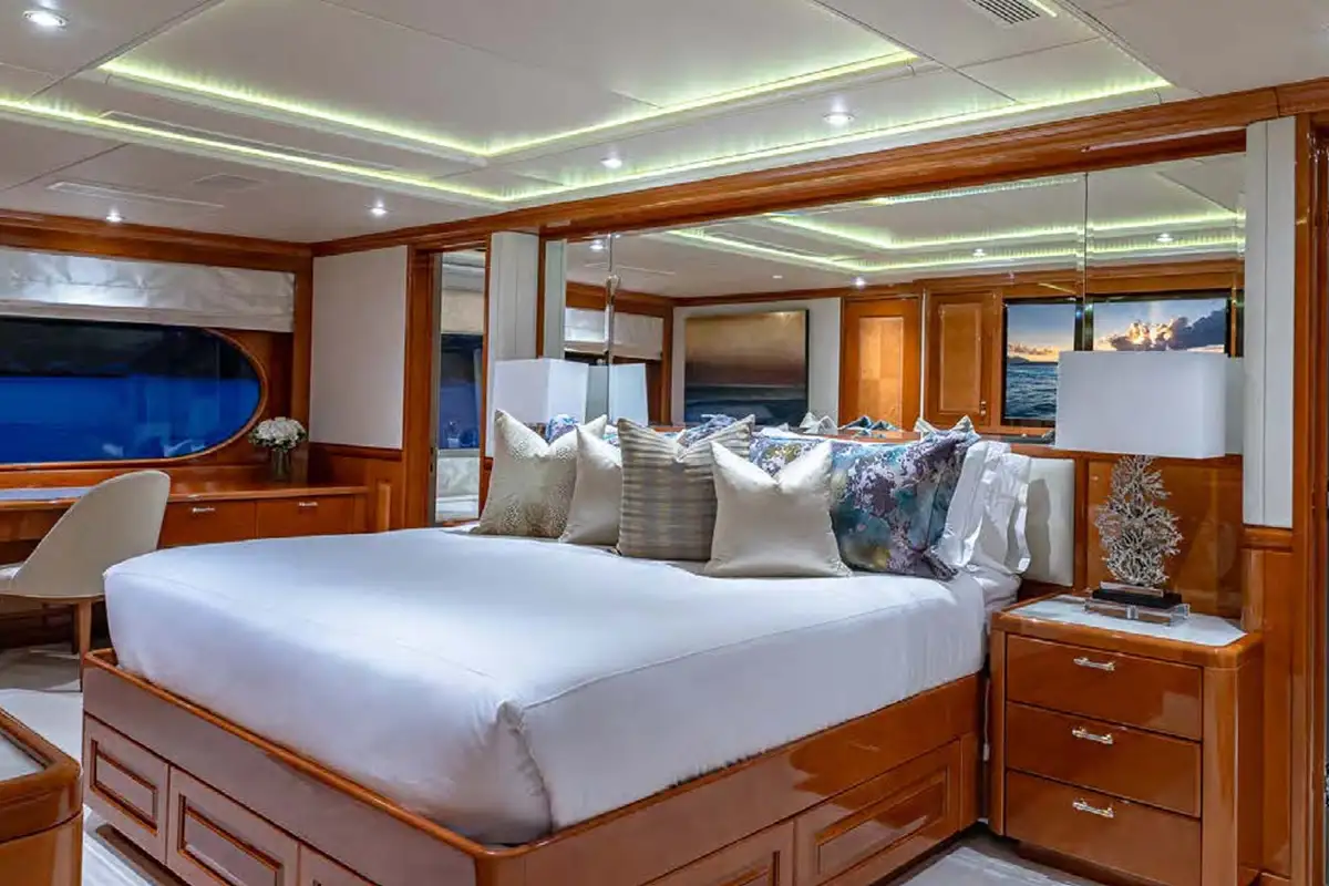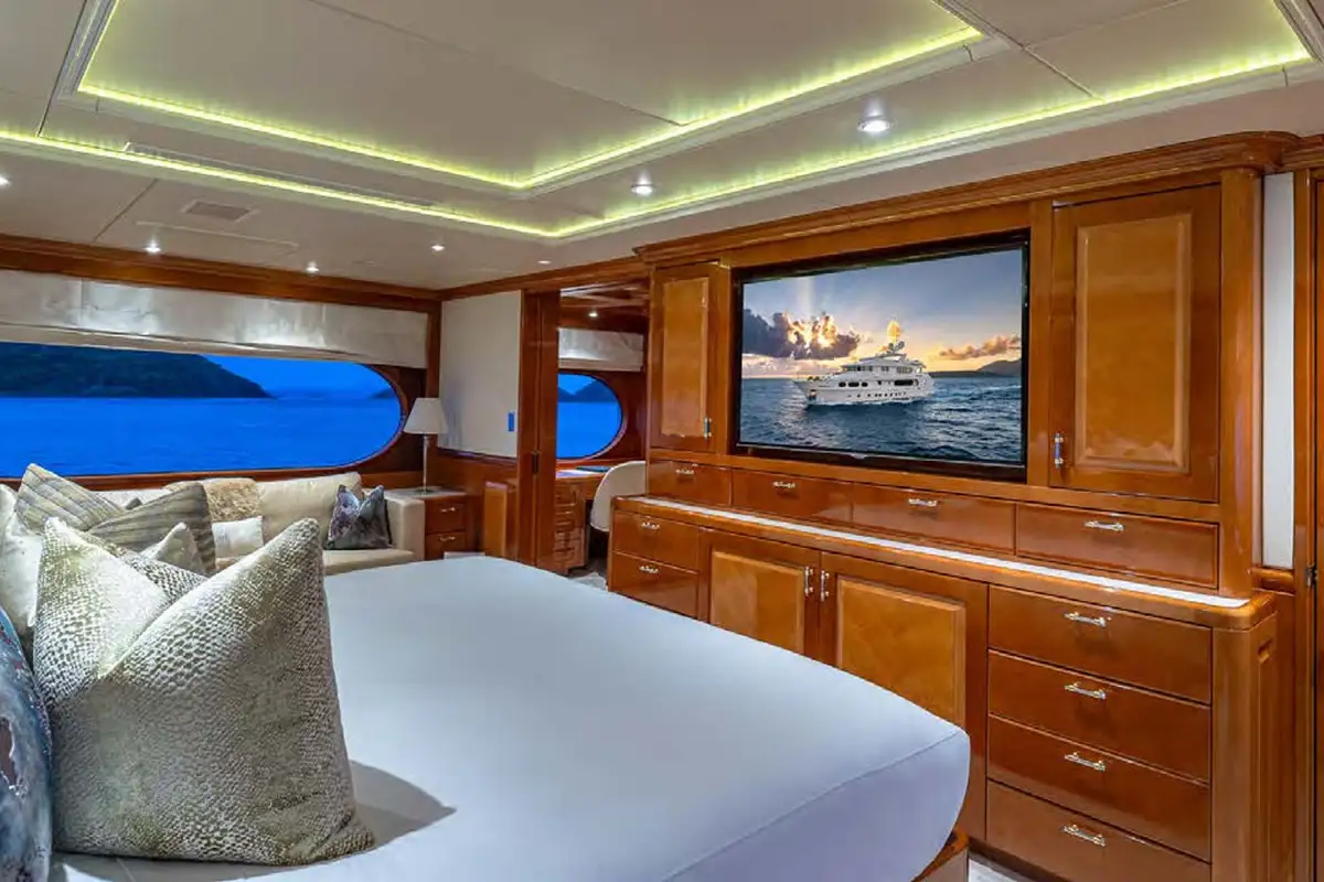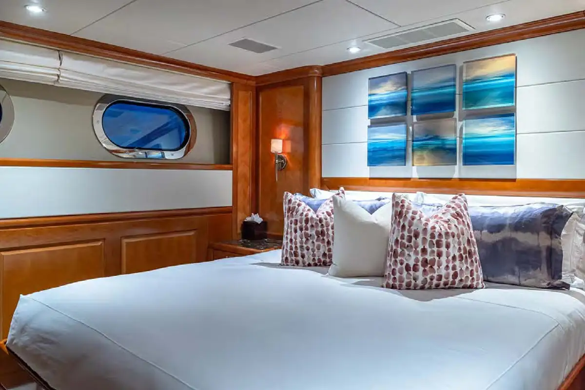 The morning sun glints off the water to welcome you as you pull up the blind over the super-sized windows in your master suite. This oasis of quiet is all yours to enjoy on the forward main deck. There are his and her bathrooms with a connecting shower room so you can quickly freshen-up, grab something light to wear and head to breakfast.