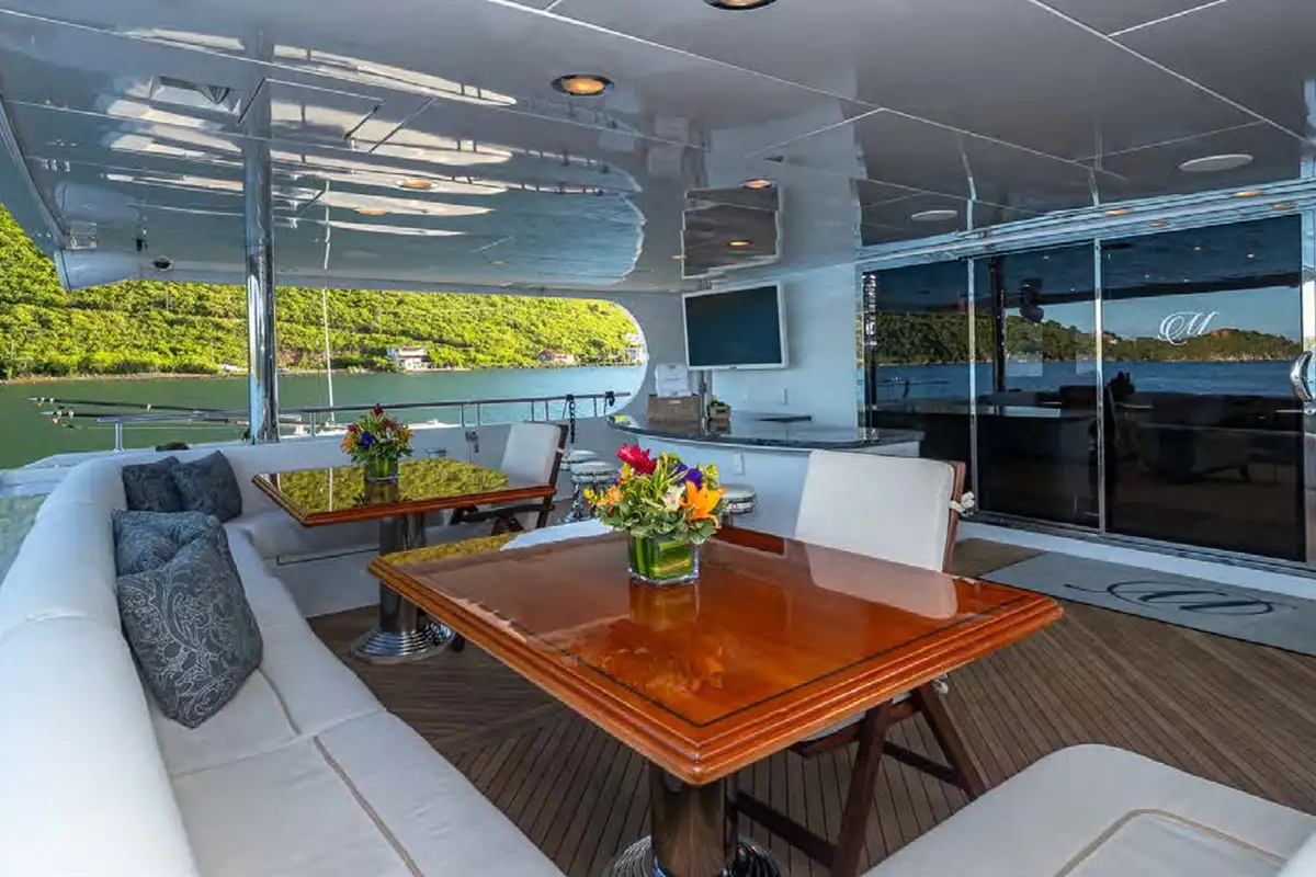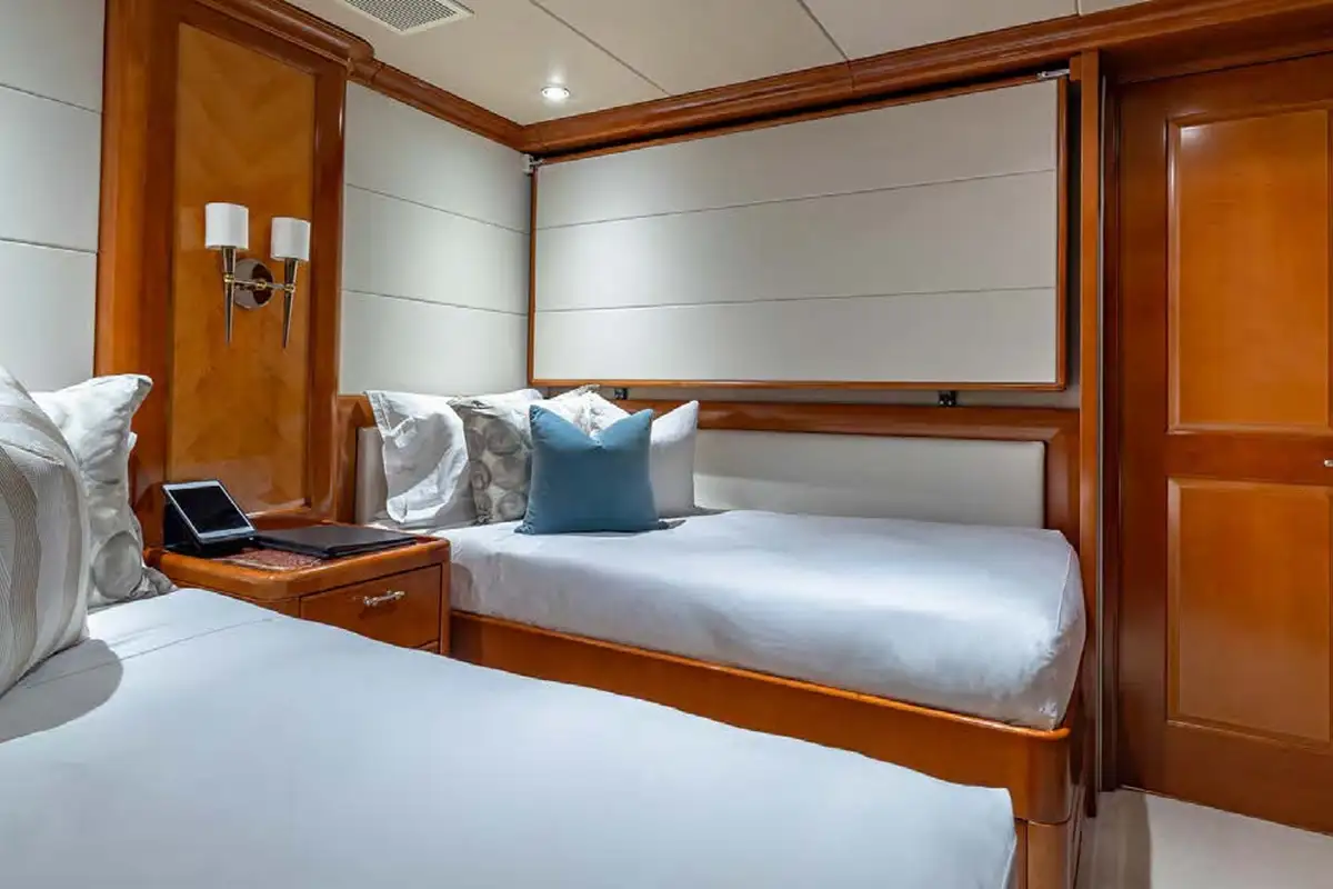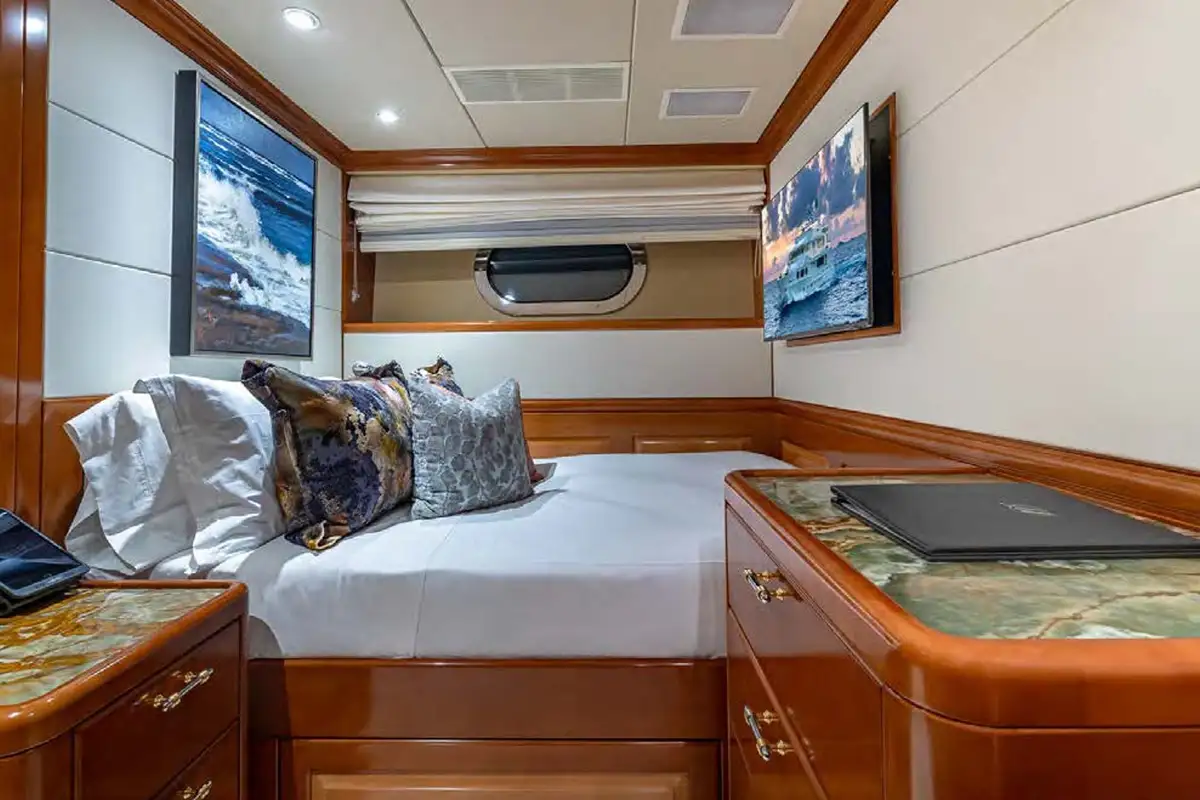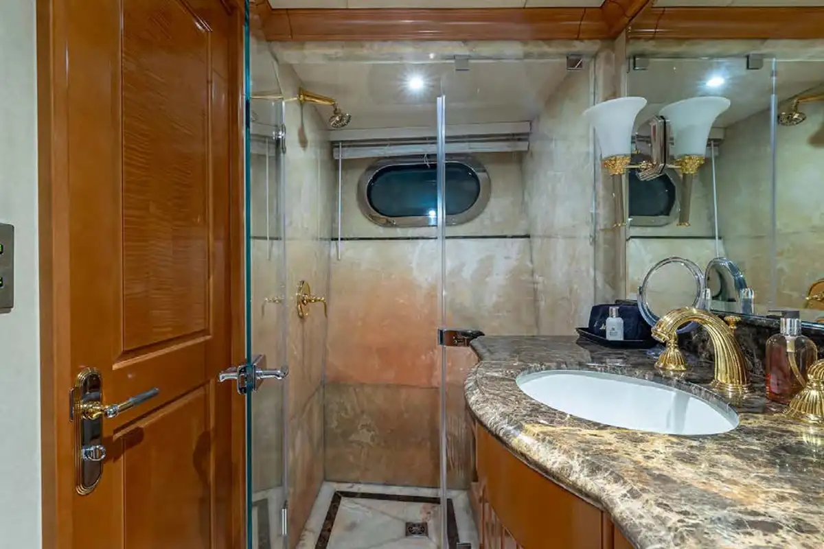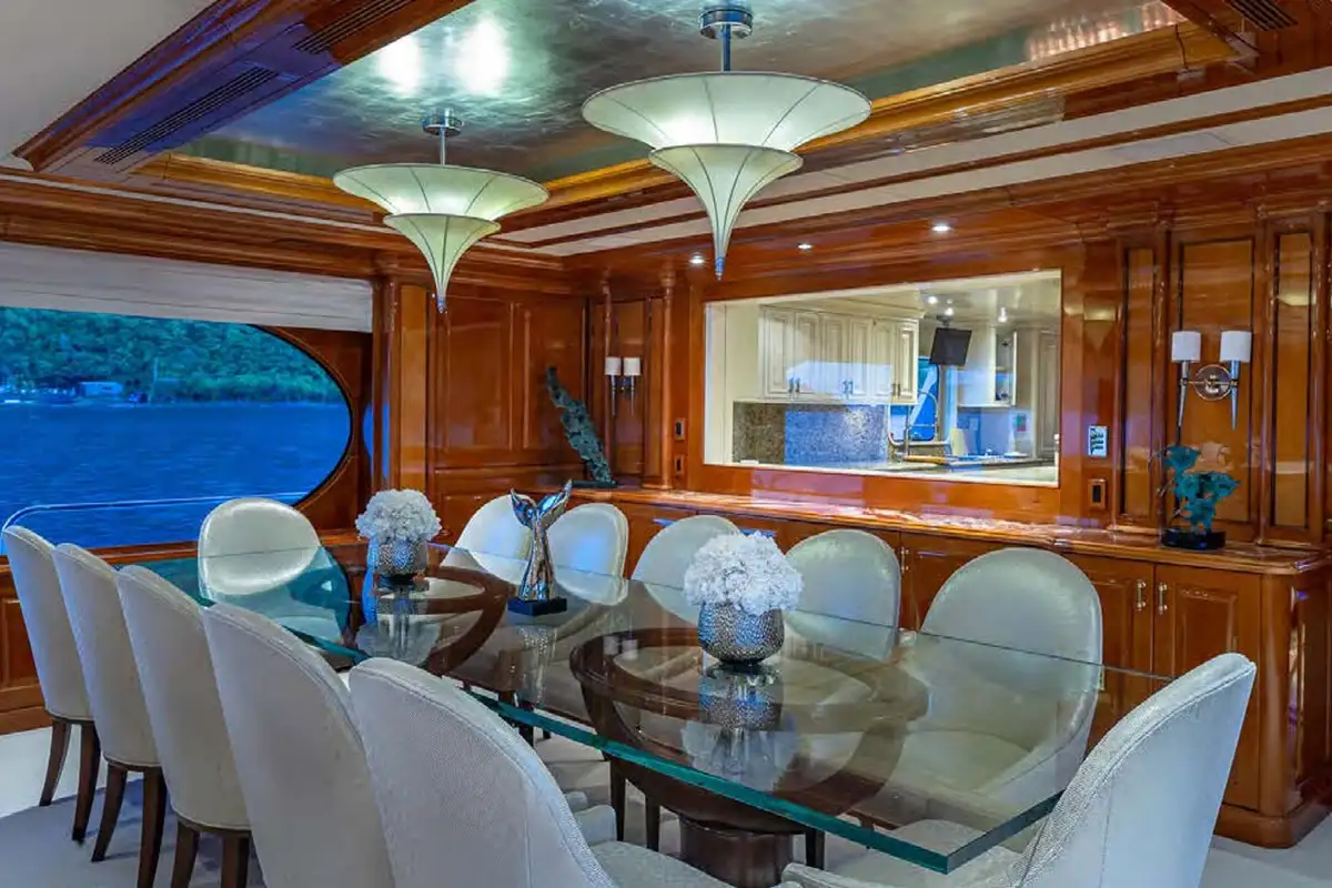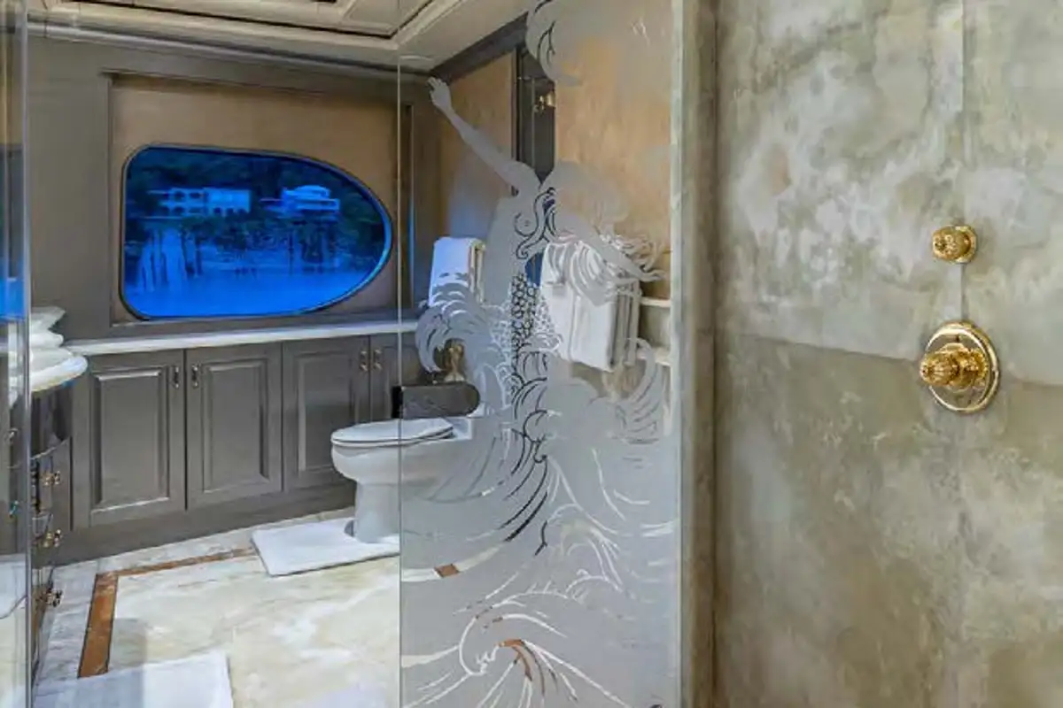 The morning sun glints off the water to welcome you as you pull up the blind over the super-sized windows in your master suite. This oasis of quiet is all yours to enjoy on the forward main deck. There are his and her bathrooms with a connecting shower room so you can quickly freshen-up, grab something light to wear and head to breakfast.