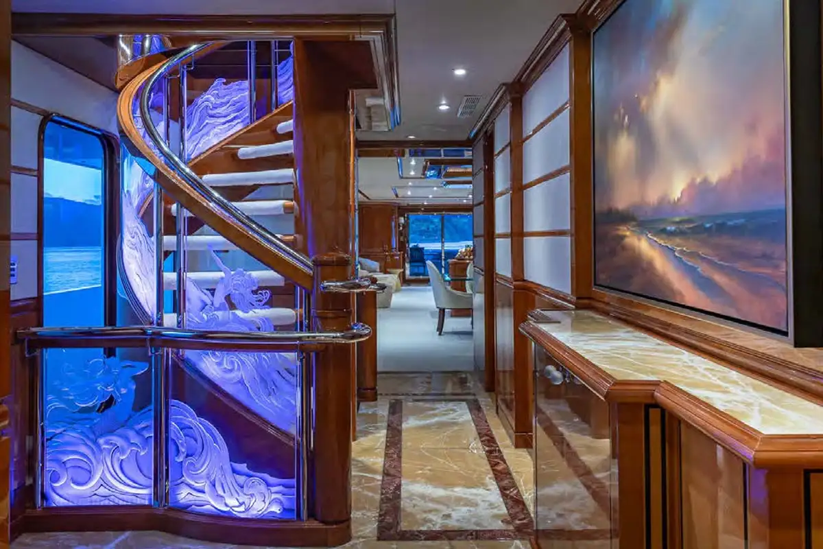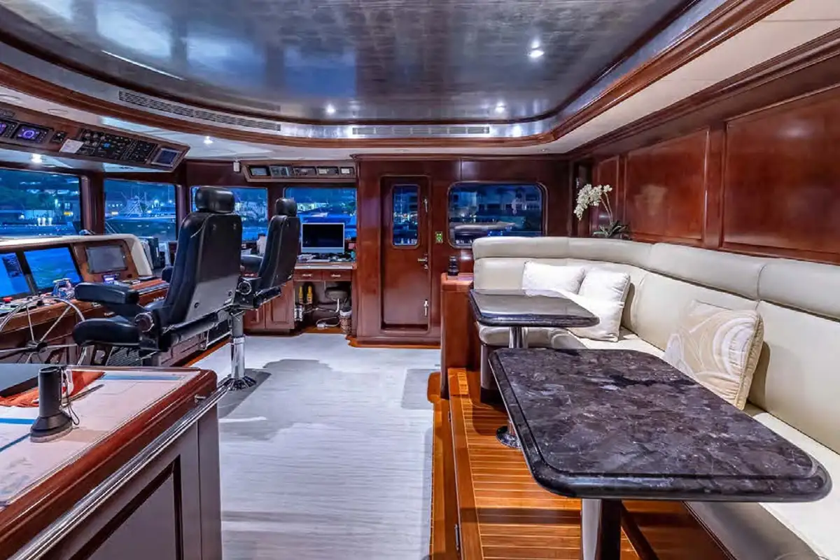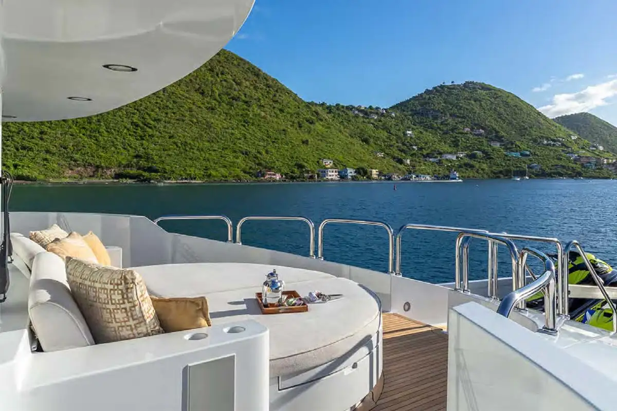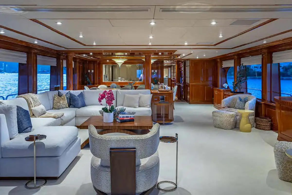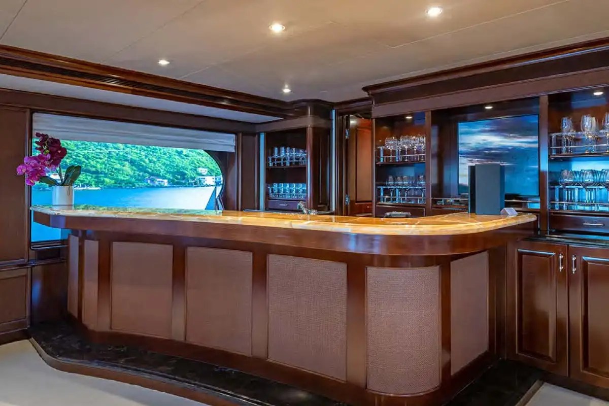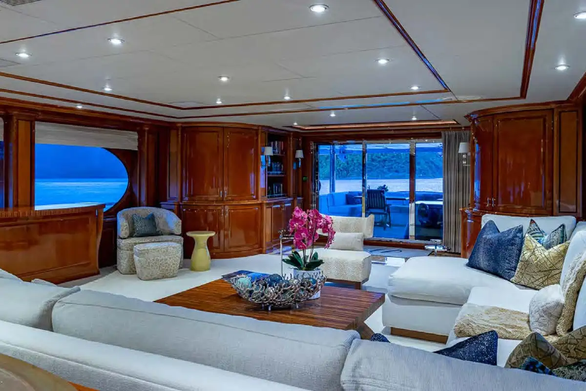 The morning sun glints off the water to welcome you as you pull up the blind over the super-sized windows in your master suite. This oasis of quiet is all yours to enjoy on the forward main deck. There are his and her bathrooms with a connecting shower room so you can quickly freshen-up, grab something light to wear and head to breakfast.