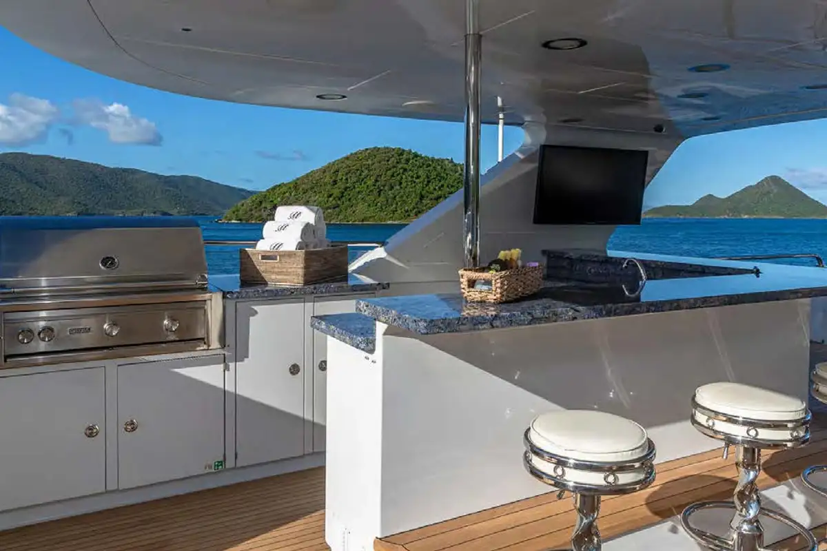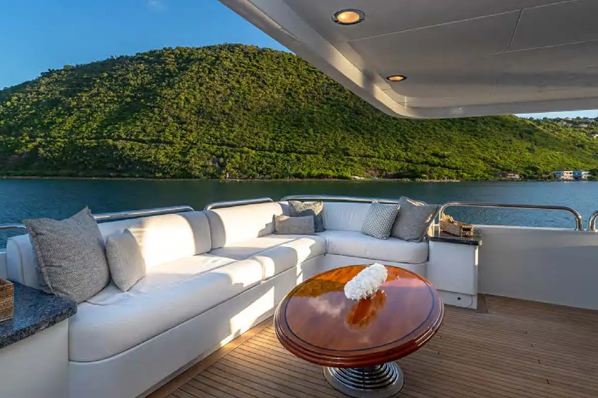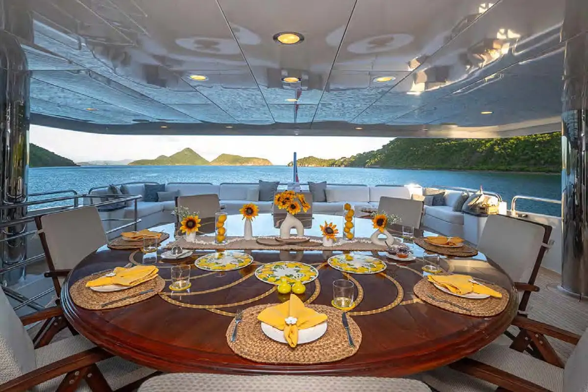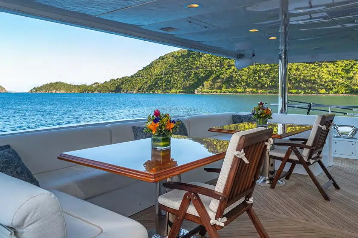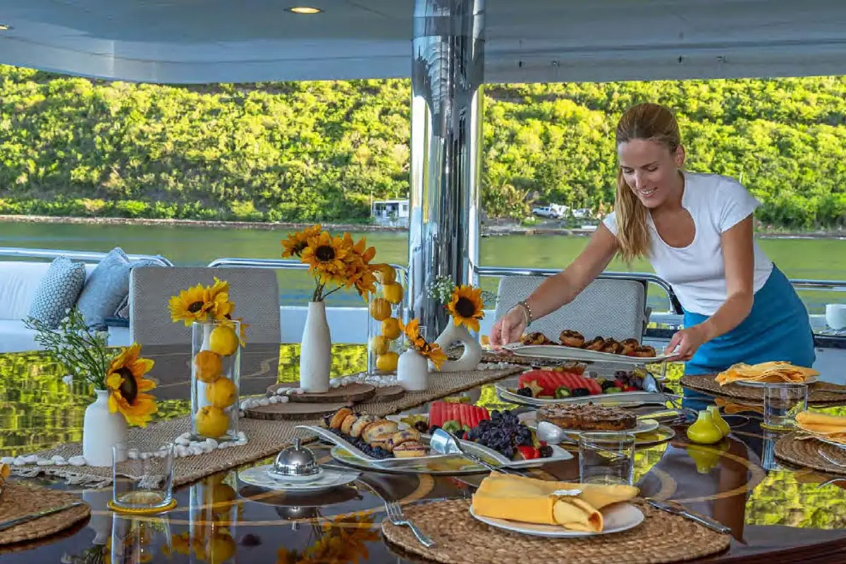 Reaching the bridge deck aft, you can hear your family and friends discussing the day ahead. The al fresco breakfast table is spread with newly-baked pastries, fresh juices and fruits. Chef is ready in the kitchen to whip up an omelette or pancakes. Aboard MILESTONE your day will start well!
