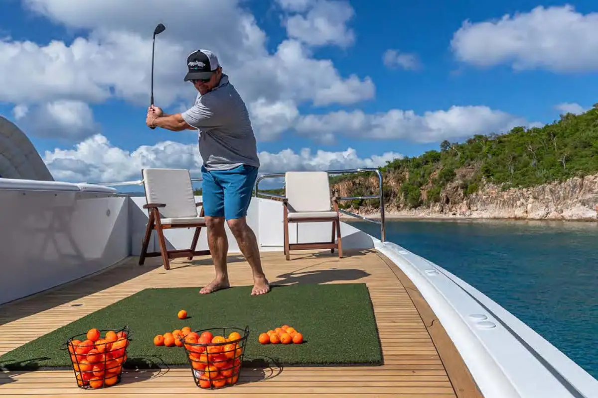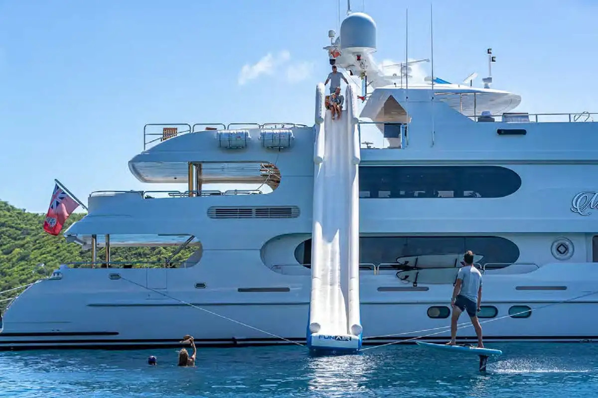 At anchor the yacht’s stabilisers ensure that everyone is comfortable. Some of your party head to the sun deck to stake a claim by the jacuzzi. Later the huge waterslide that reaches from this deck to sea will keep everyone entertained for hours, but right now up here is the perfect little sun spot to hide with a magazine.