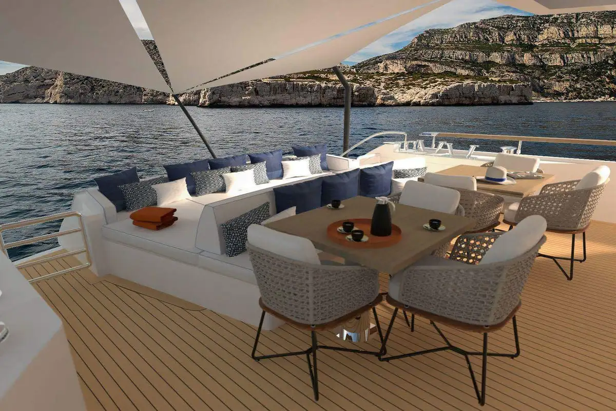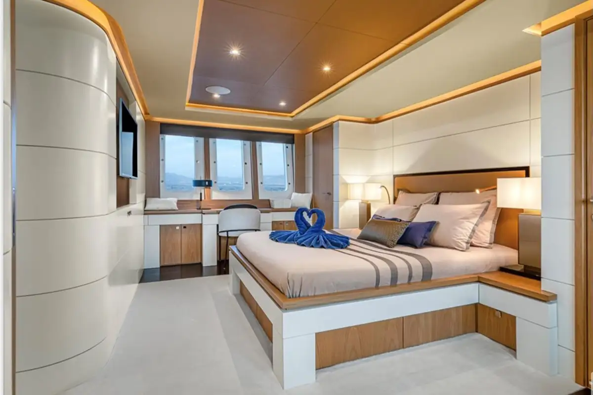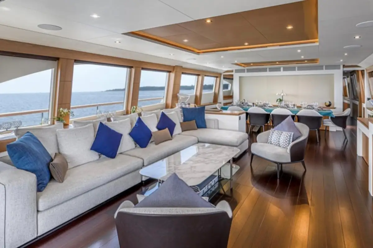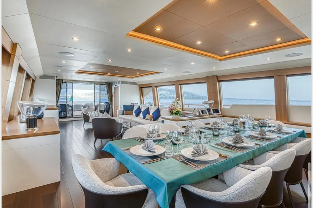After your time in the water, you may want to enjoy a fabulous meal in the spacious al fresco dining area of the cockpit. Even under the midday sun, thanks to the occasional awning, it remains a splendid location for an exclusive dining experience. It’s not the only desirable dining area on board MILLESIME, in the main deck saloon is the formal dining area. Although inside, the main saloon is lined with large windows and tastefully decorated with light furnishing. This makes the space a light and stylish area to enjoy the hospitality from the finely-honed crew while enjoying the expertise of MILLESIME’s chef.