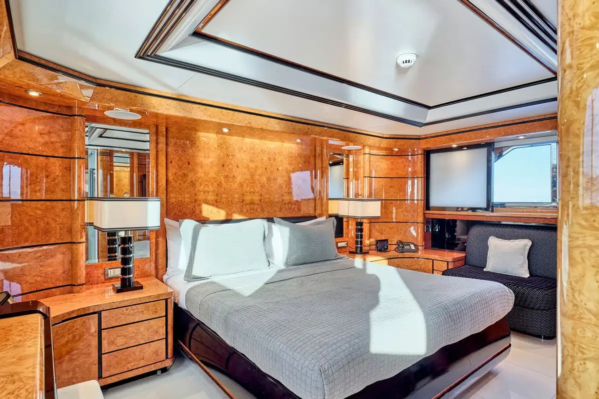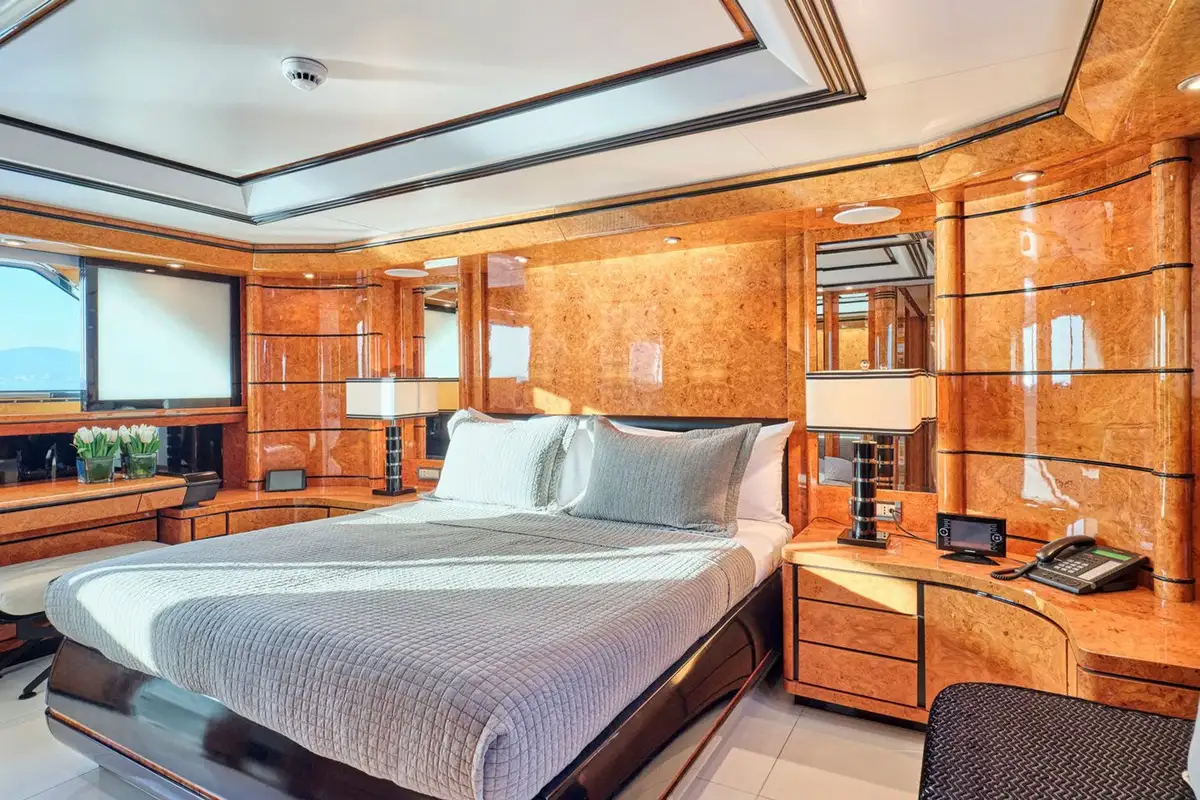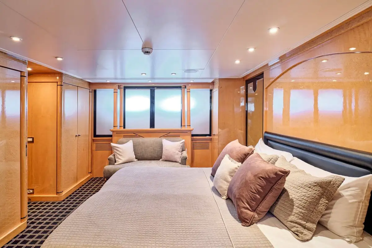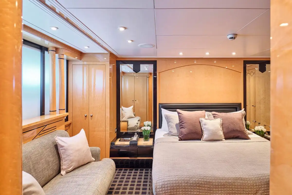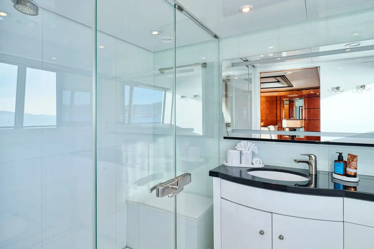 Step inside and discover bright, panoramic interiors flooded with natural light. The main deck’s lounge and master suite offer sweeping sea views, with plush furnishings and a calming palette to set the tone for total relaxation. Below, a full-beam VIP suite and two generous twin cabins – all en suite– provide a luxurious retreat for every guest.