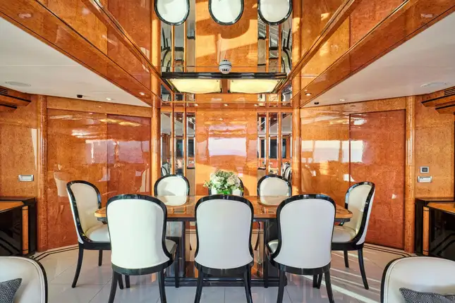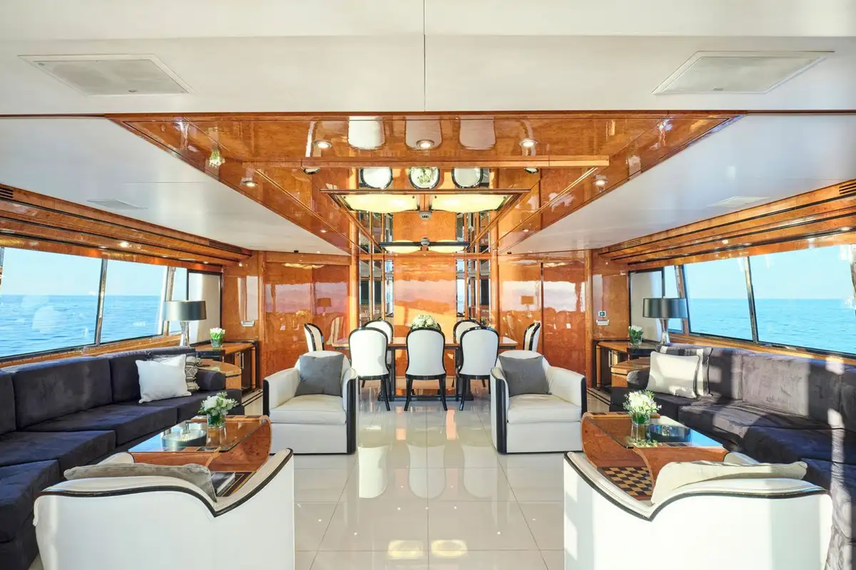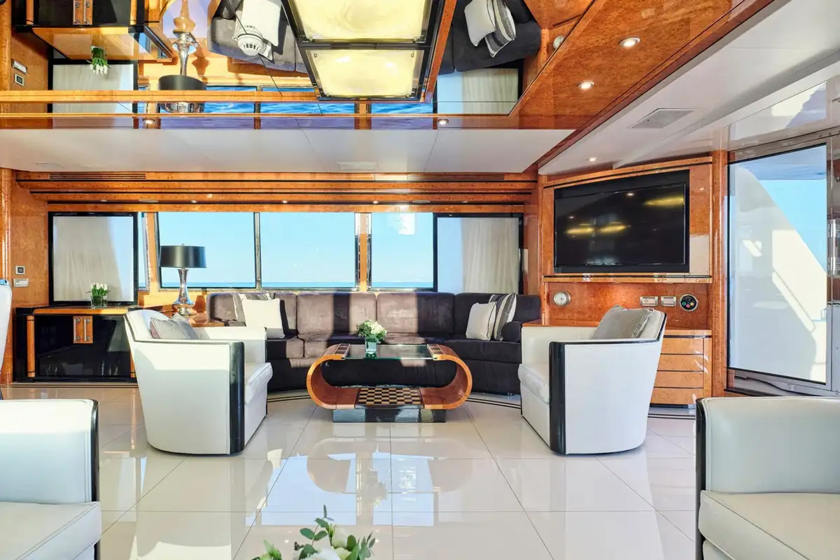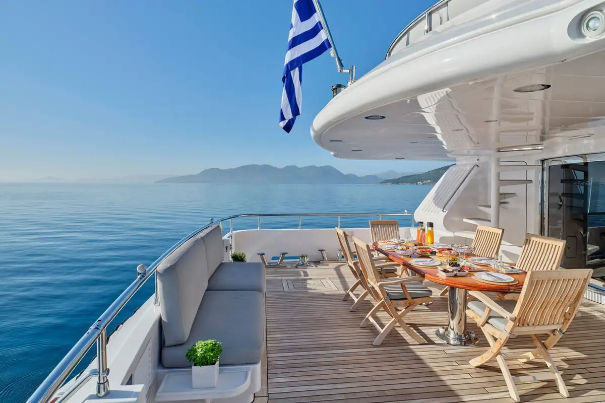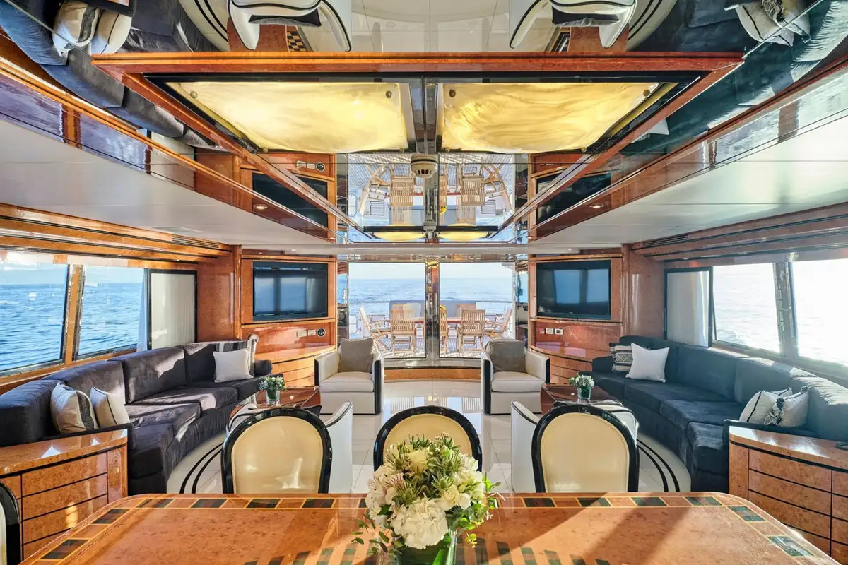 Inside, the formal dining area and adjoining lounge are ideal for hosting elegant dinners or quiet movie nights, complete with satellite TV and a surround-sound system. Whether you're cruising secluded cove or anchoring off a quiet beach, the experience is entirely yours.