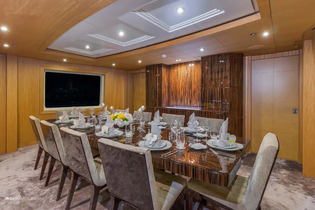 Returning to the main deck, there is a large al fresco lounge area beneath the basketball hoop – the furniture is cleared when you want to go one-on-one. Entering the main saloon you’re met by the impressive backlit onyx and the gorgeous lounge space. Ahead this is the glass staircase that leads up to the owner’s deck or down to the guest accommodation. Ahead of this is the formal dining area, where MIZU’s professional chef with delight you and your guests with their culinary creations, served on the impressive Macassar ebony dining table.