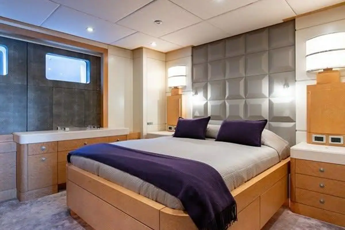 Your wonderful master suite is found on the owner’s deck. Stunning Macassar ebony furniture provides contrast against the lighter wood interior giving a classic feel with a modern twist. Light floods through picture windows, their size provides a sense of place. The large bathroom gives you beautiful en suite facilities: his and hers sinks a spa bath, and a separate shower compartment. You may often find a bath in an owner’s bathroom, perhaps even one in the VIP suite too. On MIZU, however, every one of the five suites on board (one master suite, two double suites and two twin-berth suites) has en suite facilities featuring a bath, every suite also includes a desk/dressing table. The guest suites are stylish and modern, contemporary with a cosy relaxing feel.