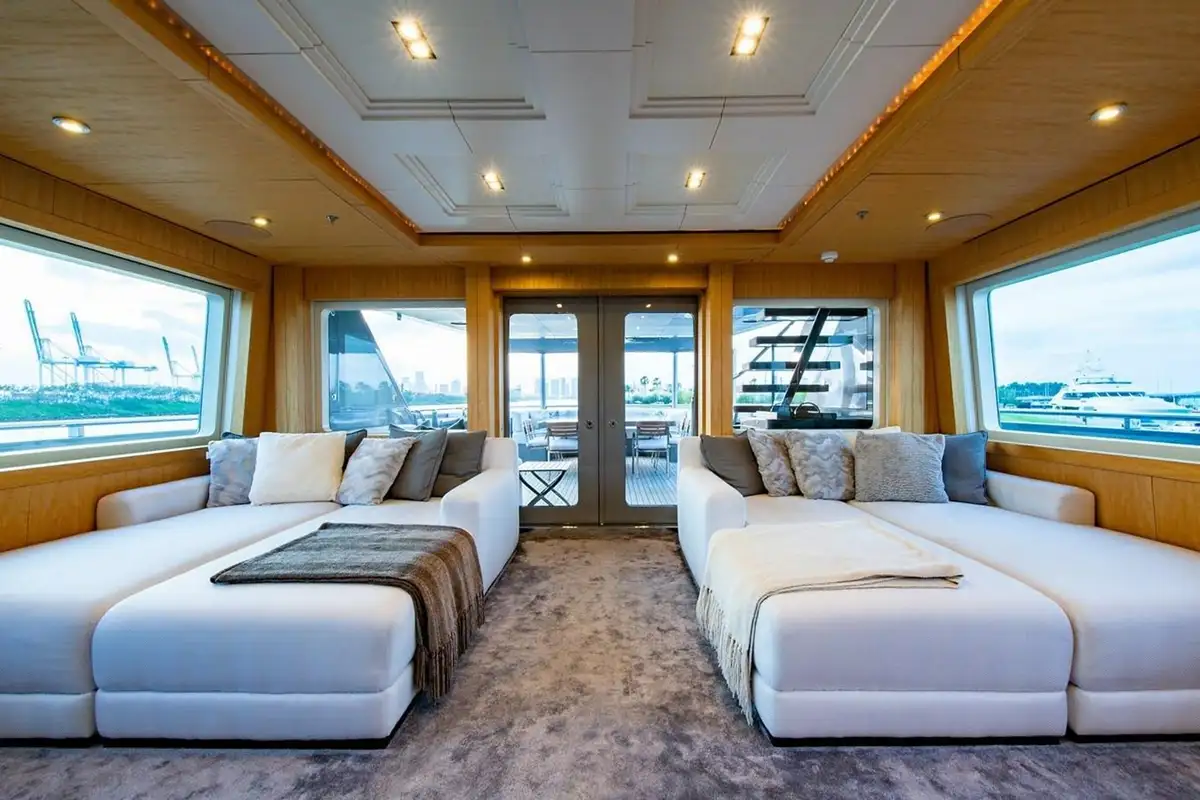 The sun deck is the area most guests migrate to. With a full-width sunpad and aft deck of sun loungers, a forward wet bar, and the 14-person jacuzzi between them, it’s not difficult to understand why. Ahead of the bar is the flybridge. Here the helm station can be concealed creating a private observation deck for you.