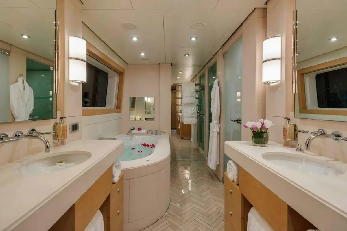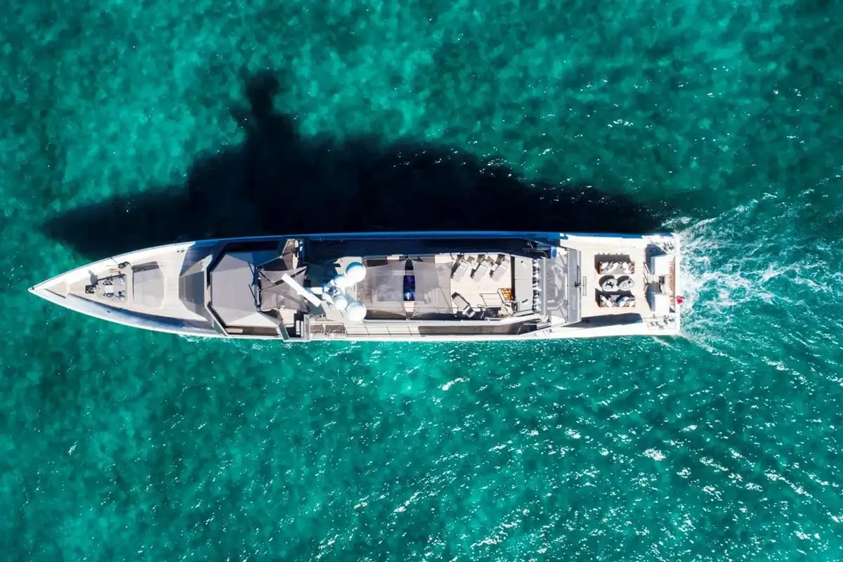 Don’t let MIZU’s sleek battleship-esque appearance fool you. While she might look like a futuristic naval frigate, MIZU is a 100% luxury yacht with many surprises within. With a range exceeding 4,500NM, a top speed of over 30 knots, a 14-person jacuzzi, an owner’s deck and even a regulation basketball hoop and backboard, your guests will be left stunned by all she offers.