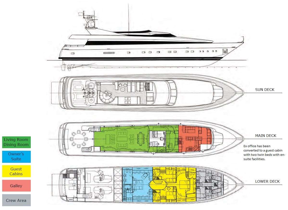 The guest cabins are all on the lower deck, which allows for a much larger main deck lounge. The master suite is amidships and the VIP suite in the bow; both of these are full-beam cabins with seating, desks, and bathtubs and twin sinks in their en suite bathrooms. The other guest cabins are a double and two twins, one of which has an extra pullman berth. All of these have private en suite bathrooms.