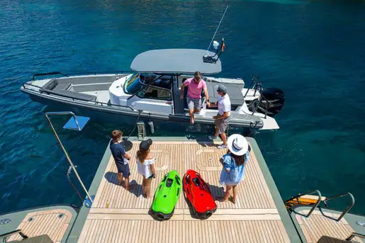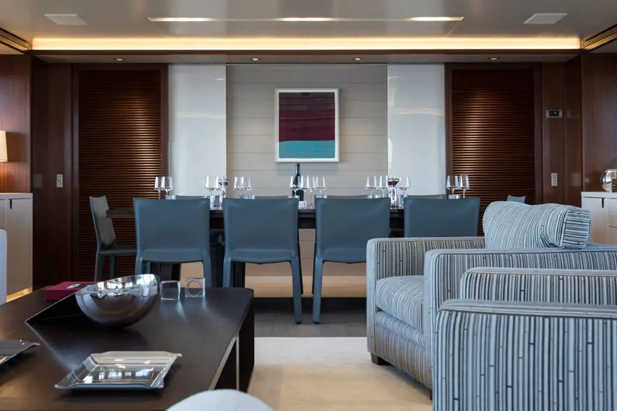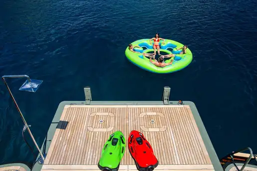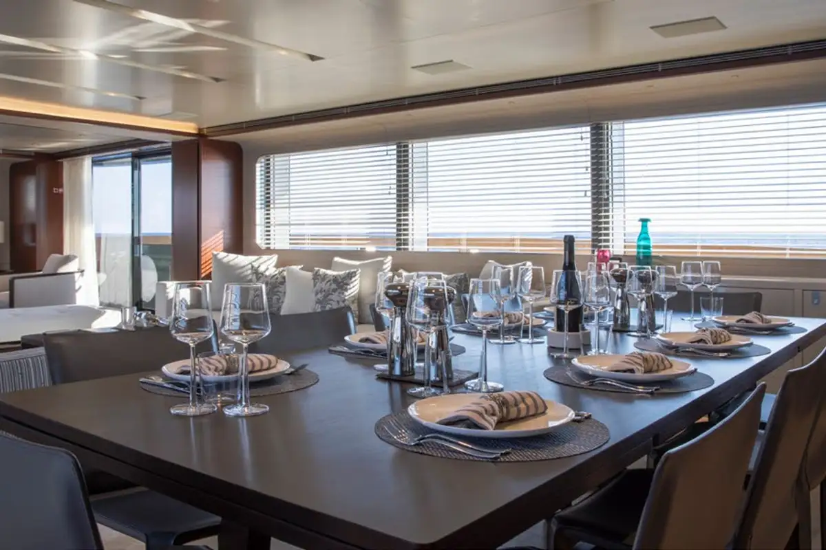 While away a few hours relaxing, perhaps squeezing in a workout in the onboard gym, before heading ashore to explore. Other guests might prefer to mess about with MOKA’s toybox, including a large inflatable slide and plenty of towable toys for both adults and children. As the sun begins to wane, head inside to freshen up for dinner. Over-sized windows allow daylight to stream throughout the interior, while a light-coloured palette further enhances the sense of space and calm. Enjoy the ambience with a pre-dinner drink at the sky lounge bar, before choosing either to dine on the upper aft deck, where there is also comfortable seating for a post dinner nightcap, or in the formal dining area on the main deck.