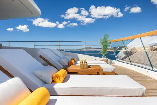 For those looking for a little privacy, the upper deck has a large seating area aft from which you can enjoy the views. Alternatively, you could step up on the sun deck, lie back on the daybeds and take in the location from the highest point aboard. Lunch can be enjoyed either beneath the shade of the arch on the sun deck, or beneath the awnings on the upper deck. Both areas are well suited to al fresco dining and allow up to 10 guests to come together and enjoy the menu. The cuisine offered on MOKA is both light and nutritious, with dishes inspired by locally sourced, seasonal produce from the Mediterranean.