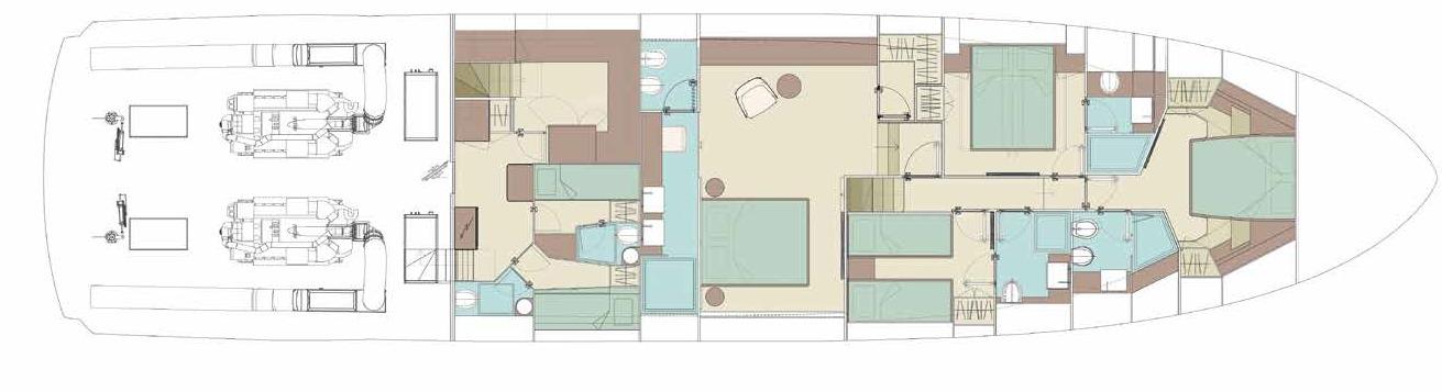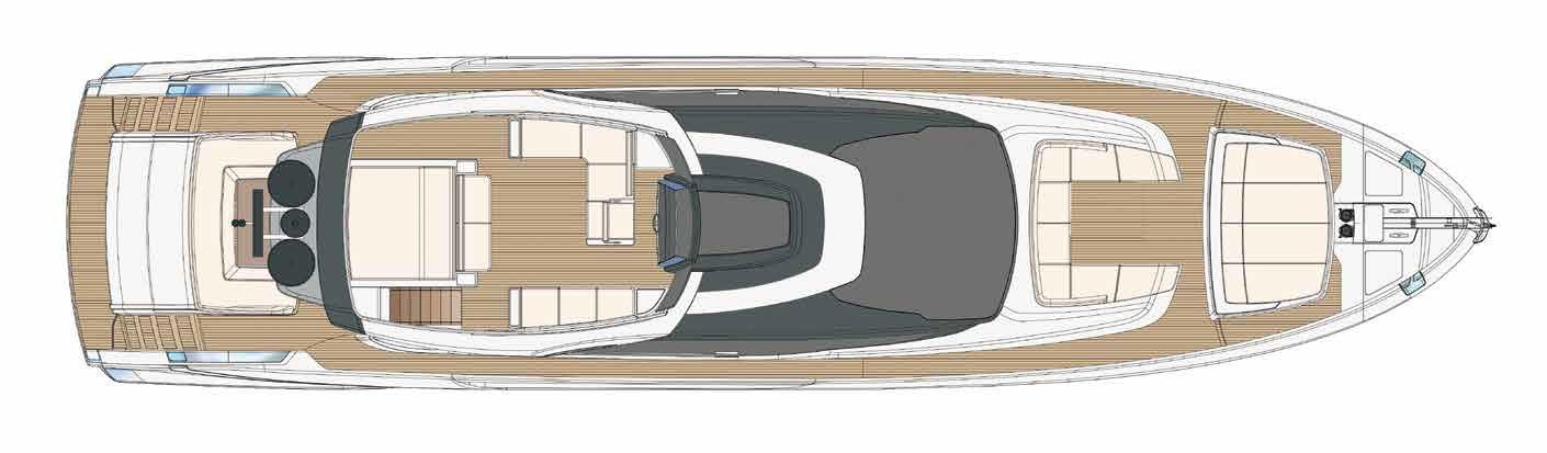 Her expansive exterior decks are thoughtfully arranged for both relaxation and entertainment, and is the perfect space to take in all of the splendour that the ocean has to offer. Heading up to the flybridge, you'll find a comfortable seating arrangement with a sunpad, and below there is a spacious aft dining and seating area, suitable for al fresco dining in the shade. What's better, is that this area is also convertible into another sunpad, perfect for cooling off after a swim. The foredeck, with its wide expansive views and seating, offers the perfect location for a sunset cocktail.