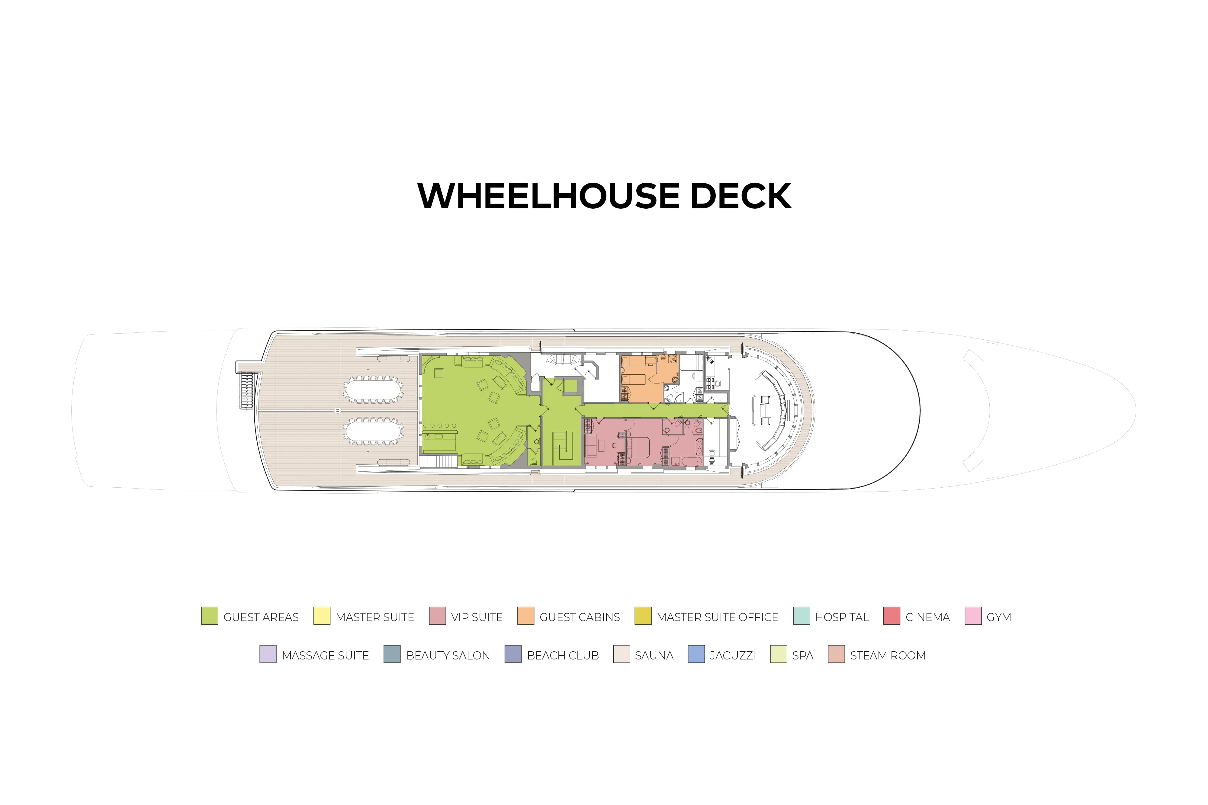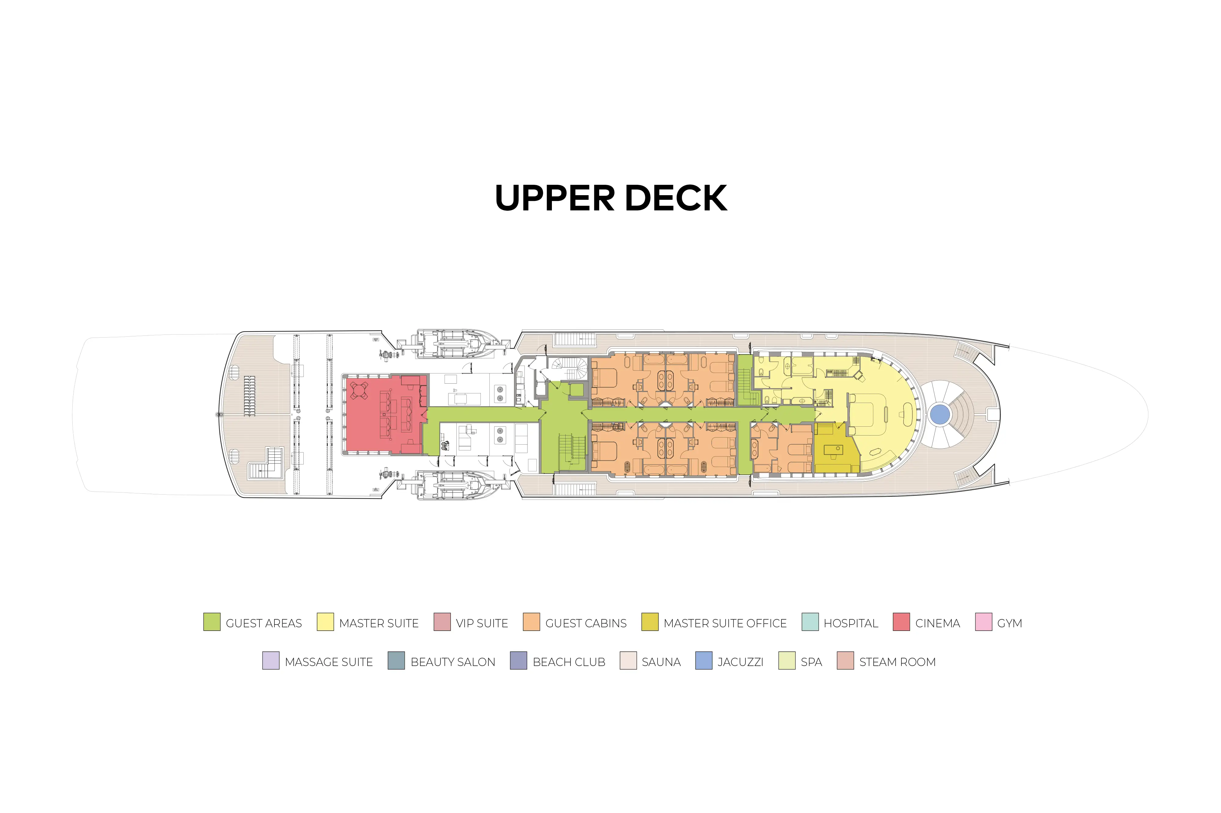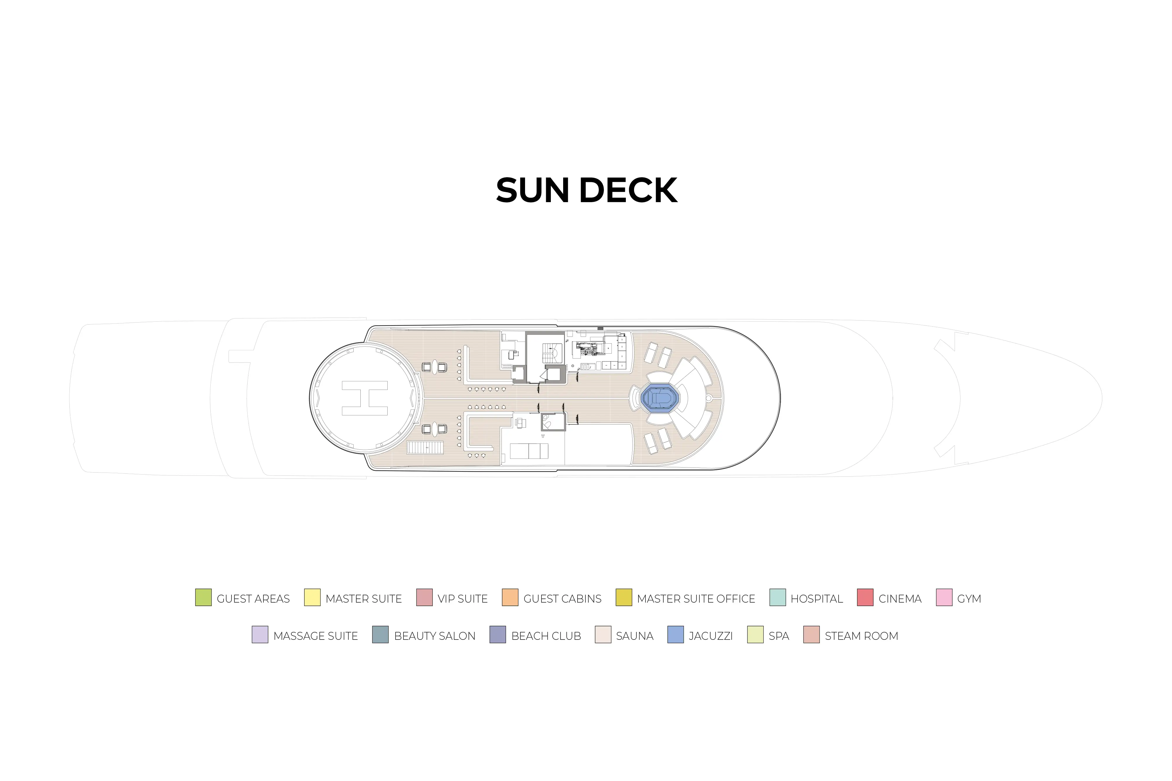 Her endless feature list includes an elevator serving all guest decks, a 3D cinema, a sun deck bar and jacuzzi, a private jacuzzi with sunbathing on the owner's private deck, a beach club with bar and an intimate balcony for two as well as stabilisers that ensure comfort on board whether at sea or at anchor.