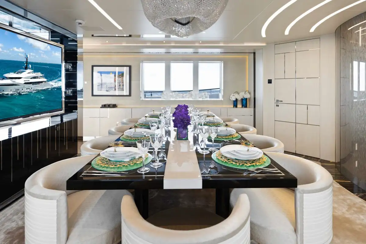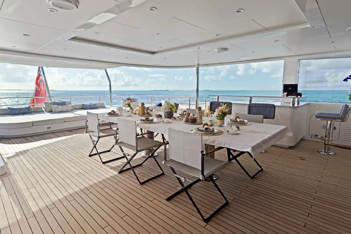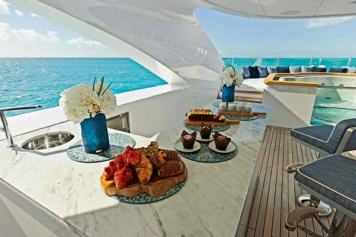 When it comes to dining, MOONRAKER provides two superb locations to enjoy the creations of her talented and professional chef. There’s an al fresco formal dining area in the cockpit and another forward. To enjoy the scenery accompanied by great conversation and a warm evening breeze, the cockpit is ideal. For more social occasions, you can gather at the forward dining area, watch the chef create your meal at the galley bar, and then relocate to the dinette to appreciate their expertise with your friends and loved ones.
