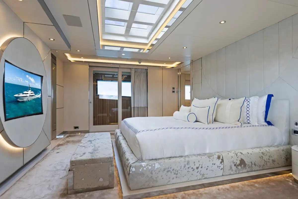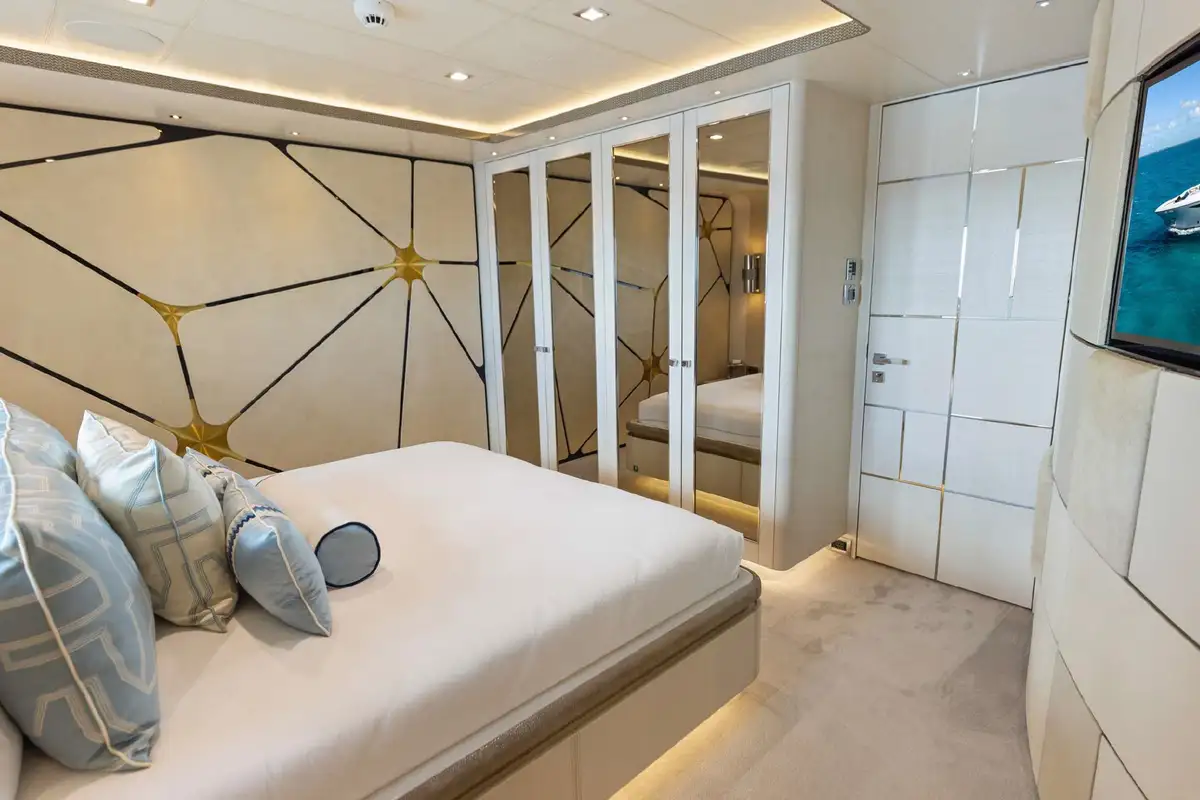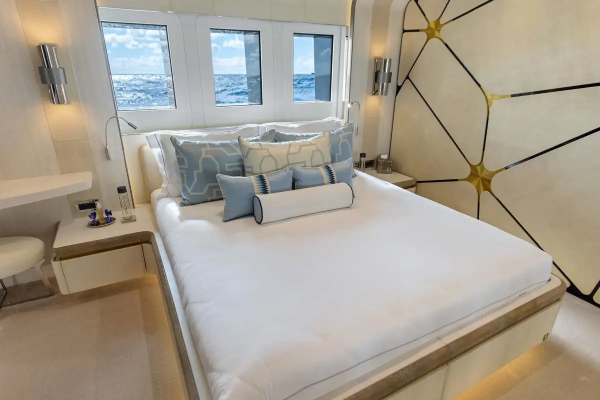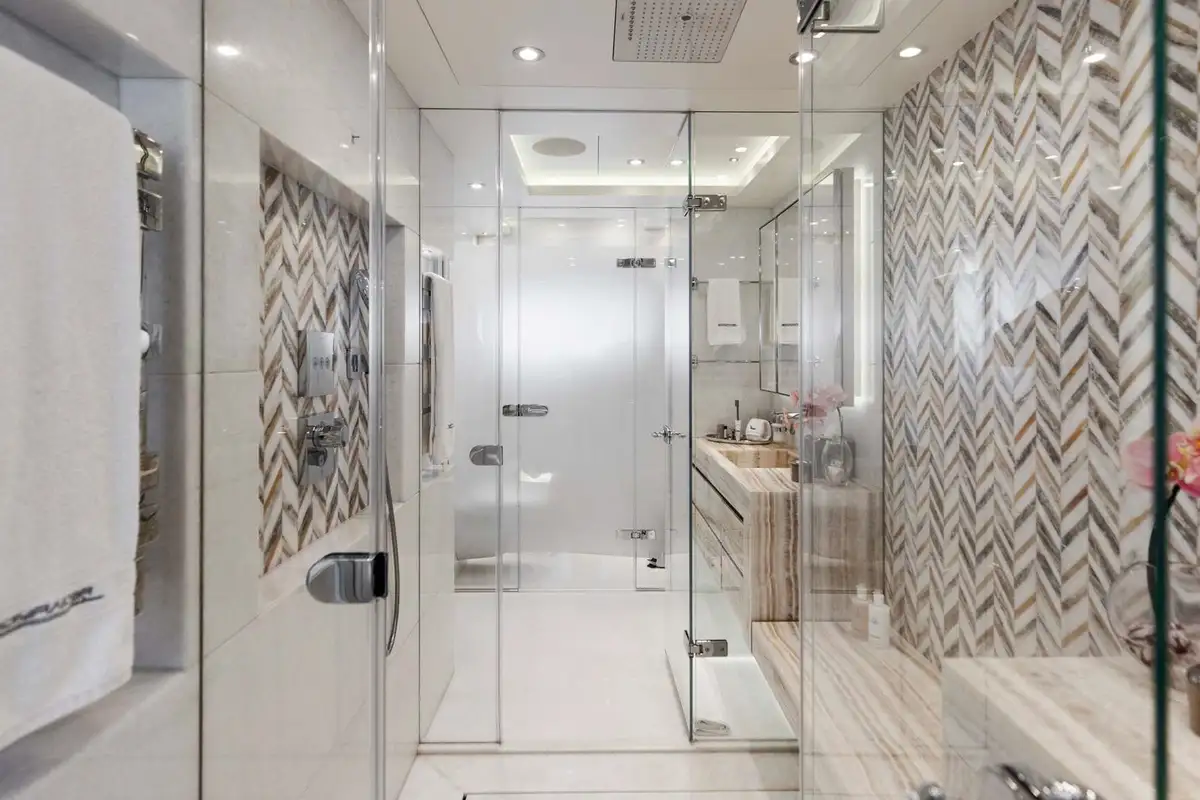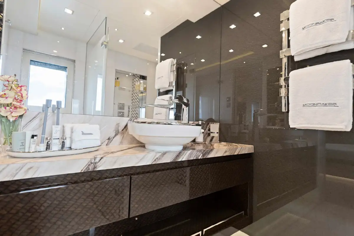 On MOONRAKER, you’ll find all the guest suites on the lower deck. To the rear is your palatial full-beam suite. Its large circular berth is to starboard, and there are walk-in wardrobes and a marble-lined en suite bathroom to the rear. Also on this deck, your guests are treated to a choice of two double suites and a twin-berth bunk cabin, making MOONRAKER a great choice for a family or group of all ages.