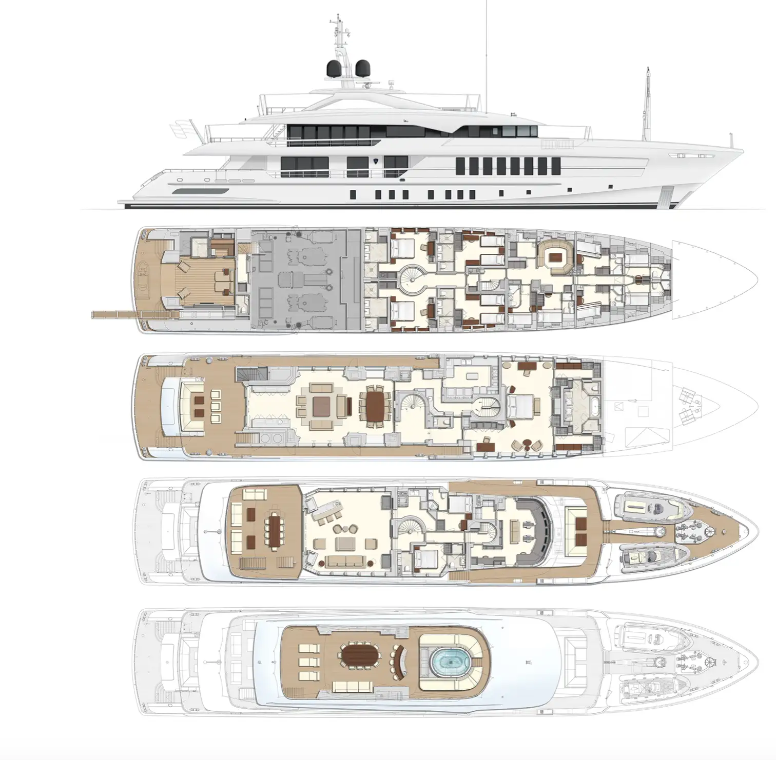 Size isn’t everything in superyachts, the quality of the living space is equally important. The world class expertise of the Bannenburg/Heesen design and build team shines through in the perfect proportions and ergonomics of the outdoor spaces on board, from the sundeck’s infinity-style jacuzzi pool and the breezy foredeck lounge to the cool, relaxing shade of the two aft decks and the chic, spacious beach club and sauna.