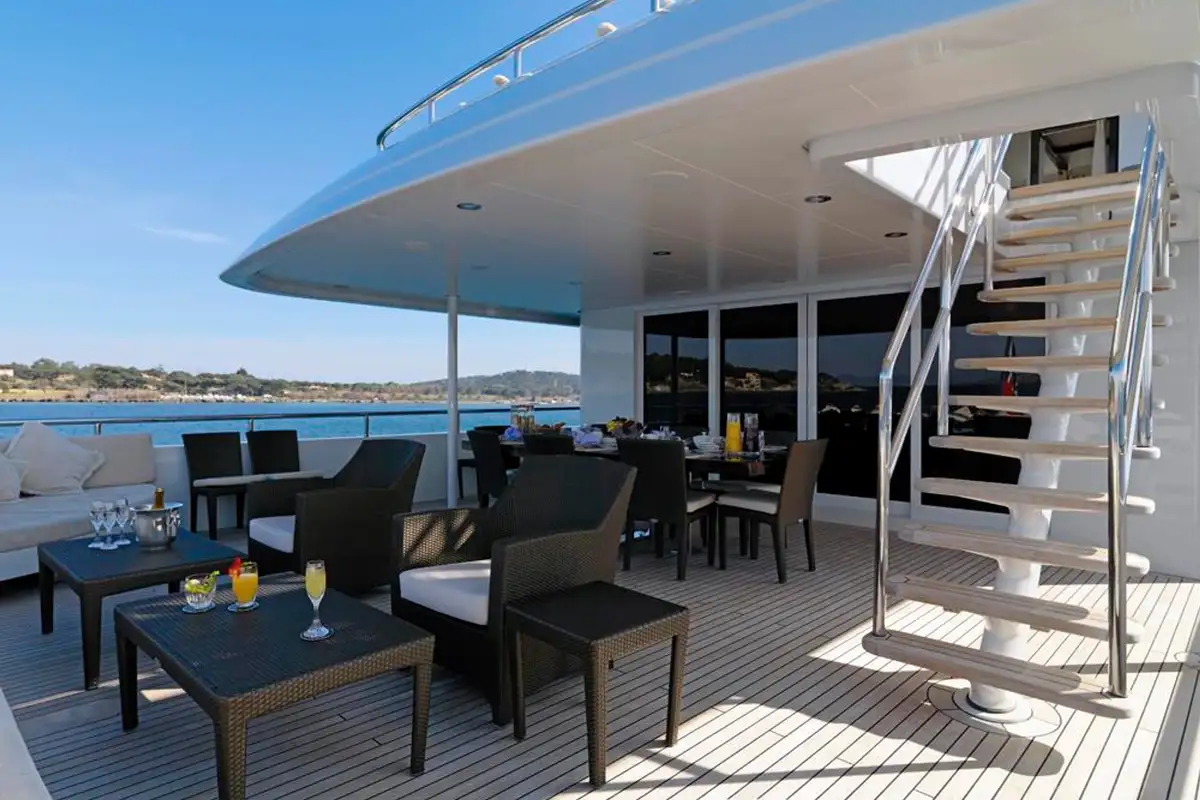 Designed for al fresco living, the 45.6m (149.6ft) MY LITTLE VIOLET is a wonderfully social yacht to charter. Her guest areas are modern with a traditional air of fine materials and wooden panelling, her exterior is vast and communal, and she has water sports and diving equipment to make the most of your time on board.