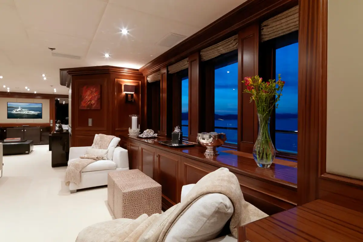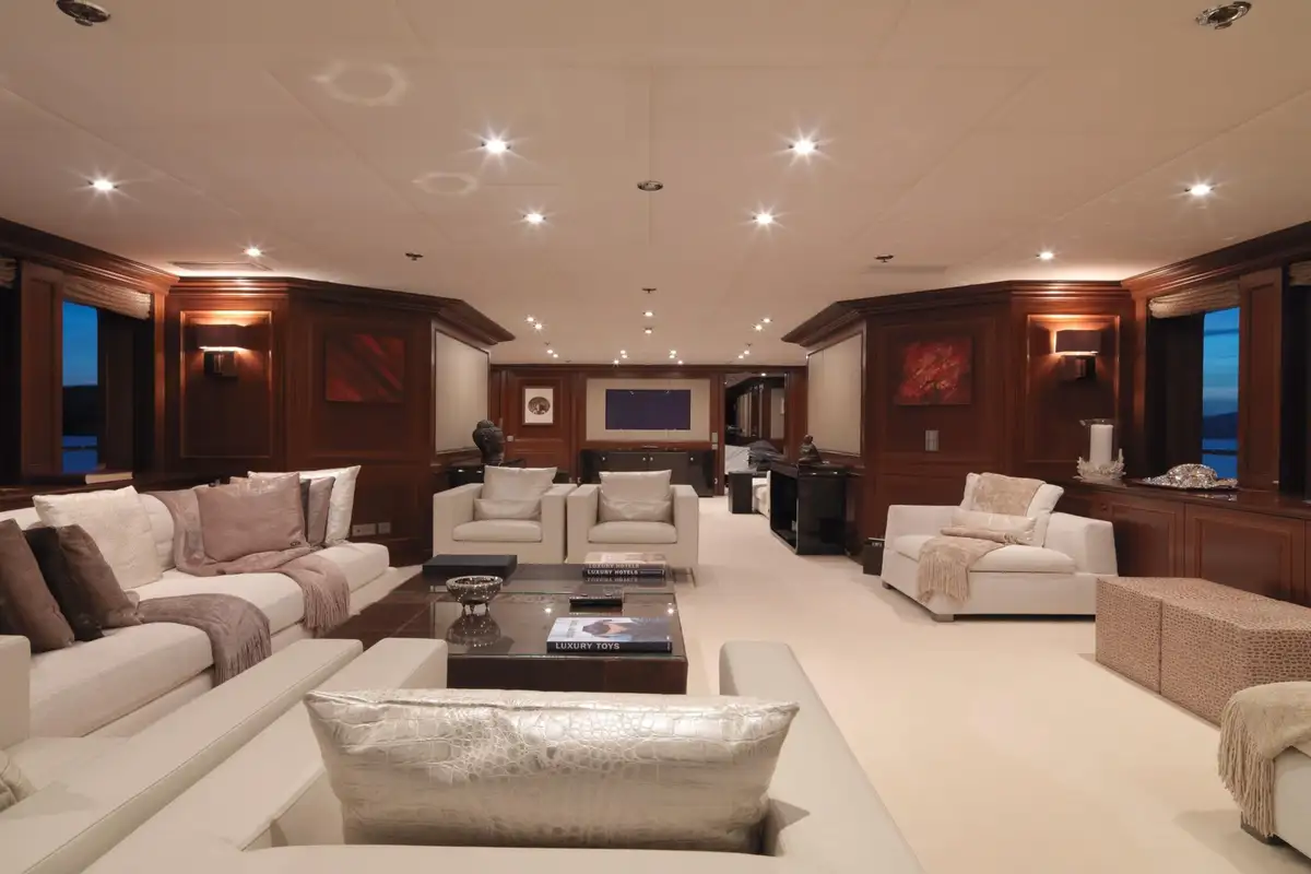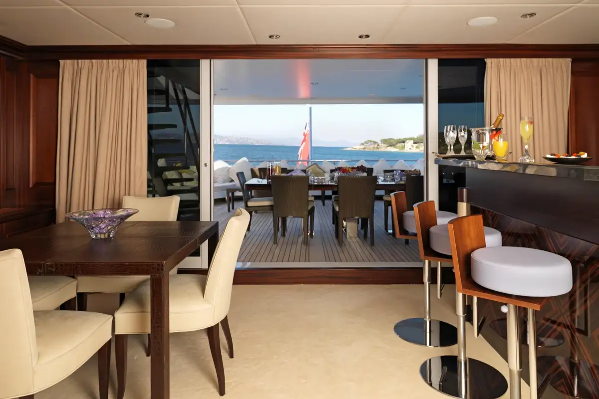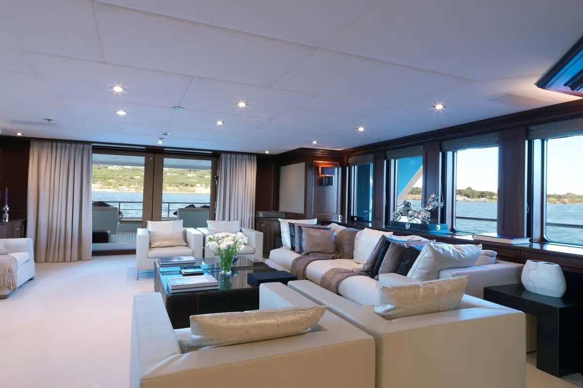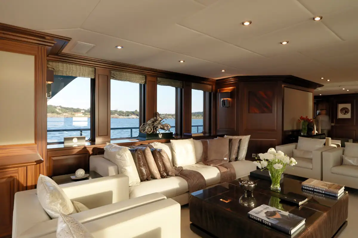 On the main deck, there is a lovely al fresco lounge area. It has relaxing, aft-facing sofas where you and your friends can wake-watch and take in your fabulous location. Passing through the floor-to-ceiling glazed doors, you enter the enchanting main saloon, here there are cosy sofas and armchairs aplenty for you and your guests.