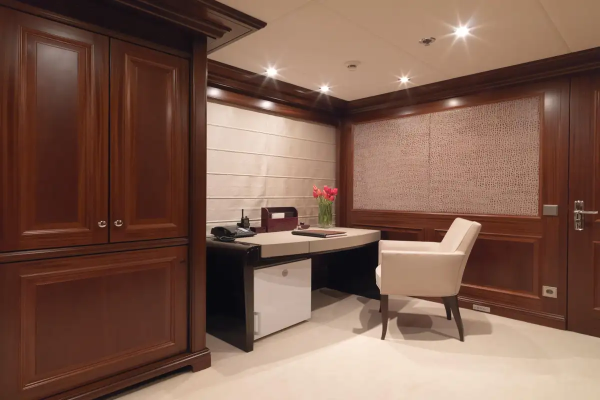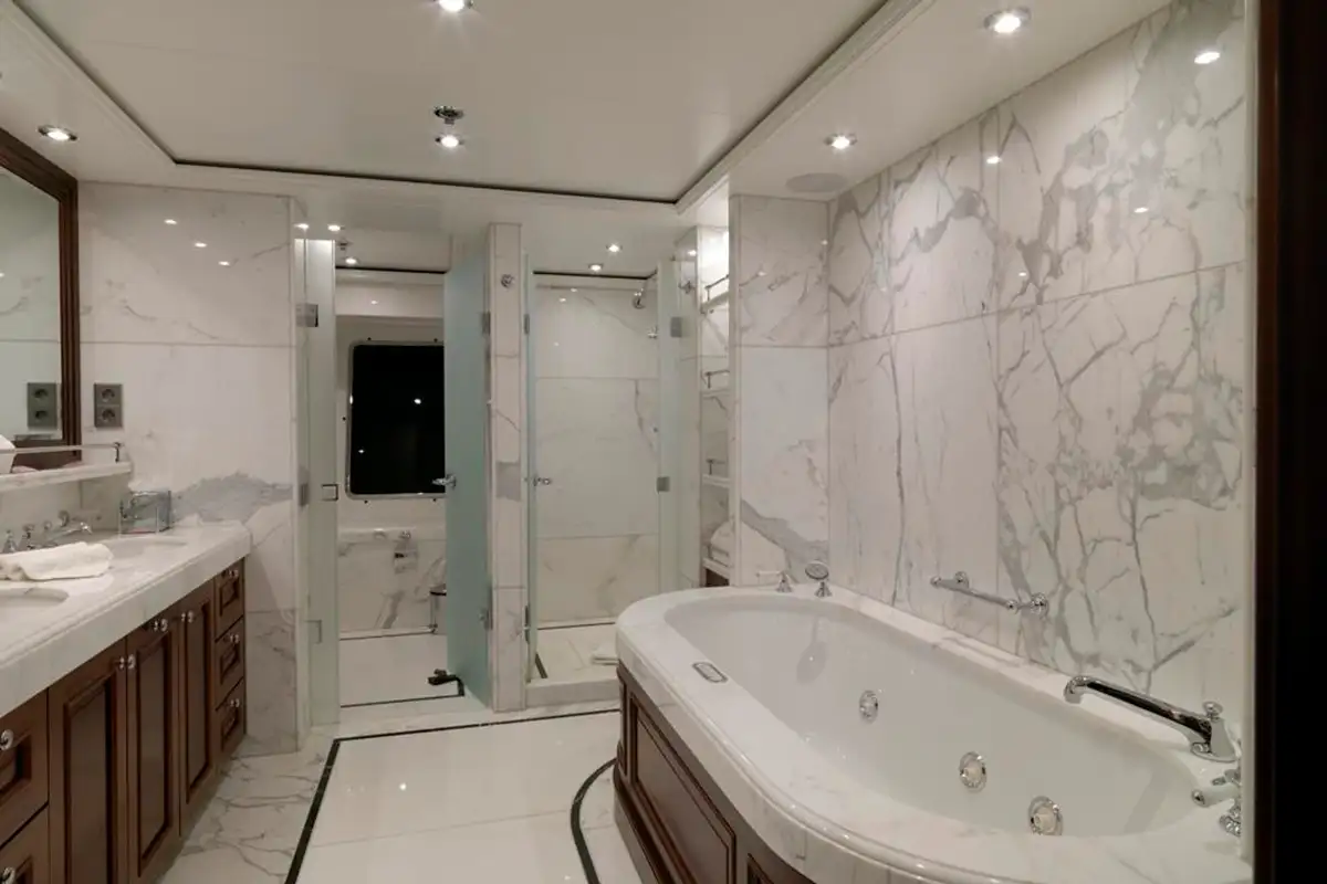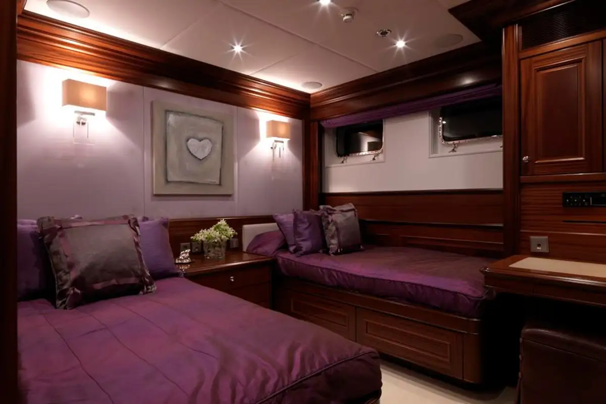 All of MY LITTLE VIOLET’s suites feature satin-varnished dark wood contrasted with neutral cream-coloured fabrics and furnishings, creating a pleasing and relaxing atmosphere to retire to after a day packed with much to remember. The palatial master suite is forward on the main deck, it has three large vertical windows that give you an unrivalled onboard view over your anchorage. It also has a spacious marble-furnished en suite bathroom with a private jacuzzi and dressing room. The lower deck guest suites are all beautiful, and they give your party three double berth suites and a twin berth suite to choose from.