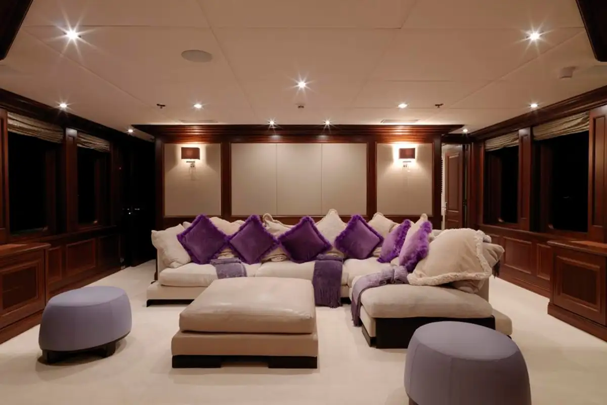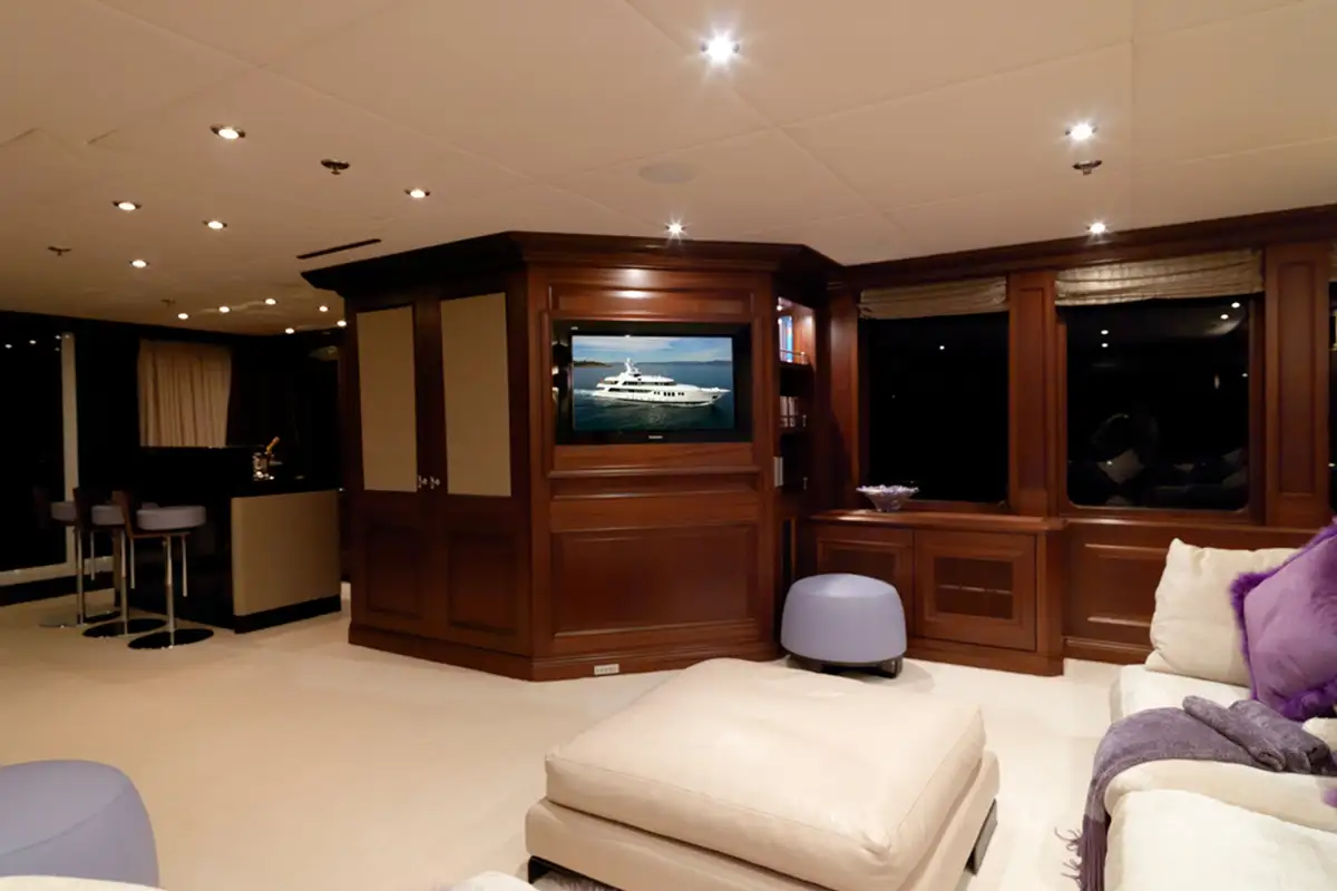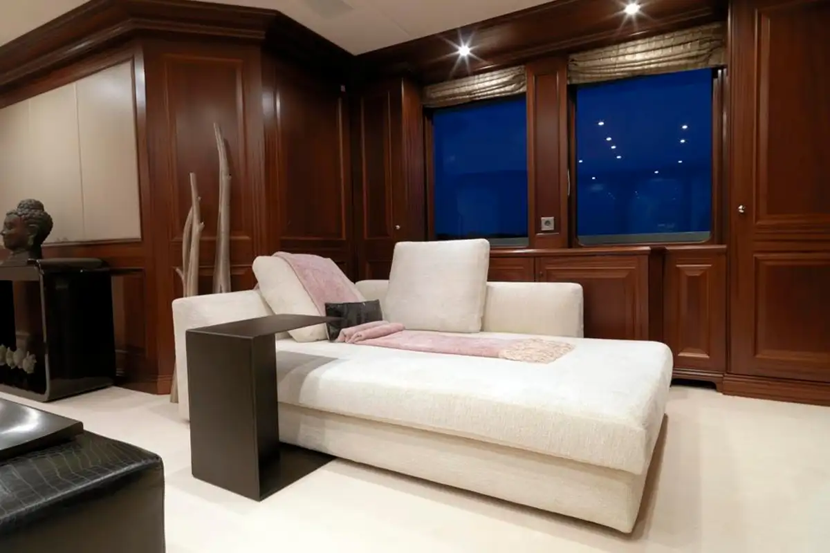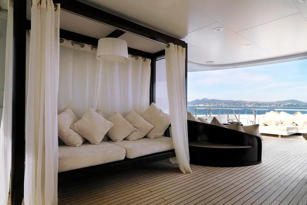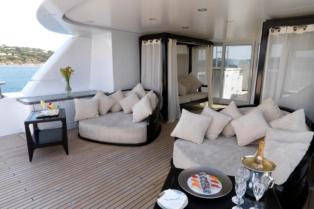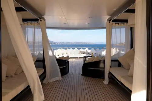 You will be drawn to MY LITTLE VIOLET’s superb sun deck. Here, you can relax on the sofas or sunpads to the rear, enjoy a drink at the bar or just relax in complete privacy on the curtained daybeds.