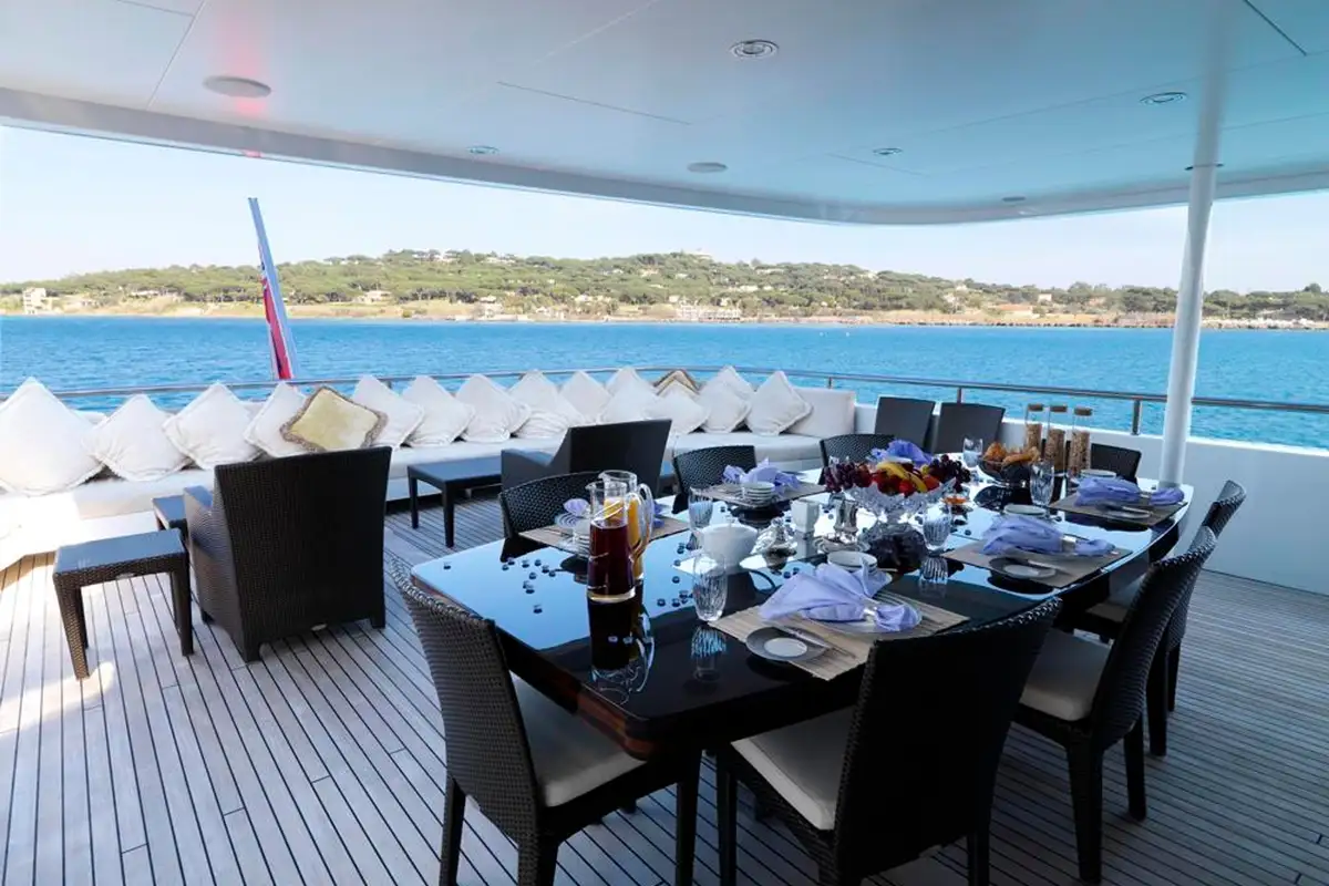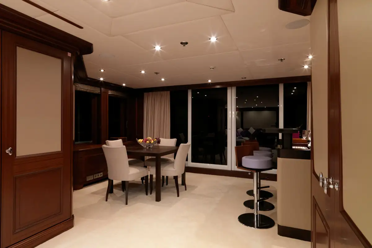 The social hub on board is the sky lounge, here you have an elevated view of your surroundings, a bar area – perfectly located for pre- or post-dinner drinks, and plush sofas to watch a movie. The aft deck, a few steps away, has an al fresco lounge area and the shaded formal dining area. It’s here that MY LITTLE VIOLET’s accomplished chef will delight you and your guests with fine cusine creations.