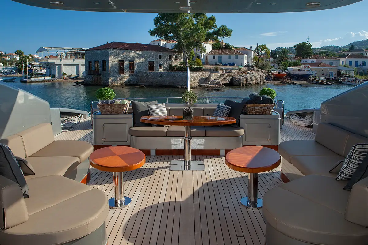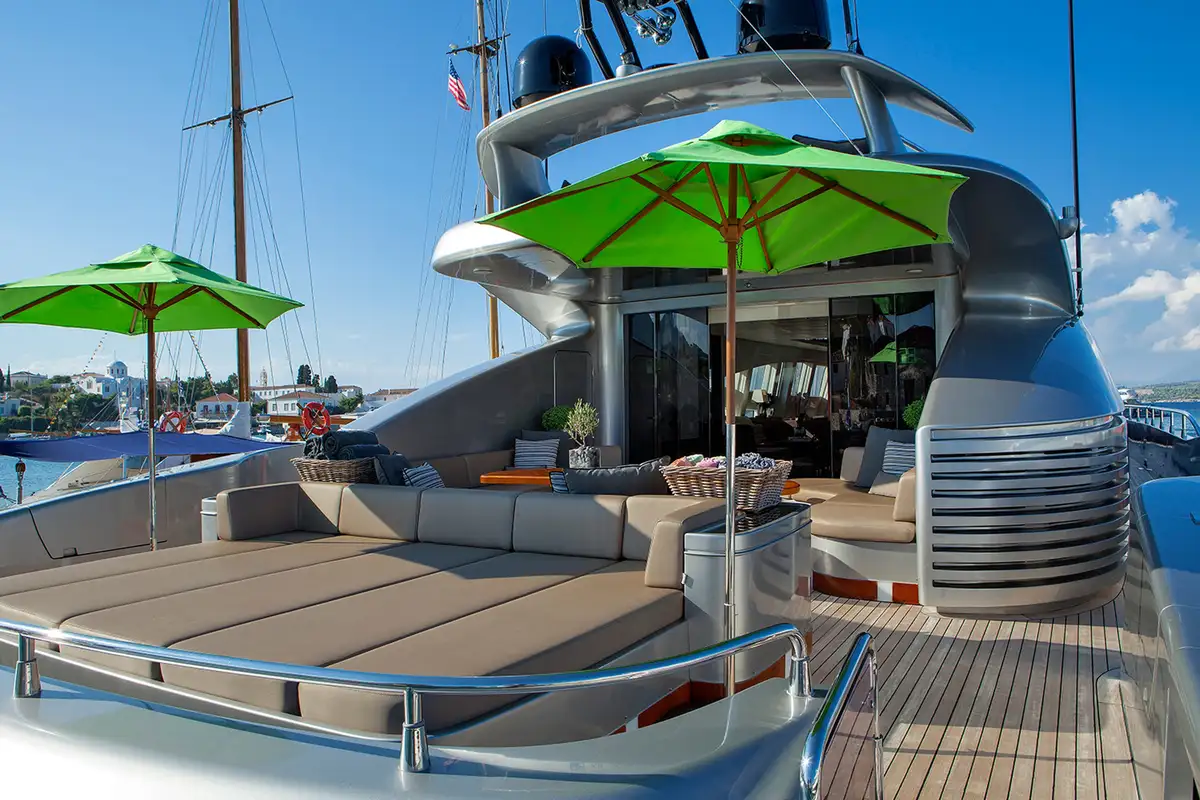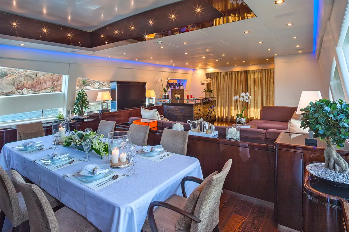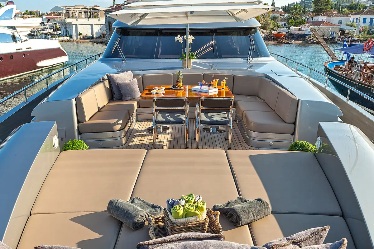 A freshly shaken cocktail awaits at the elegant lounge’s bar, which opens out onto the aft deck through retracting glass doors. On the foredeck, the views of the sun setting across the port will take your breath away, as you share your favourite memories of the day. Then head to the lounge’s dining area, which has a large open sunroof that allows you to dine under the stars while enjoying the comfort and privacy of the interior; this is particularly popular with charter guests when in port. And after dinner, it’s time to hit the local nightlife for dancing before you return to the comfort of MY TOY to rest and repeat the day of fun all over again.