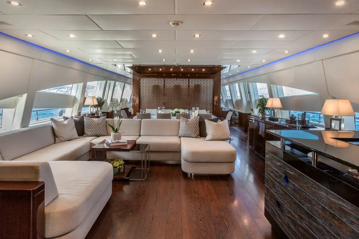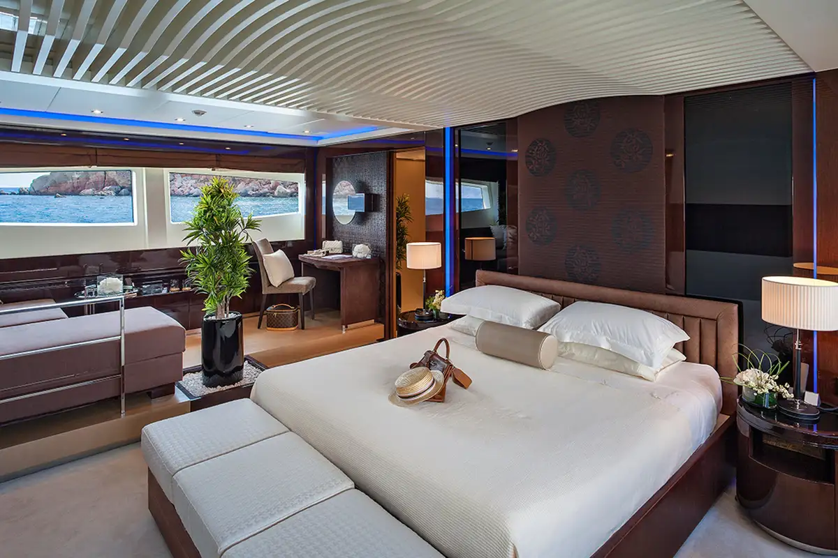 The main deck master suite has a lounging and desk space, allowing for privacy when called for, while the lower deck accommodation includes two VIP suites and two twin cabins, all of which are en suite and feature top entertainment systems.