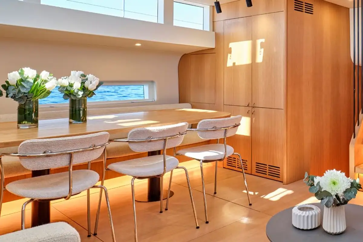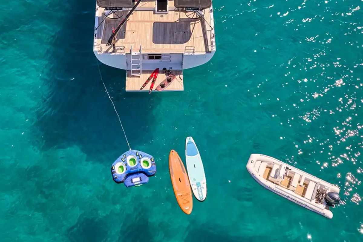 Designed with relaxation and fun in mind, NADAMAS features a spacious sun deck perfect for lounging and socialising, along with a great selection of watertoys for time spent on the water. Her interiors feel bright and open, with a soft colour palette and elegant furnishings that create an inviting, laid-back atmosphere.